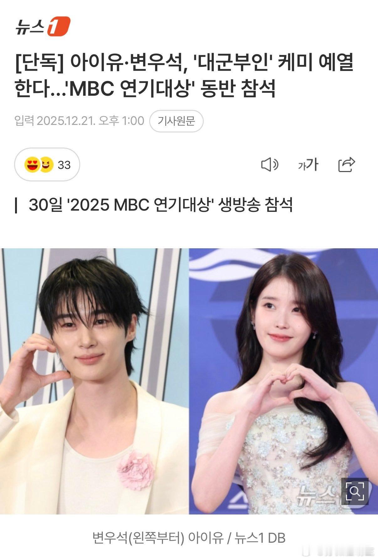 啊啊啊啊啊啊啊啊啊啊啊啊全体起立!!!!IU和边佑硕将出席MBC演技大赏IU 和边佑锡已确定将作为颁奖嘉宾出席2025 MBC演技大赏,颁奖典礼将于30日晚上8点50分进行现场直播。21世纪大君夫人
