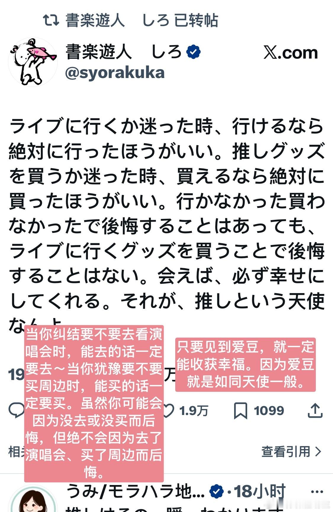 爱你老己~🫶【热推1.9w赞】当你纠结要不要去看演唱会时,能去的话一定要去~当你犹豫要不要买周边时,能买的话一定要买。虽然你可能会因为没去或没买而后悔,但绝不会因为去了演唱会、买了周边而后悔。只要见到爱豆,就一定能收获幸福。因为爱豆就是如同天使一般。