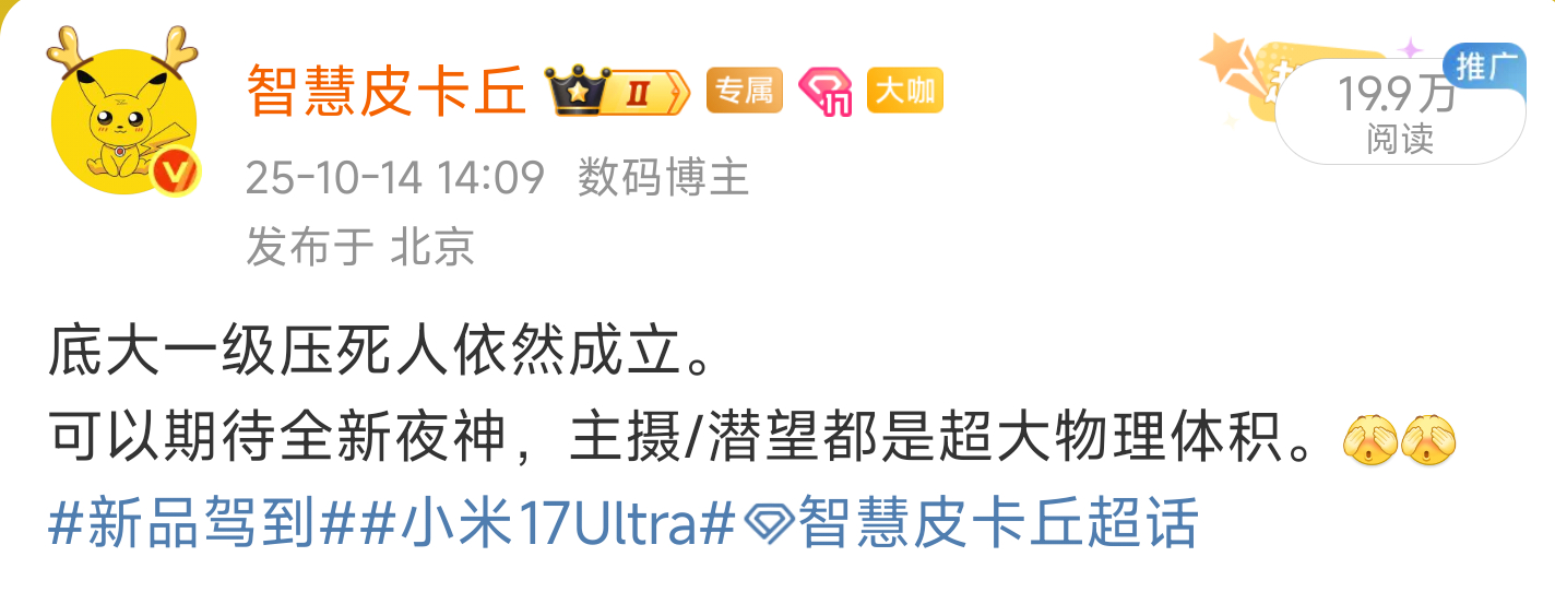 冬至了,大家记得吃饺子。昨晚卢总爆料大家看了吗。和大家透漏过,小米17Ultra依然代号夜神,长焦比上一代体积大35%。真机实拍体验非常好,感光和清晰度都拉满。新品驾到小米17Ultra智慧皮卡丘