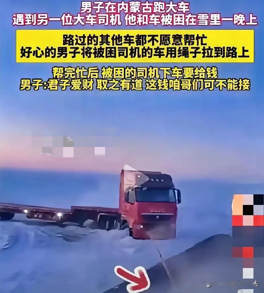 男子在内蒙古跑大车,半路上看到一部大货车困在雪地里,上前一问得知,当时的气温是零下20多度。 这名司机拖的不光是车,主要是救了一个人,一个家庭。他的行为仿佛是严冬暖阳,温暖了泱泱大国人民的心。为这位司机点赞!祝他开车永远顺风,一生幸福平安。 嘿,你知道吗?在内蒙古的风雪路上,就发生了这么一件暖心的事。一个跑大车的男子,半路看到一辆大货车被困在雪地里,司机都冻得不行了。虽说之前也有人路过,但都没人愿意帮忙,可这男子二话不说就上去帮忙。他先是用拖车绳拉车,虽然绳子断了也不放弃,接着铲冰、装防滑链,最后成功把大货车拉了出来。被困司机那叫感激得不行,又是给钱,嘴里不停的说着谢谢二子,帮忙司机却不要钱,说:君子爱财取之有道,还说出门在外互相帮帮忙是应该的。 这事儿就说明白了,跑大车的其实都挺讲情义,他们风里来雪里去,最懂彼此的难处。路上的犹豫很正常,但真碰上这种事,能帮一把就帮一把,因为有时候,你的一点善意,就能给人带来绝处逢生的希望,也能让这冰冷的路途多一份温暖和信任。 往后再遇到这样的场景,希望更多人能停下脚步,你的一次伸手可能就是别人的绝境逢生的希望。