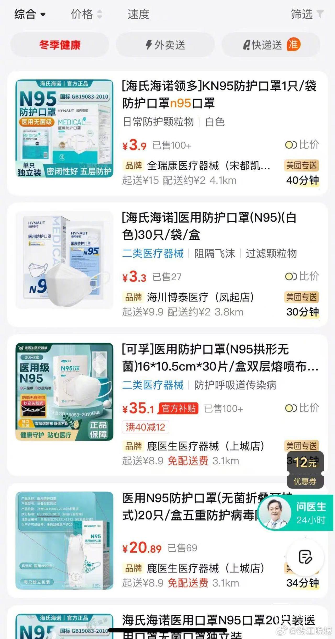 【#杭州部分药店口罩卖断货# 空气质量已重回优良】 昨天,受冷空气带来的输入性污染影响,浙中北的空气质量变差,杭州、绍兴等地短时间内达到了重度污染(此前相关报道)。好在,今天的雨水大大缓解了雾霾影响,截至今天10时,浙江大部分城市的空气质量指数重回优良。虽然雾霾持续时间不长,但也引起了大家对空气质量的关注,不少人前往药店采购口罩,记者走访发现,有部分门店甚至出现了卖断货的情况。上午9点多,记者来到杭州市上城区普德路一家药店,恰巧碰到专门来采购口罩的市民陈先生。“家里的口罩用完了,这两天看到出现了空气污染,官方都发布预警了,所以赶紧过来买一些。”陈先生告诉记者,每到秋冬季,自己家里都会常备一些口罩,以应对流感和雾霾天,“家里有老人和小孩,抵抗力比较差,出门戴上口罩更放心一些。”记者注意到,这家药店的货架上摆放的基本都是一次性医用口罩且余量不多,“最近口罩卖得比较好,除了雾霾之外,这段时间流感也高发,大家对口罩的需求比较大。”药店店员说。距此不远的另一家药店里,货架上已经见不到口罩的影子。“口罩断货有几天了,最近卖得比较快,基本上来货没多久就卖完了。”药师黄女士有些歉意地向前来购买的消费者说,“明后天应该会来货,到时候可以再过来看看。”随后,记者又走访了拱墅区建国北路上的两家药店。虽然这两家药店都有口罩销售,但能买到的均为普通一次性医用口罩,至于防范雾霾中PM2.5能力更强的N95口罩,暂时都没货。“因为雾霾比较严重,前两天刚卖完了,下次来货要到下周四或周六。”其中一家药店的店员告诉记者。相比线下门店,线上购买N95口罩会方便许多。在一些外卖平台的“看病买药”专区搜索“N95口罩”,可以看到不少门店仍有货在售,每只口罩的价格从1至5元不等。线上下单后,会有骑手配送到家。值得关注的是,在线上平台,有“液体口罩”之称的鼻喷剂最近也销售火爆。据商家介绍,只要喷一喷,“液体口罩”就能在鼻腔形成保护屏障,阻隔病毒高达99.9%。不过,记者在走访中发现,目前线下药店基本都没有销售这种“液体口罩”,“从来没卖过,还是第一次听到。”一家药店负责人表示,她对这种“喷一喷”就能起到防护效果的“液体口罩”保持怀疑态度。据媒体报道,“液体口罩”效果存疑,没有经过临床验证,预防效果到底如何目前还没有相关研究数据支持,其保护效果仅在实验室里“有效”,这与真实复杂的人体环境相差甚远。杭州市疾病预防控制中心提醒,规范佩戴口罩,需正确选择在日常生活中空气污染环境下滤除颗粒物所需的防护性口罩,口罩符合GB/T32610-2016标准。根据空气污染情况选用适宜的口罩佩戴。佩戴前,检查口罩包装是否完好无损,并对外观进行检查,根据使用方法正确佩戴。佩戴防护型口罩应及时更换,不建议长期使用。佩戴过程中如出现不适或不良反应,建议停止使用。(潮新闻 记者 黄玉环)