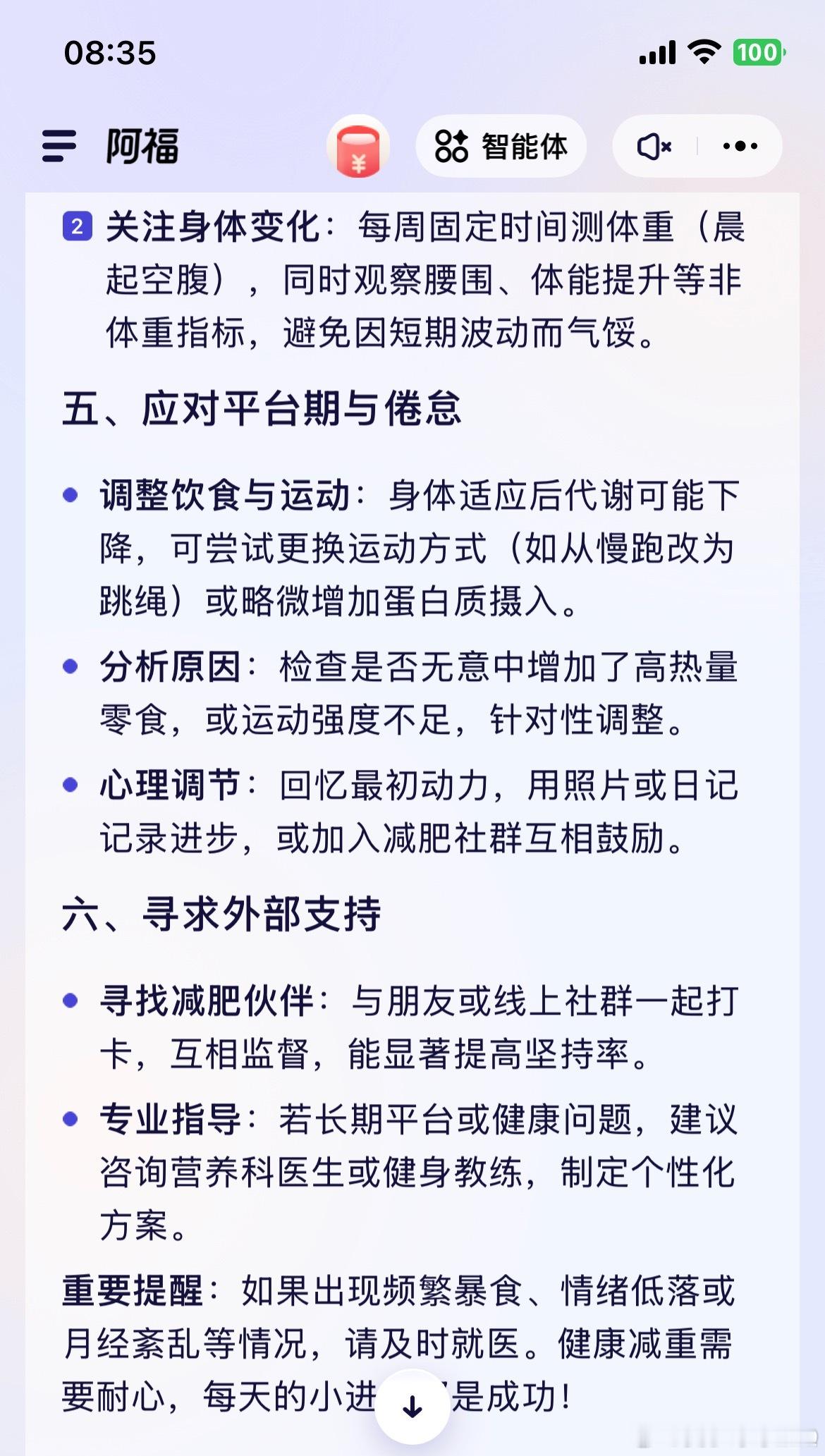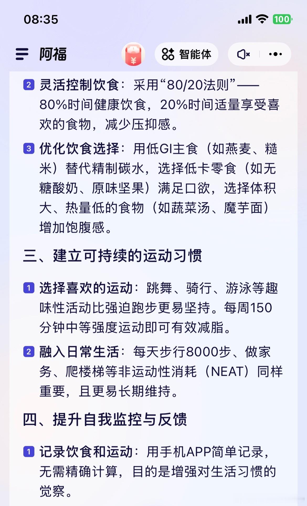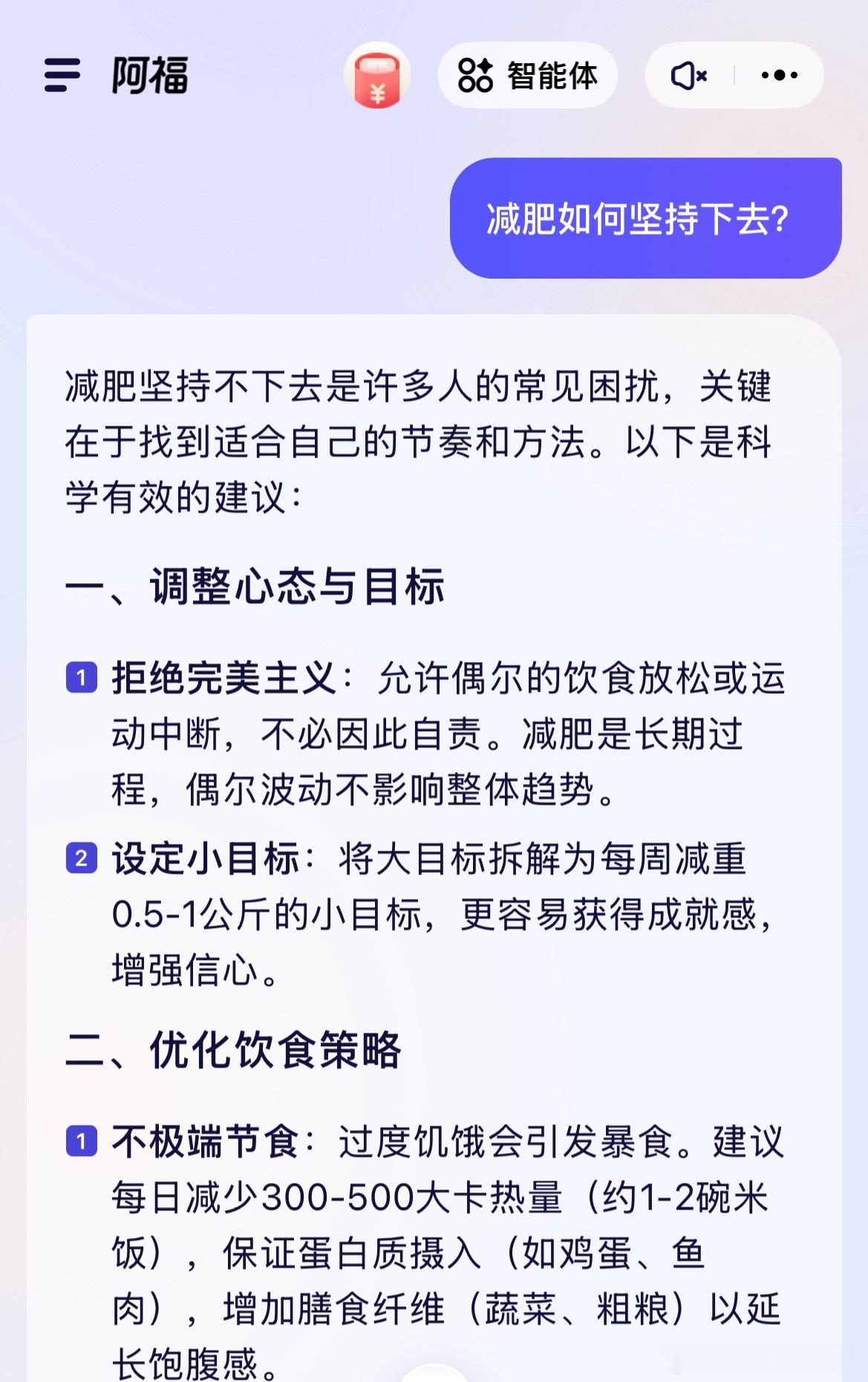 这个减肥搭子我是真的想要在现实中想找个减肥搭子简直太难了,除了时间冲突就是坚持不下去……偶然间发现了一个宝藏app:蚂蚁阿福。 它真的是太智能了,可以说只有你想不到的,没有它答不出来的,关于减肥、饮食健康等问题,它能给出非常专业的回答,还能与你的智能设备绑定,全面监测你的运动、睡眠等一系列健康指数。体验最棒的就是可以把你吃的饭拍照给它,它会识别这是什么饭,并且给出各种数据和建议,对于上班族、外卖党来说真的太友好了。有一说一,这样的减肥搭子打着灯笼都难找,我已经彻底喜欢上它了。