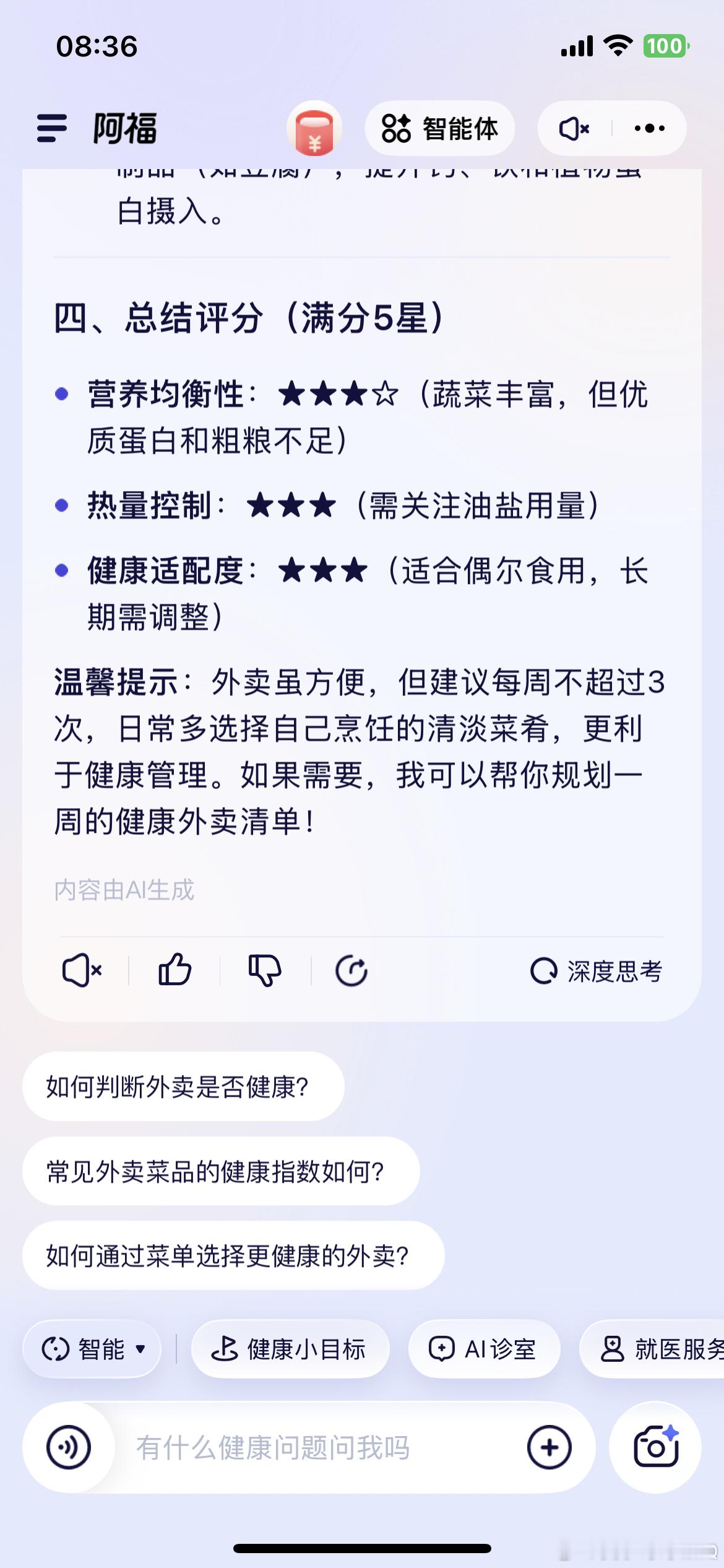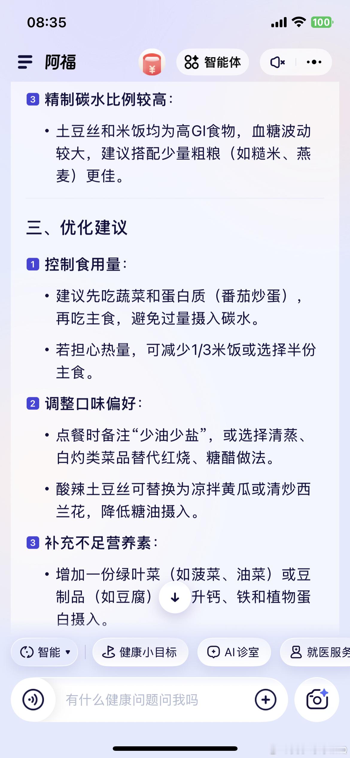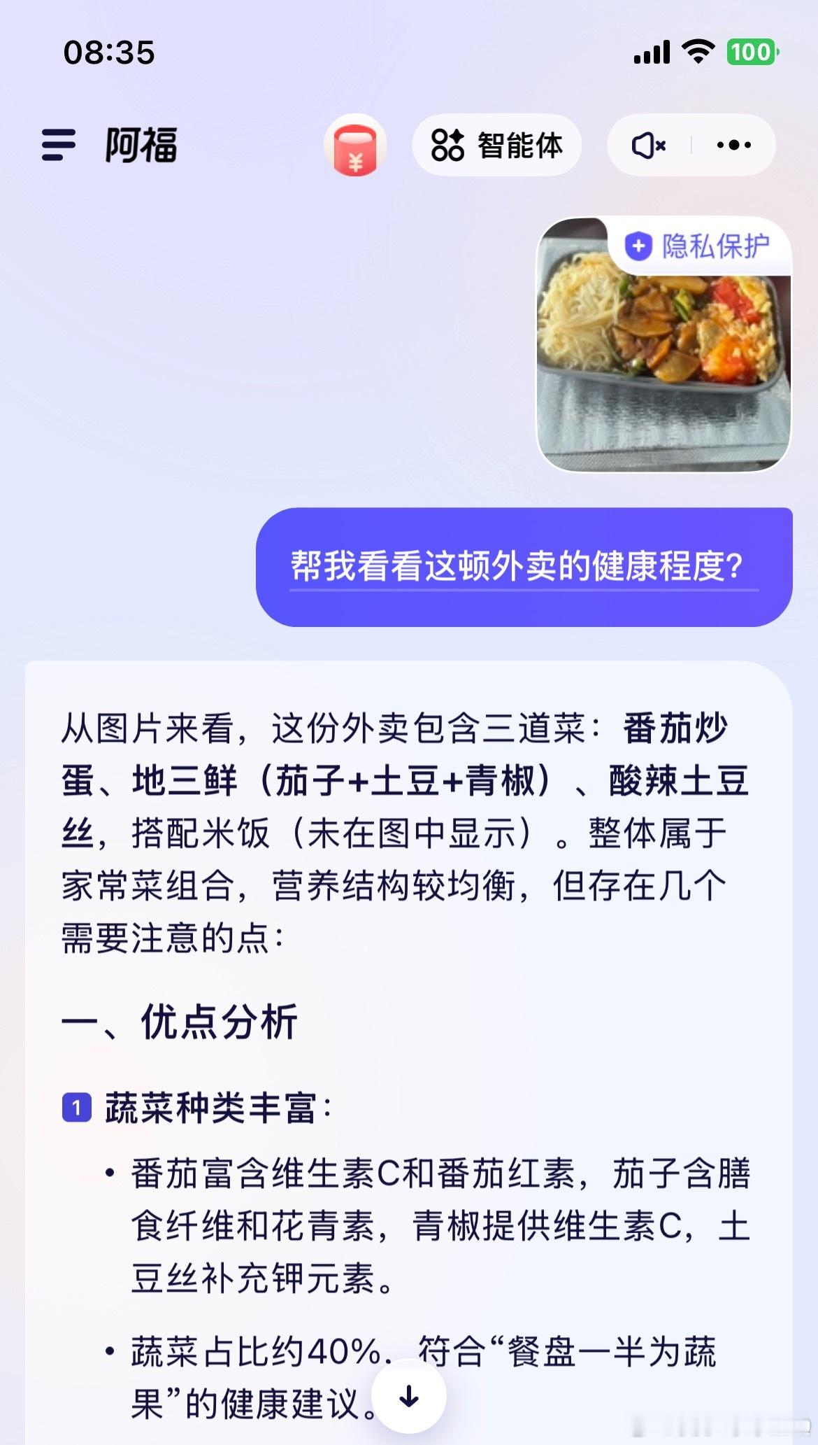 这个减肥搭子我是真的想要在现实中想找个减肥搭子简直太难了,除了时间冲突就是坚持不下去……偶然间发现了一个宝藏app:蚂蚁阿福。 它真的是太智能了,可以说只有你想不到的,没有它答不出来的,关于减肥、饮食健康等问题,它能给出非常专业的回答,还能与你的智能设备绑定,全面监测你的运动、睡眠等一系列健康指数。体验最棒的就是可以把你吃的饭拍照给它,它会识别这是什么饭,并且给出各种数据和建议,对于上班族、外卖党来说真的太友好了。有一说一,这样的减肥搭子打着灯笼都难找,我已经彻底喜欢上它了。