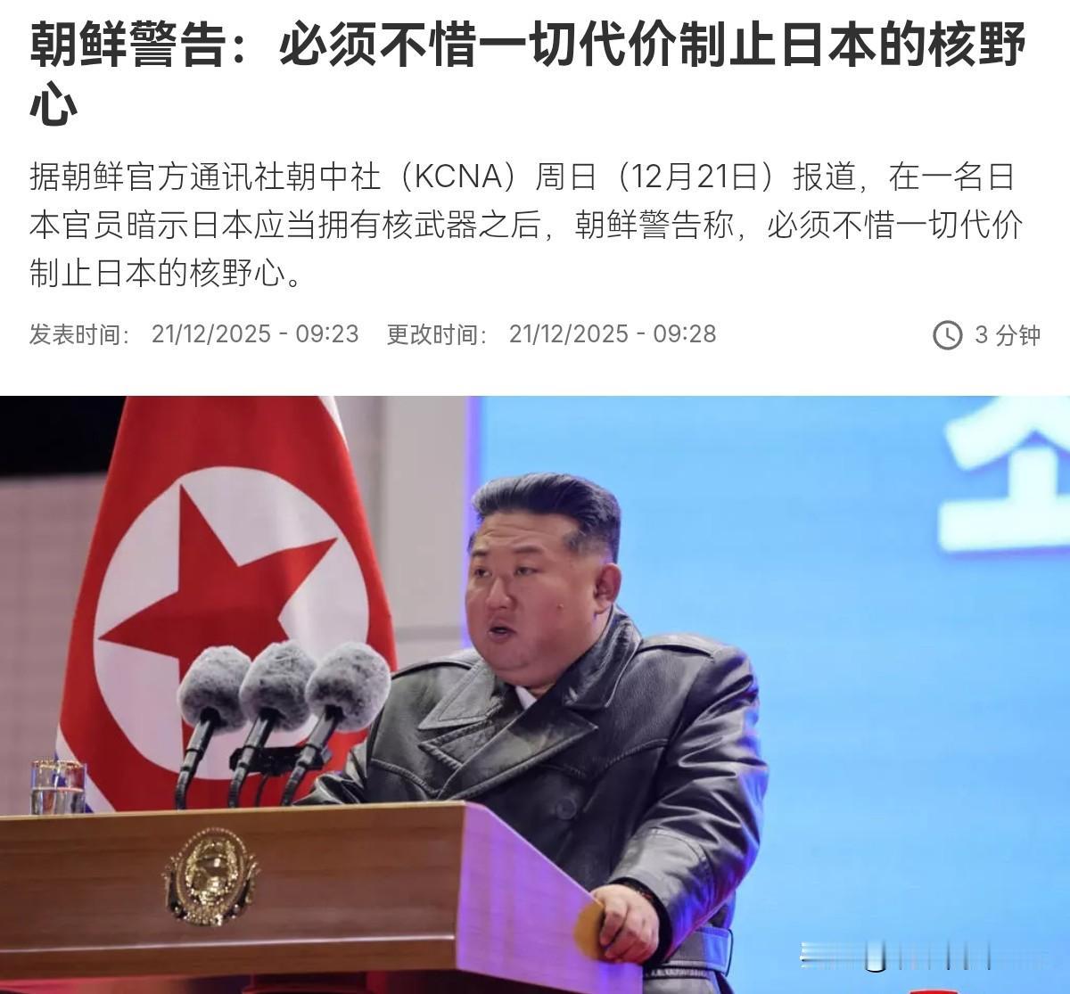 高市早苗声称希望构建新型日朝关系,愿在任何时间、任何形式与朝方会面,结果朝鲜方面在得知日本展现拥核意图之后,对日本来了一次毫不留情面的输出!12月21日,朝鲜外交部相关人员表示,日本的这些言论表明东京公开暴露了其企图拥有核武器的野心,已经越过了红线。 这既不是口误,也不是轻率之言,而是清楚地反映了日本长期以来追求核武装的野心。如果日本拥有核武器,亚洲国家将遭受一场可怕的核灾难,人类也将面临一场巨大的灾难。必须不惜一切代价制止日本的核野心。很显然,高市早苗要进行外交表演,声称要与朝鲜改善关系。 结果呢?结果是朝鲜非常不留情面的戳穿日本国内的一些说法“这既不是口误,也不是轻率之言”,这就是明明白白的告诉日本,朝鲜对日本没有丝毫的信任,现在根本不是谈如何改善日韩关系的时候,而是日本的野心让朝鲜感到非常警惕。高市早苗就不要自作多情了,朝鲜可没功夫配合日本进行外交表演。 很显然,朝鲜把话无疑说的极重,一句已经越过了红线,必须不惜一切代价制止日本的核野心,这弄不好接下来朝鲜会针对日本做军事动作,对日本进行震慑。并且,需要提醒日本的是朝鲜是拥核国家,朝鲜视日本为千年宿敌。面对日本的野心,朝鲜恐怕不仅仅对日本的警告只是停留在口头上。