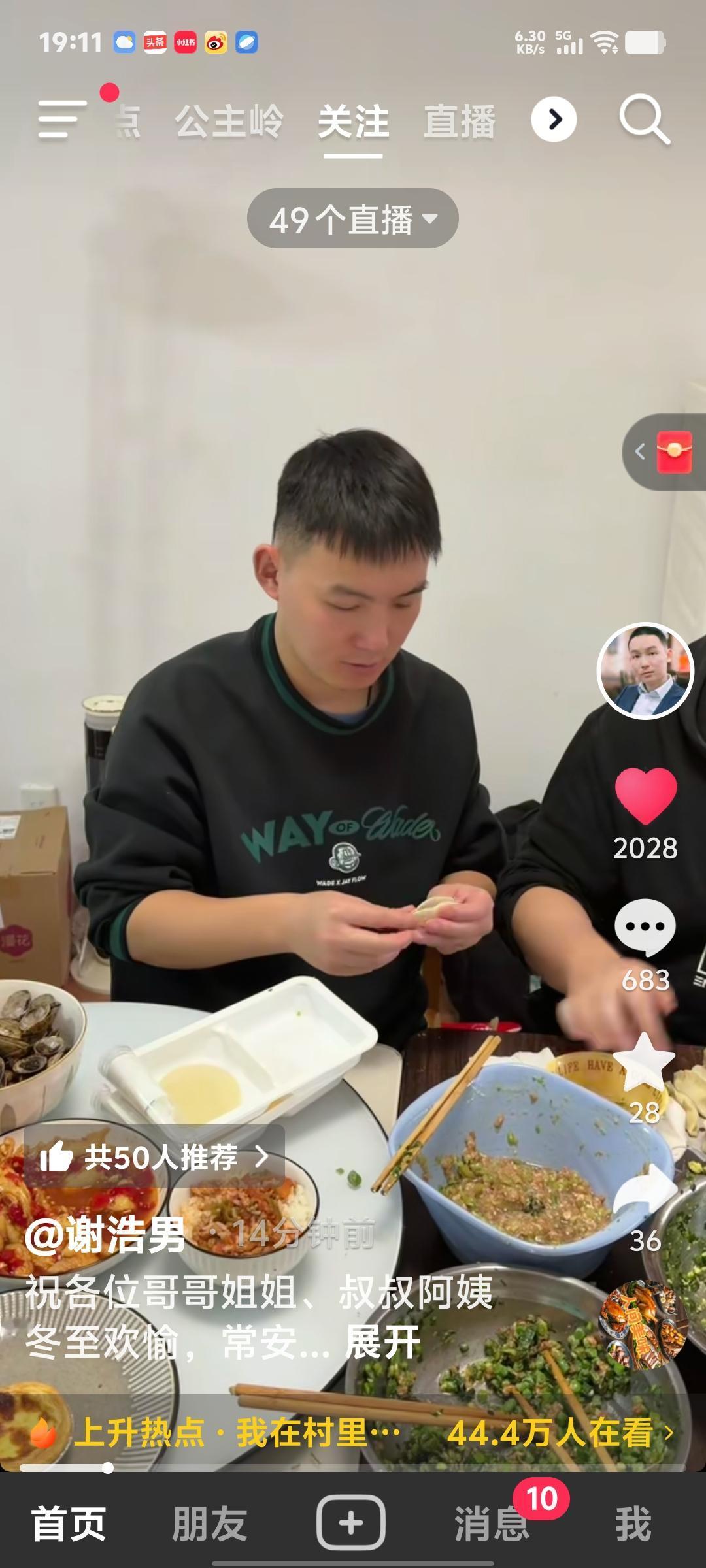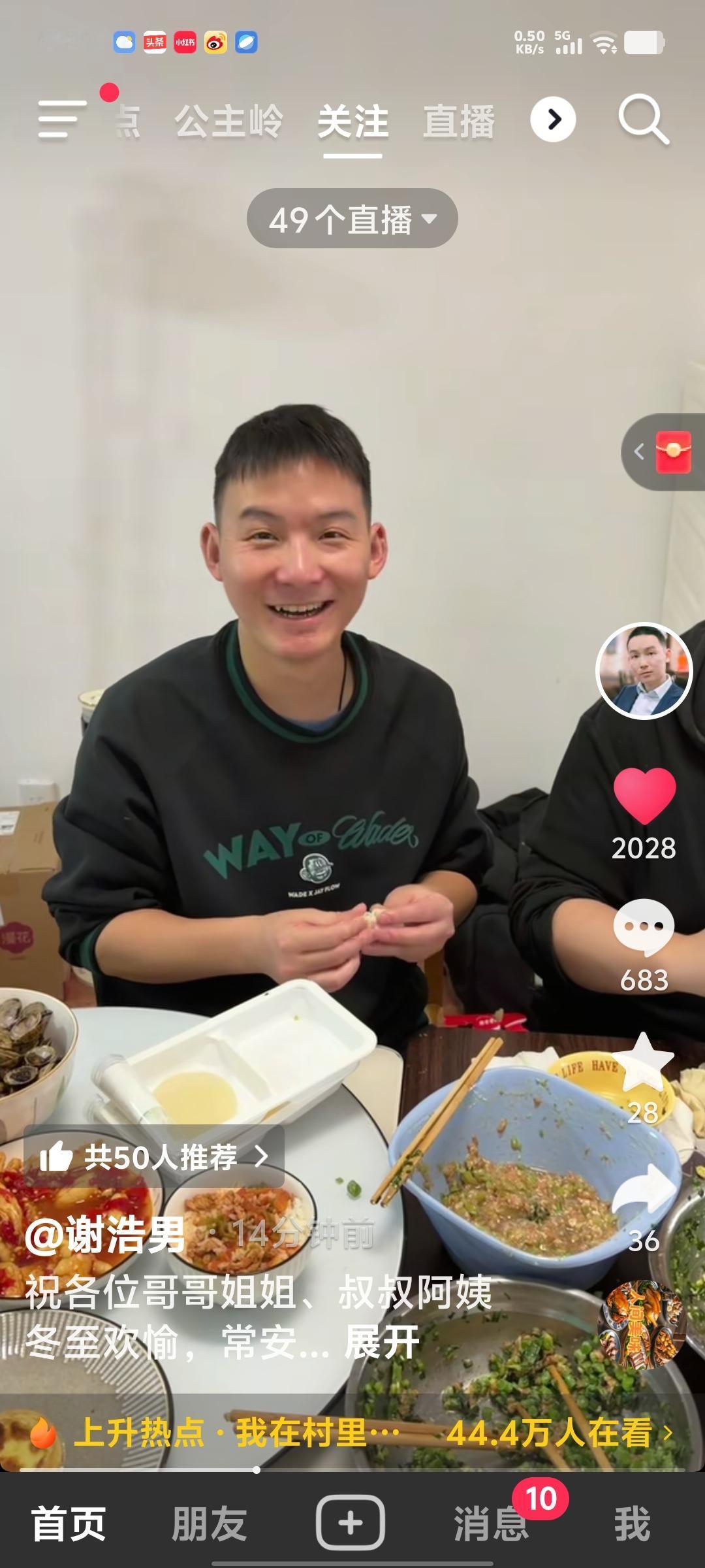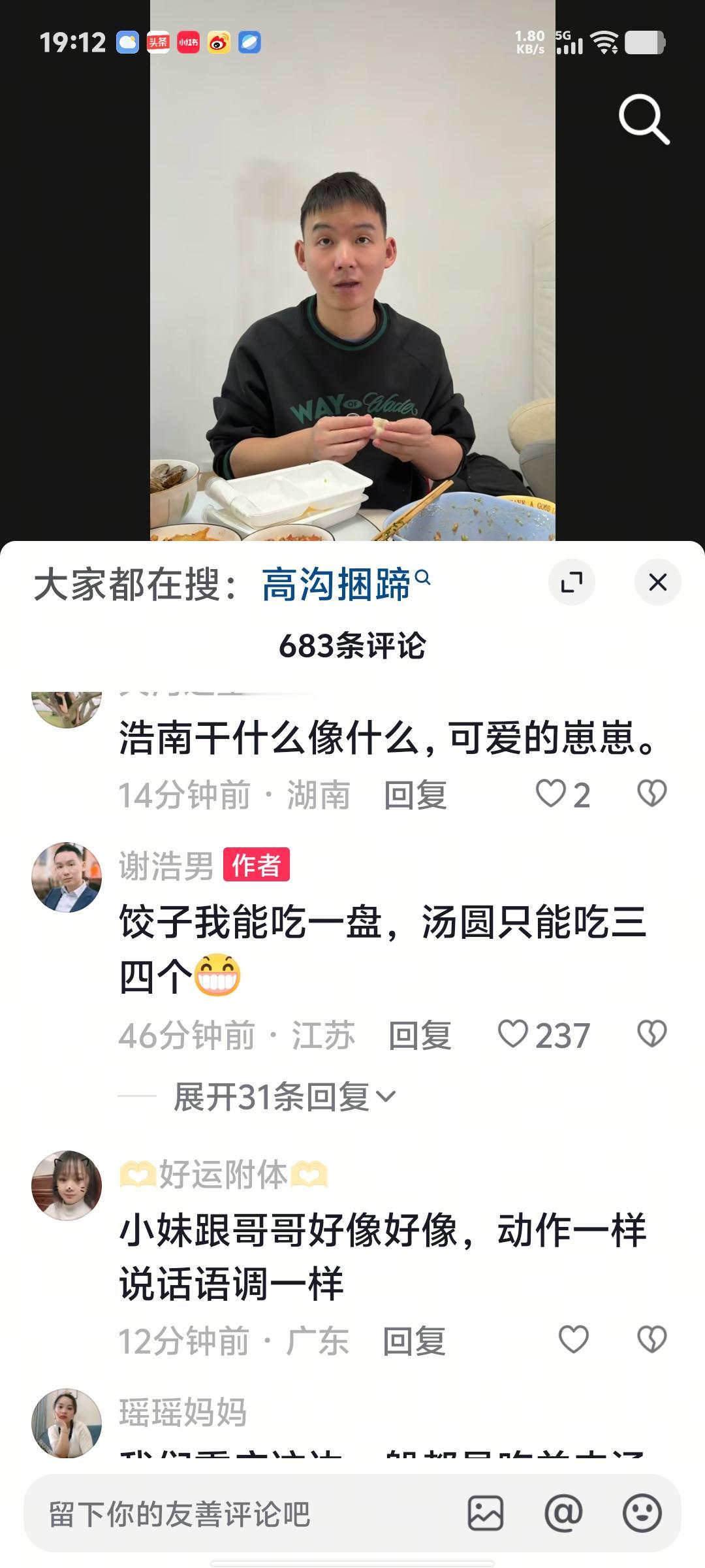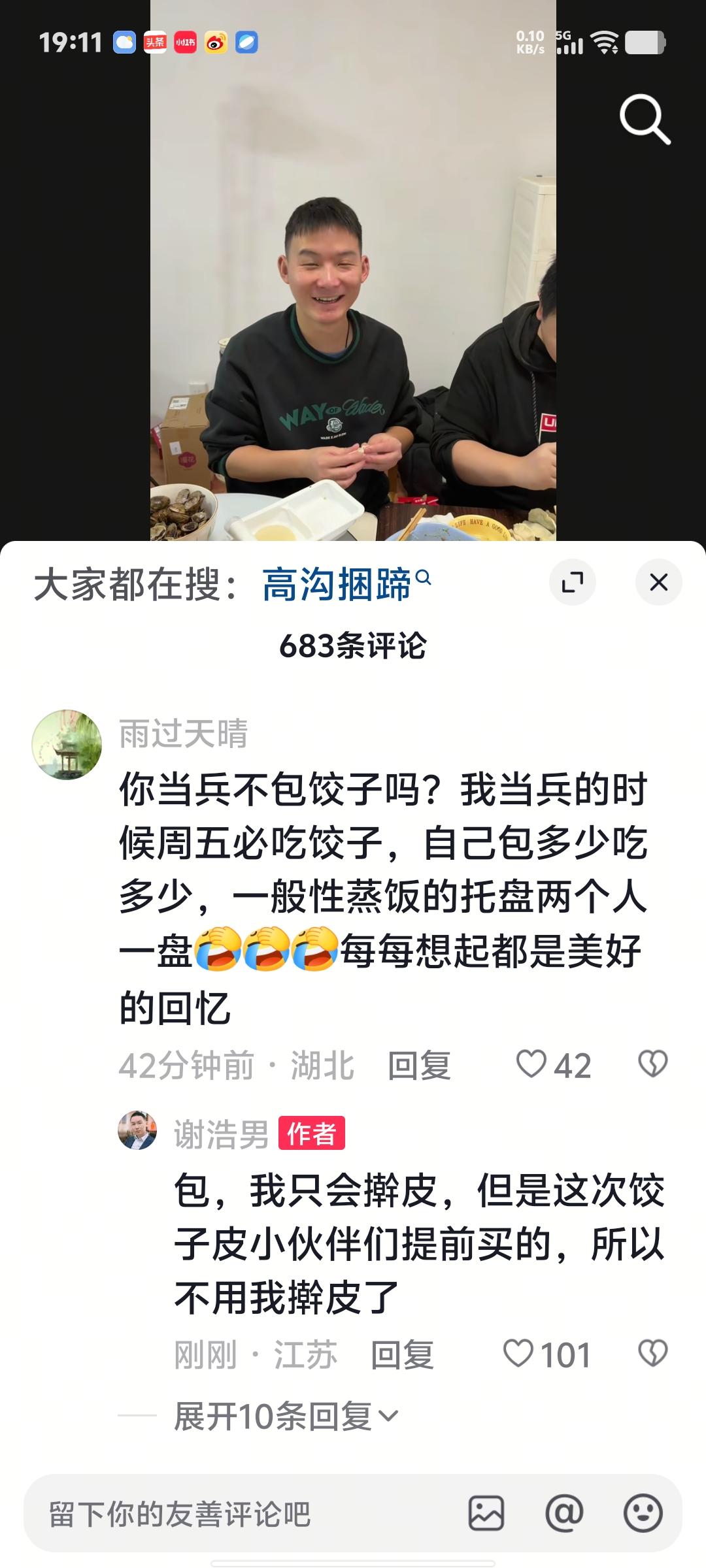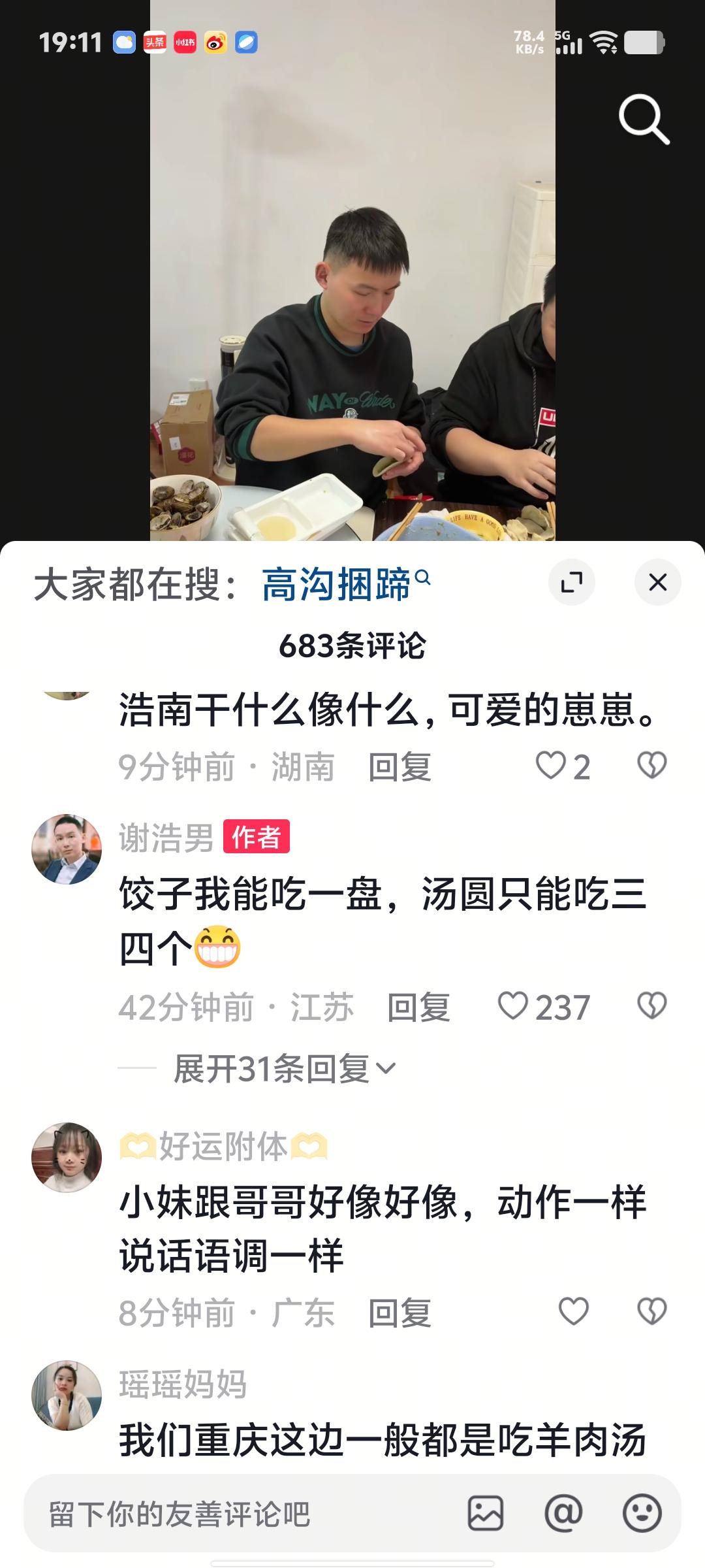 谢浩楠冬至和小姐姐一起包饺子。网友问,是不是交女朋友了?浩南赶紧澄清。只是同学,女朋友还没有进展。 浩楠在学校里。今天和好多同学,朋友一起过节。大家买了现成的饺子皮。 切肉和馅一气合成。开始包饺子。浩南笨拙的捏好了一个饺子,凑到镜头前求表扬 坐在对面的同学夸他两句。浩南乐的眉开眼笑。因为是小姐姐的声音。声音还挺甜美的。 再结合浩南以前说想脱单,网友开始大胆猜测。结果是乌龙一场。浩南这个脱单计划,还没有进展呢。 浩楠说自己以前在部队也经常包饺子,但他是负责擀皮的。所以不太会包。 评论区的网友山南海北开始晒。冬至的美食。有吃饺子的,有吃汤圆的,还有吃烤全羊的。真是一个充满美味的评论区。 大家也都叮嘱浩楠多吃点。还有人猜测老谢今晚会开直播。上次浩楠过生日。老谢也给儿子准备了很多惊喜。 浩南也大大方方的表示。爸爸妈妈都对自己很好。虽然爸爸这面是重组家庭,但只要爸爸和妈妈都过得幸福就好。