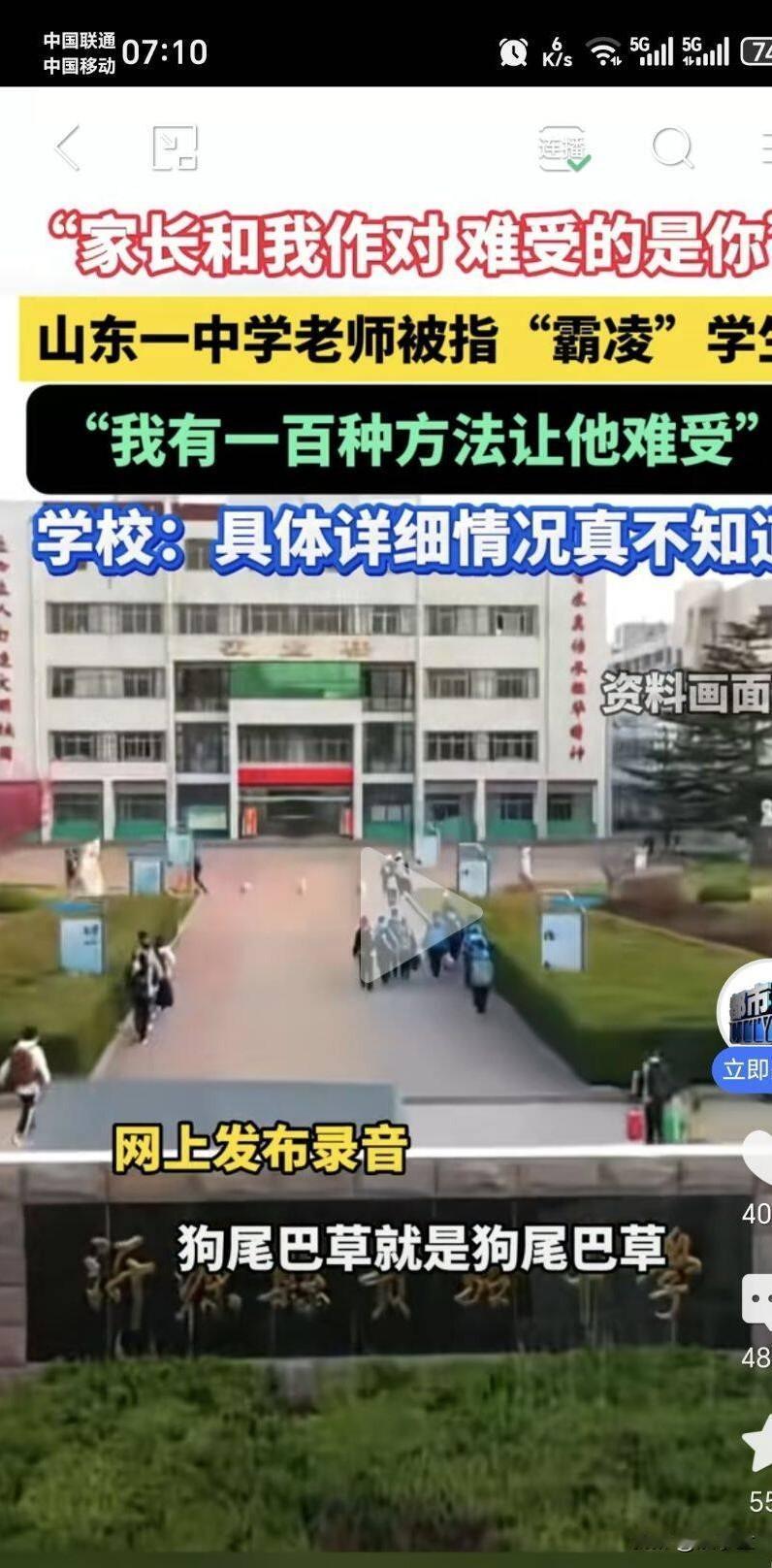 霸气!“家长和我作对难受的是你”,山东一中学老师被指责霸凌学生!发出这样的声音! 他还“大言不惭“说出一句话“我有一百种方法让他难受”! 具体情况不清楚,如果是教师真的霸凌学生,那家长举报无可厚非!这个老师感觉也蛮狂的!他能说出这种话,证明他也不把家长放在眼里,而且态度拔高了自己的位置! 我记得小时候,家长和老师关系都很好,至少都是一致对外,那时候我们如果在学校被老师骂,或者不听话被老师罚!回去后父母会继续揍我们! 现在不知道怎么了,家长和老师矛盾有时候这么大!