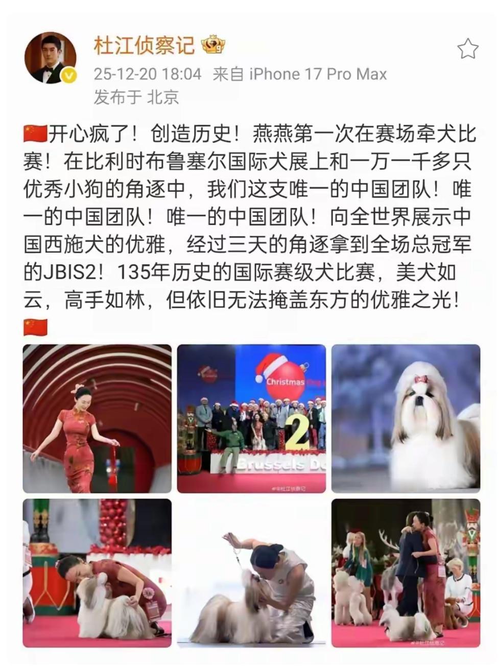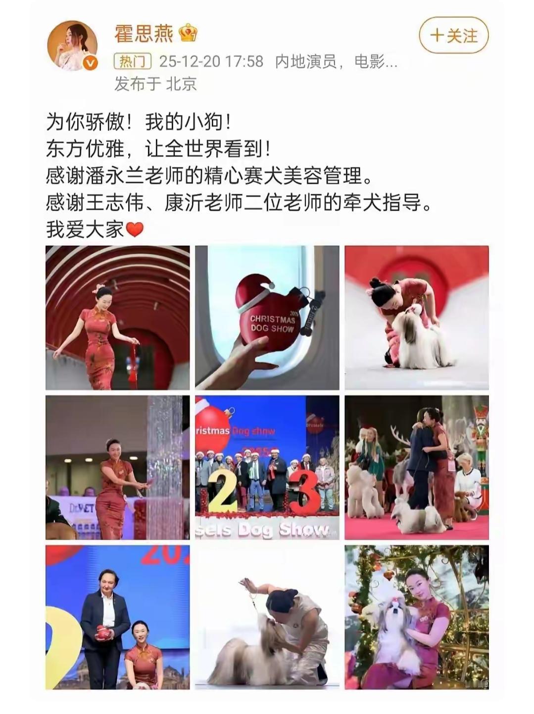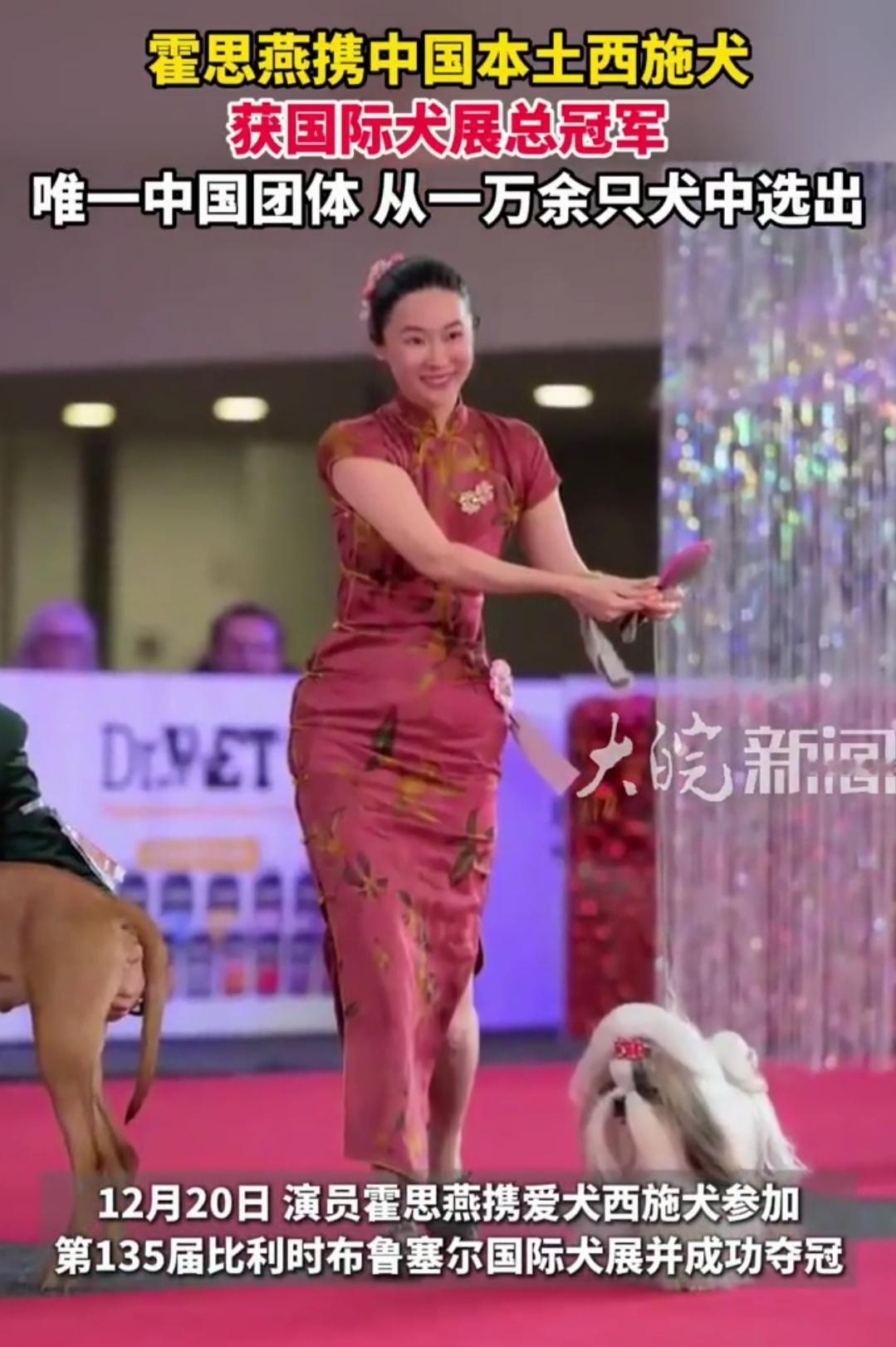 退圈12年杀回热搜!霍思燕带中国犬拿下国际冠军,太给国人长脸 谁能想到!退圈12年的霍思燕,不靠影视剧不靠综艺,再次火遍全网!12月20日,45岁的她直接冲上热搜,凭的就是在比利时布鲁塞尔国际犬展上的亮眼战绩。 这场有着135年历史的“犬界奥运会”,历来是西方犬种的天下。霍思燕带着自家西施犬“霍香香”出征,不仅是第一次当牵犬师,更是本届赛事唯一的中国团队。没想到西施犬直接开挂,先拿下品类冠军,接着在全球11020只参赛犬里杀出血路,一举夺下全场总冠军!这波操作,简直是给中国本土犬种狠狠长了脸。 要知道,西施犬本就是咱们中国的原生犬种,这次夺冠可不是简单的宠物比赛胜利,更是国犬文化走向国际的高光时刻。霍思燕用实力证明,咱们的本土犬一点不输洋犬! 你还知道哪些被低估的中国原生犬种?快来评论区聊聊![比心][比心][比心]