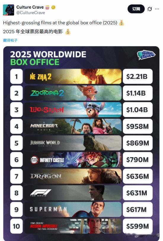 最新数据来了!2025年全球最卖座电影排行榜出炉,看看前五名: 1️⃣哪吒2 - 22.1亿美元 🇨🇳 2️⃣疯狂动物城2 - 11.4亿美元 3️⃣星际宝贝史迪奇 - 10.4亿美元 4️⃣我的世界电影版 - 9.58亿美元 5️⃣侏罗纪世界续集 - 8.69亿美元 咱们中国的《哪吒2》太给力了,直接冲到世界第一,全球票房夺冠,160亿收入震惊好莱坞!还记得六年前第一部哪吒拿下50亿人民币,已经让全世界惊讶。现在第二部直接冲向国际,让全球影迷都认识了这个脚踩风火轮的中国少年。 现在咱们的中国故事、中国动画真的走出去了!从孙悟空到哪吒,这些我们从小听到大的神话人物,现在成了世界级的明星。 不得不感叹,中国动画这些年的进步太大了。制作精良、故事感人,加上深厚的文化底蕴,想不火都难!《哪吒2》 不仅是部好电影,更是体现了我们中国文化的自信。你看过这部动画吗?你觉得它最吸引我们的是什么?一起来聊聊吧。 哪吒2票房第一 国产动画崛起