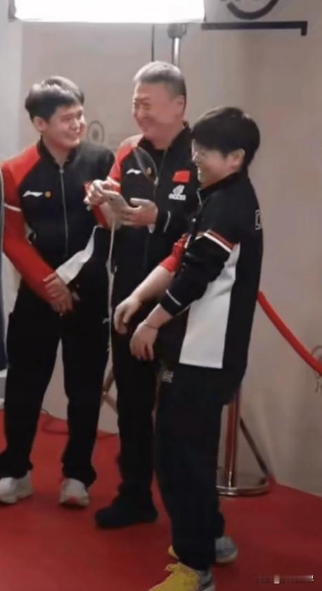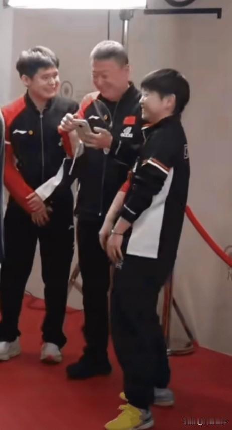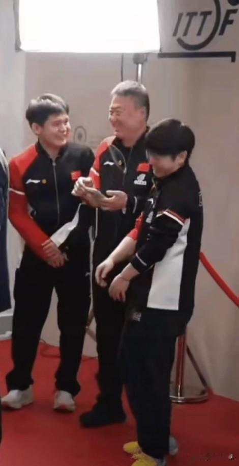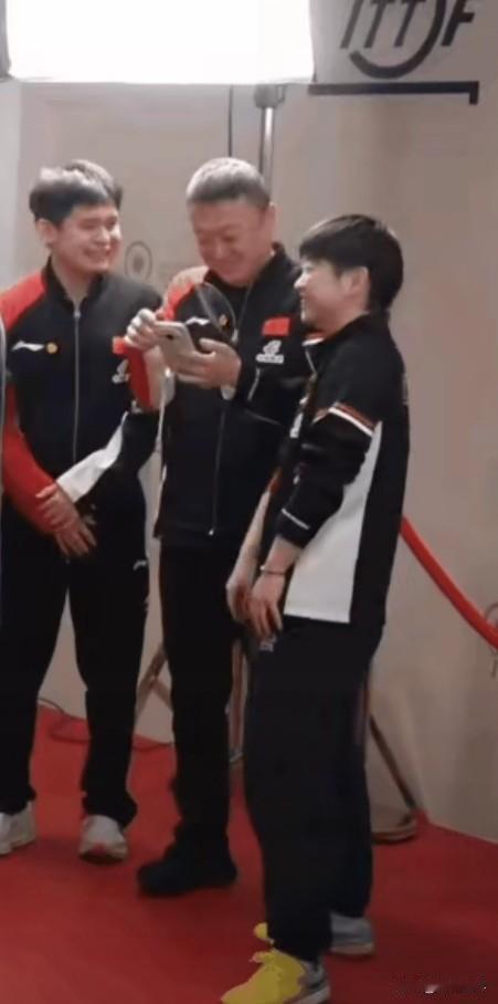 他们三个 ,究竟是谁给谁逗笑的。关键是两个不爱笑的人,笑得如此开怀,那个莎宝竟笑得手舞足蹈起来。应该是马指导的手机,不知是哪个爱耍的发了个帖子,他看一眼控制不住地大笑起来,他的笑感染了身边的小石头,好事的莎宝忍不住地靠前,然后就笑成了这样。频繁连续的赛事,给大家带来紧张和压力,教练和队员一起放松放松,也挺好。就是不苟言笑的马指导,让粉丝第一次见到他幽默滑趣的另一面。