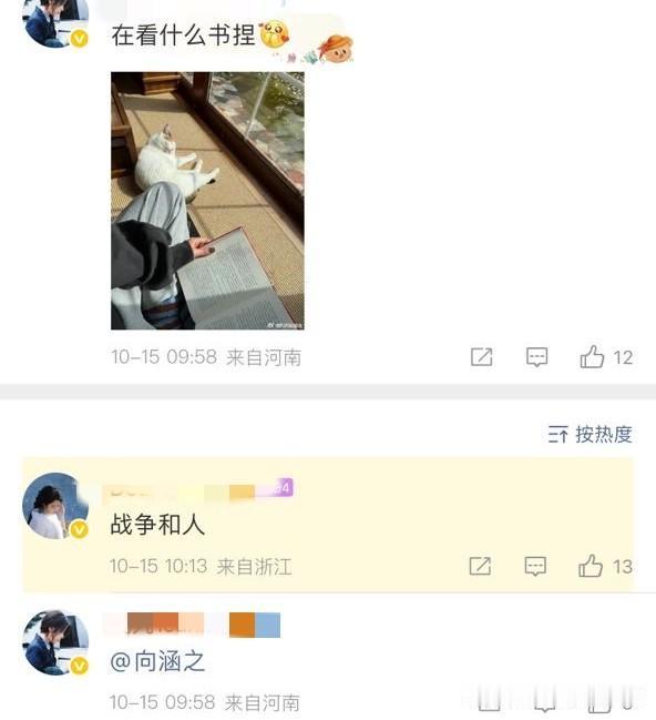 张挺是真的好爱朱亚文啊! 虽然不能每一部都请他做男主,但是每一部都要拍到他。 下一部「战争和人」,主创还没官宣,张挺已经把特出朱亚文官宣了。[呲牙][呲牙] 朱亚文肯定也不会拒绝,比较之前和导演的两次合作,都让他收获颇丰。 巧的是,向涵之之前也晒出过自己看「战争和人」这本小说的微博。 要是张导能把向涵之也弄进这个剧组,那嗑李成白依梅的观众应该会很开心~(^◇^)/。