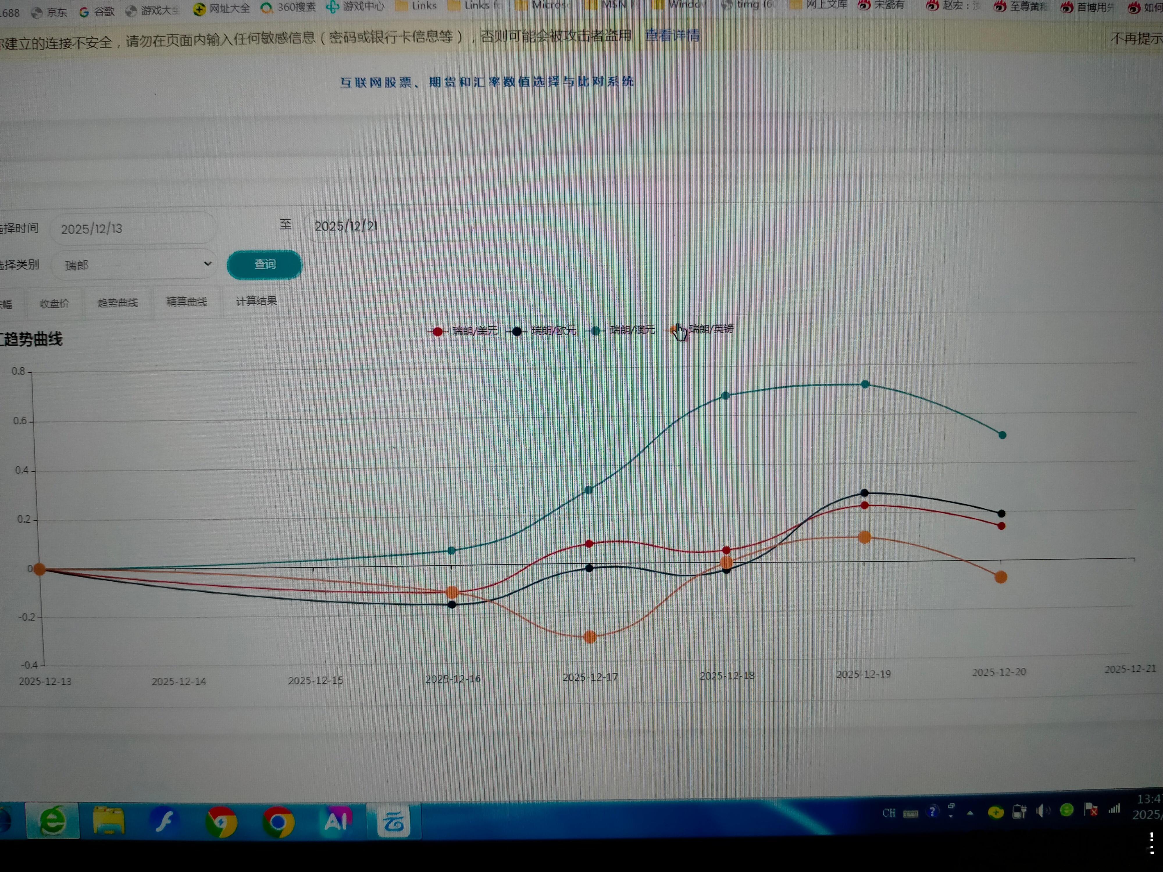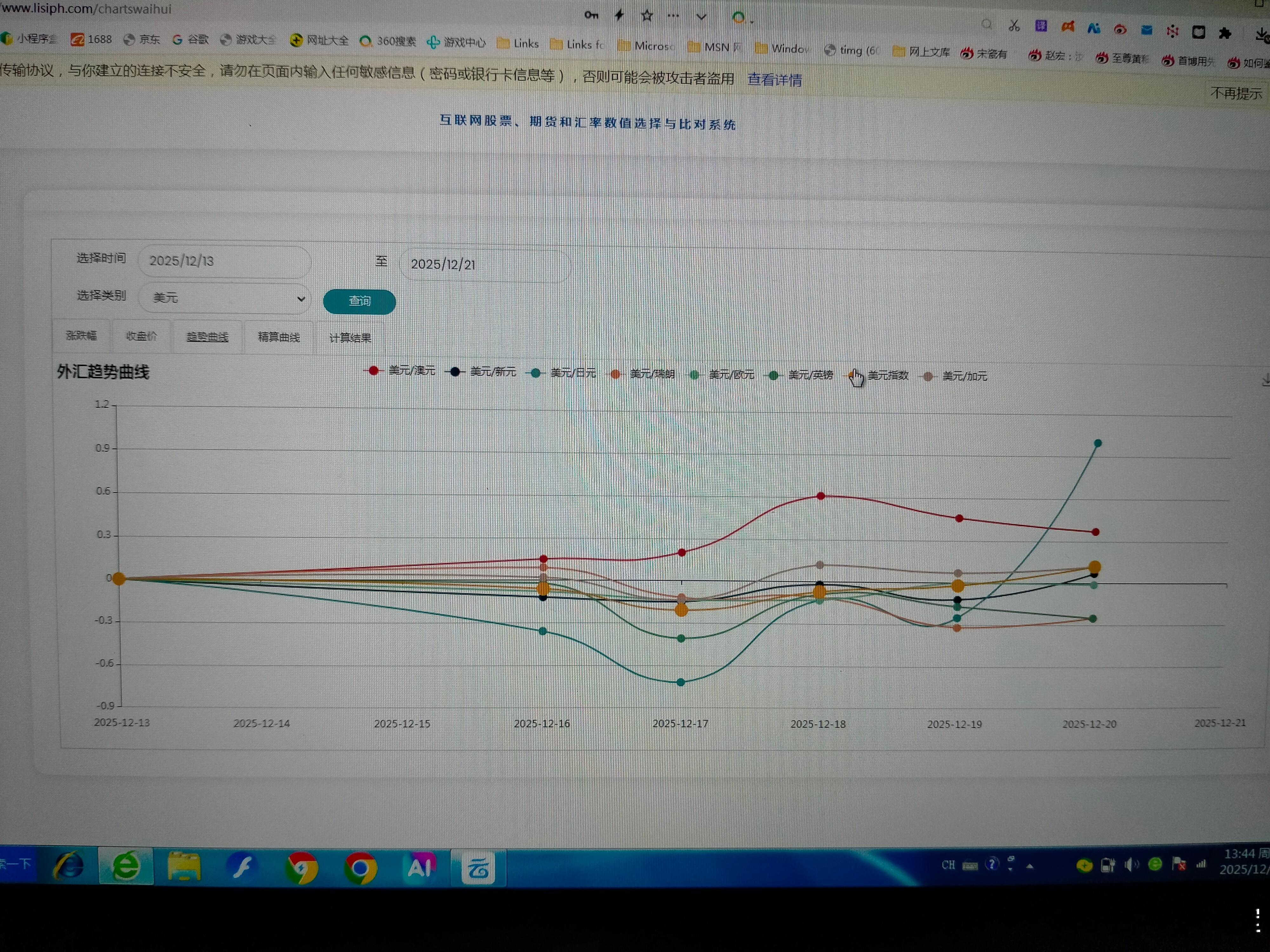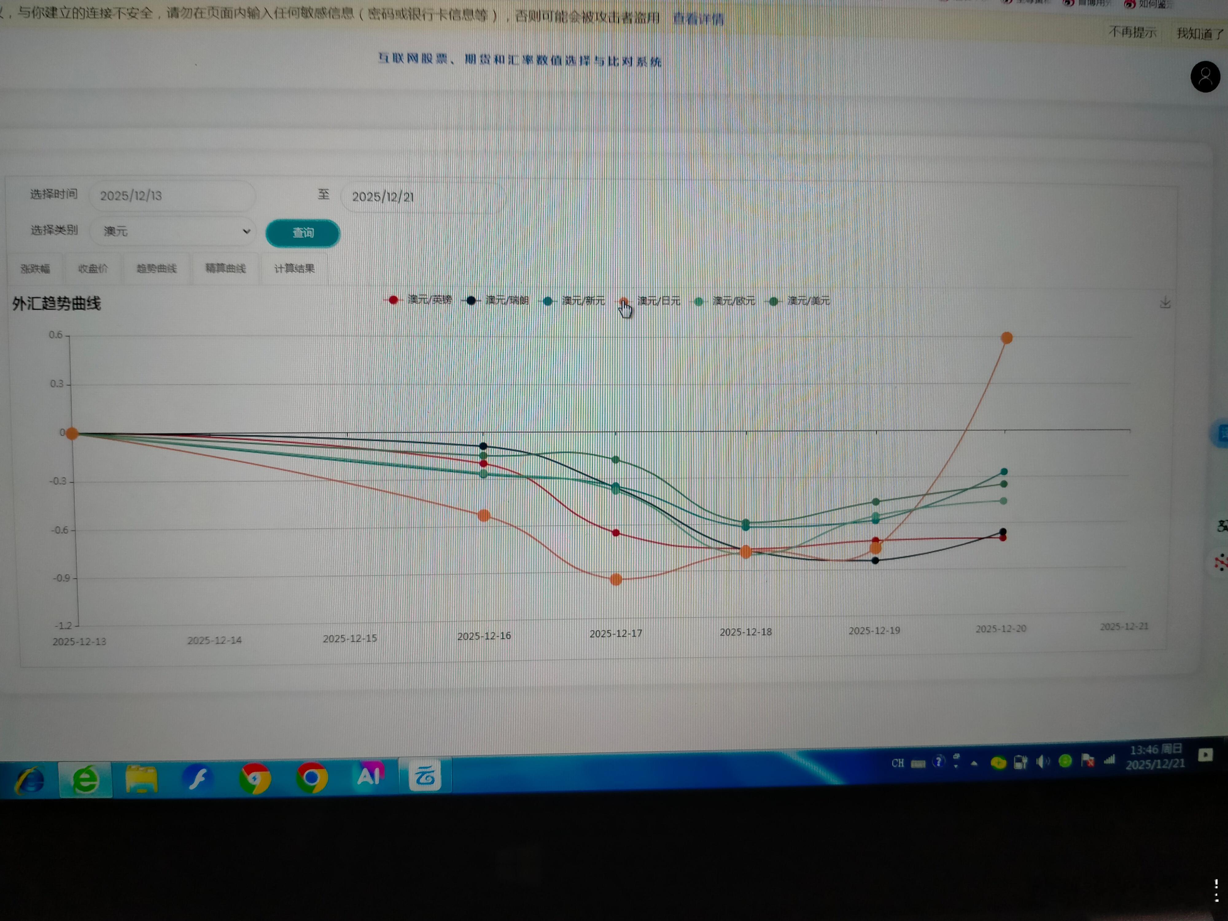 本周主要汇率走势 本周英镑和瑞郎最强,日元最弱。美元指数比上周收盘小幅上涨。 图一是美元本周的涨跌幅曲线,涨多跌少,但都是小涨小跌,所以,本周涨幅有限,图二是趋势曲线,除了兑日元涨幅大一点外,兑其他几个主要币种都是小涨小跌。看看美元是不是启稳了吧? 图三是澳元本周的趋势曲线,澳元本周比较弱,除了兑日元上涨外,兑其他几个主要币种都是下跌的,估计下周会延续一下吧? 图四是欧元本周的趋势曲线,图五是英镑本周的趋势曲线,图六是瑞郎本周的趋势曲线。英镑和瑞郎本周继续比较强,从本币角度看,相互间都是下跌的,估计差不多该转换了吧?特别是瑞郎,强势也延续了一段时间了。只是不知道是美元,还是欧元接强势的棒? 图七是兑日元的趋势曲线,日元继续走弱。 图八是兑加元的趋势曲线,加元也比较弱。 图九是正向和反向态势图,日元在低位区域,估计不敢接吧?美元也基本上在低位区域,如果启稳了,还是比日元强吧?