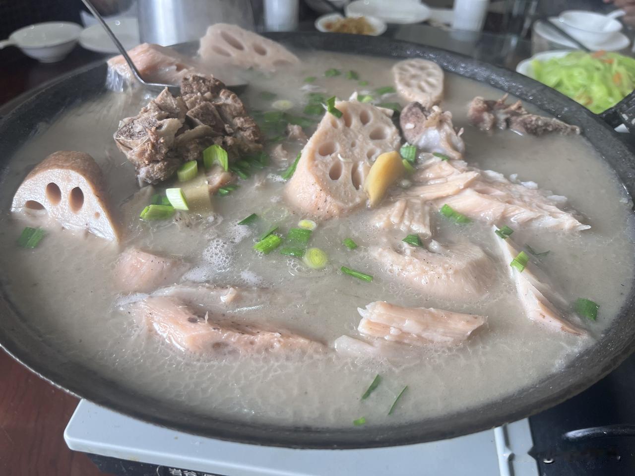 今天吃到个绝了的藕汤锅,必须跟大伙唠唠!锅里的藕是粉糯的洪湖藕,炖得轻轻一抿就化,吸满了骨汤的鲜味儿。 还有大块的筒骨,肉炖得脱骨,啃着超过瘾,居然还加了三文鱼骨,鲜味儿直接翻番! 奶白的汤喝一口暖到心窝,撒上葱花更提香,一群人围着锅边吃边聊,热热闹闹的,这味儿真的太地道了,感觉冬天的快乐都被这一锅承包了! 洪湖粉藕排骨汤