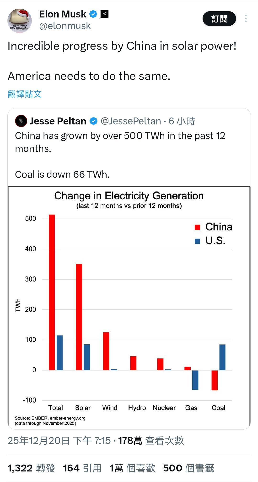 万万没想到,中国真的提前做到了! 预计2025年化石能源发电实现“零增长”的目标,我们非但做到了,而且提前实现了“负增长”——过去12个月煤电发电量下降了66 TWh,取而代之的是以太阳能、风电为主的可再生能源爆发式增长。 同一时期,美国的电力增长依然依赖化石能源,煤电甚至增长约50 TWh。都这年头了,实在让人困惑。 这反差让我想起个问题:美国“创新大国”的光环,多大程度是靠百年来各国人才输血撑起来的?若没有这持续的外脑注入,它在面对能源转型这种需要魄力与系统变革的大事时,是否骨子里更像个路径依赖的守成者? 而我们,似乎正走出一条不一样的路。 Source: X