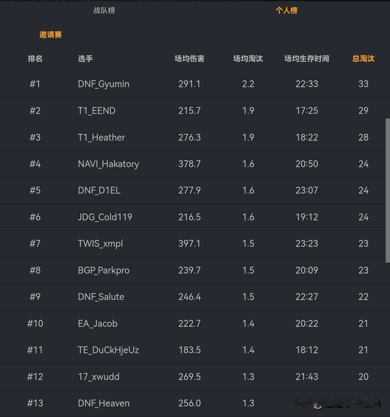 本土夺冠! PPMI大师邀请赛(TPP)模式三天比赛结束! DNF第一、T1第二、TWIS第三、17第四 JDG第七、PeRo倒数第二、4AM倒数第一 目前来看韩国赛区队伍对tpp模式适应还是快的,本次比赛第一、第二都是韩国赛区的 17又一次拿到PCL赛区的最好名次,这还是让了一个小北的情况下,目前PCL的唯一排面毋庸置疑,还得是老十七啊 4AM连续两个赛事排名倒数第一,多少有点折磨心态,明年这个阵容肯定是不能用了,觉得还是把幻神叫回来打打吧!