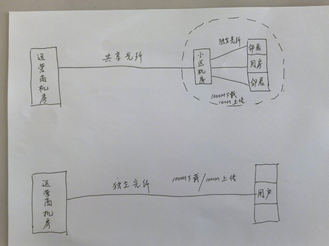 近日,“独享千兆光纤”的说法火爆,太多网友邀请我科普,还有记者采访我。“独享”这个词是有歧义的,它分为两种情况。一是用户侧独享,就是灵魂画作的上半部分。【请不要嘲讽字体,我靠这一手烂字在高校写板书近20年,也教出了不少人才,关键在于知识正确】用户侧独享,指的是你跟小区机房之间是独立光纤,保证你有1000M下载速率和100M上传速率,而且不跟邻居共享光纤。但小区机房将你和邻居的信息汇总后,在与运营商机房建链时,采用的是共享光纤。如果是在高峰期,就会降速、高延时、甚至丢包。你肯定会想,干线上还是共享,那用户侧独享有个屁用,这不是忽悠人吗?这还真不是忽悠人,以前用户侧不独享时,几个邻居共用一条光纤,拥塞的几率更大的多。用户侧独享后,在干线上共享,就符合了泊松分布,拥塞率就降低了。往细里说,这是爱尔兰分布和恩格谢特分布的区别,这是经典的话务理论,老汉我当年就是教这个的,不要跟我抬杠。二是真正的干线独享,即灵魂画作的下面。从运营商机房直接拉一条光纤到用户,保证任何时刻的1000M下载和1000M上传,保证时延低于某数值,保证丢包率低于某数值,而且会签订服务合同,如果达不到标准就得赔钱。根据我对上海电信的了解,用户侧独享的宽带服务,月费用大约200元。干线独立的宽带服务,月费用20000元起步。二者费用差距百倍以上。这场风波出站后,有记者采访我,我很笃定地说,罗老师的网络一定是月费用200元左右的用户侧独享光纤入户,而绝不会是干线独享。为什么呢?如果签订服务细节合同的干线独享出现不足百兆的情况,运营商按照合同就得赔钱赔损失了。当然了,用户侧独享也得保证服务质量,例如工信部要求光纤入户端测速要能达到标称的90%,但户内因路由器设置和复杂布局导致的速率下降,就是另外一码事了。国家那么大,我不可能全都了解,但核心城市的网络服务情况,我还是心里有谱的。专业的事,得听专业人士的,别抬杠。