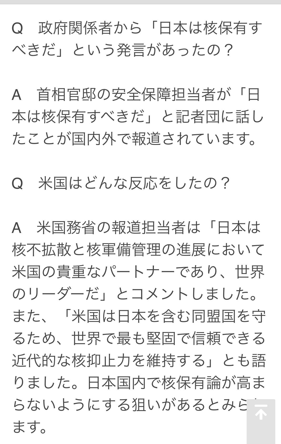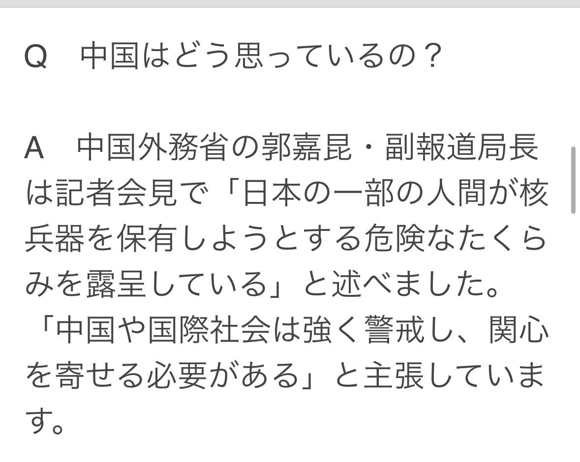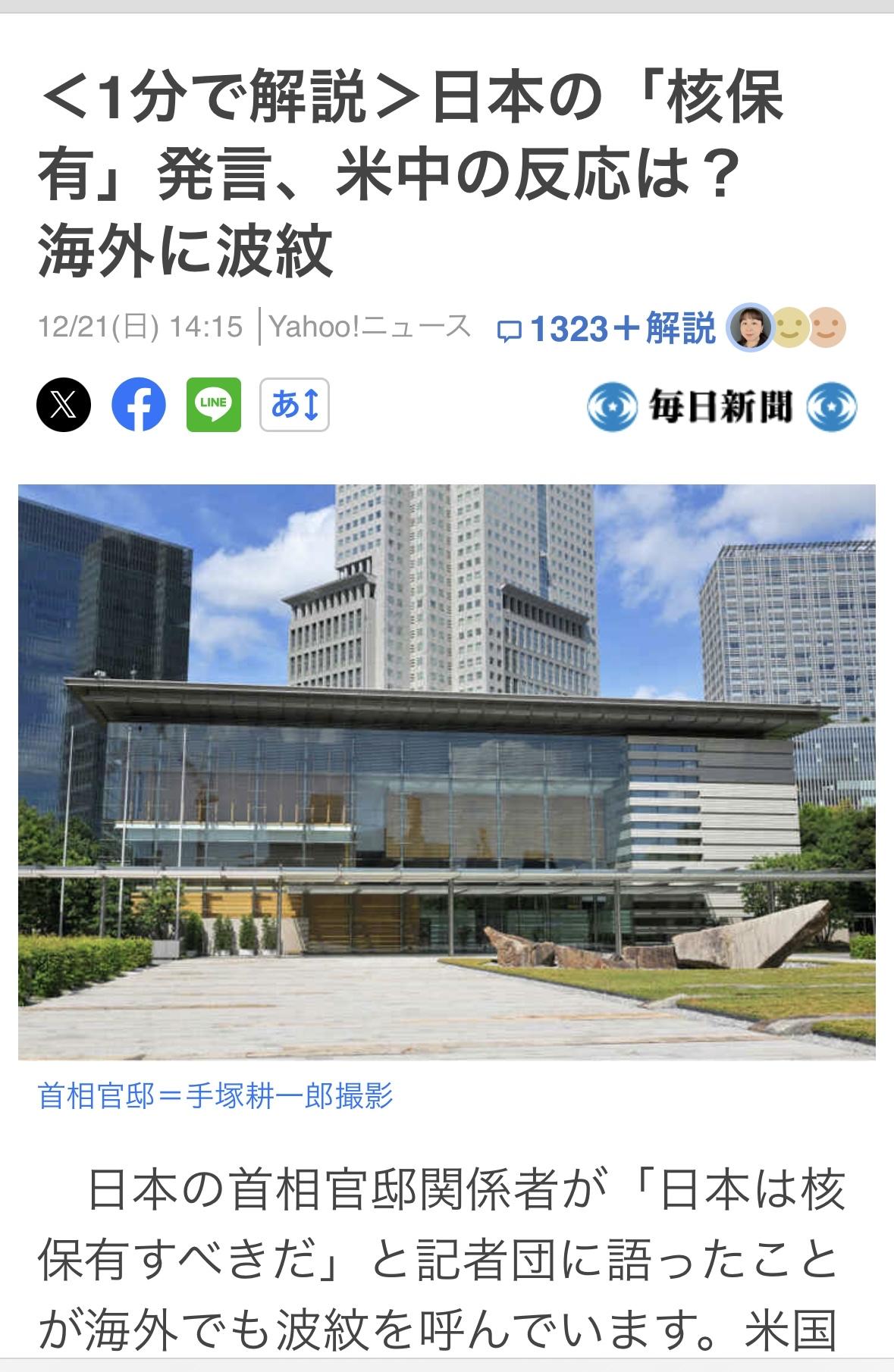 日本官员近日对记者表示:日本应该拥有核武器。此番言论在海外引起轩然大波。 美国国务院发言人表示:日本是美国在推进核不扩散和核军控方面的重要伙伴和全球领导者。美国将维持世界上最强大、最可靠、最现代化的核威慑力量,以保护包括日本在内的盟友。 中国外交部发言人表示:这暴露了日本某些人企图获取核武器的危险阴谋,中国和国际社会需要高度警惕,密切关注事态发展。