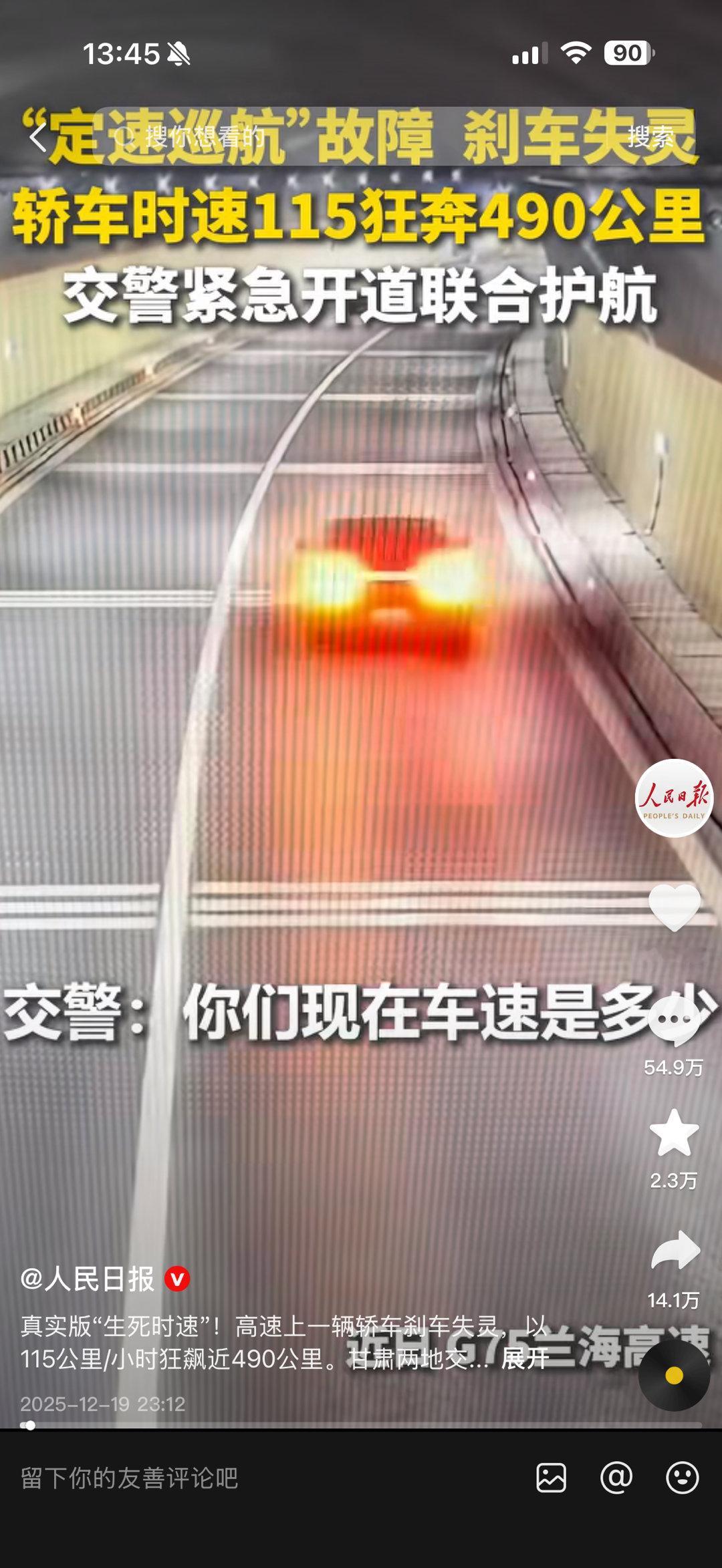 又出现这种定速巡航解除不了,同时刹车失灵的案例。暂且不说这两种极端情况同时发生的概率,就是以115km/h的速度连续跑490km,有这么畅通没有龟速车阻挡的路况我就不太信。