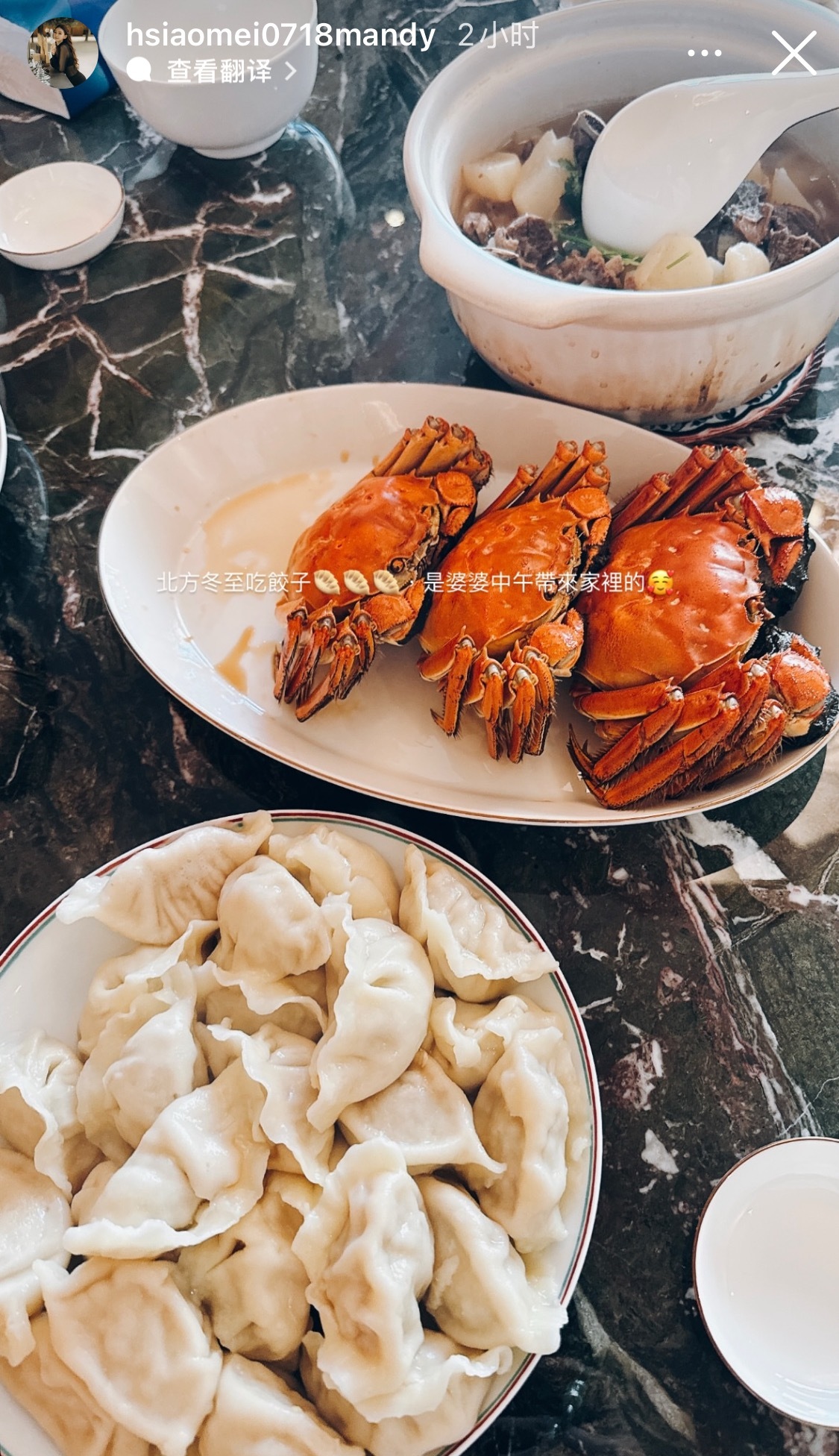 马筱梅更新ins,小梅冬至吃了饺子、螃蟹。而且,她现在怀着孕,婆婆很关心她,饺子