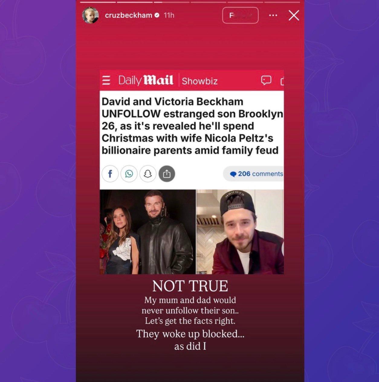 这几天外媒报导贝克汉姆夫妇和长子的关系再恶化,双方相互取消ins关注,但贝克汉姆家老三克鲁兹不忍了,转发媒体报导强调非事实,并透露老大布鲁克林在ins上拉黑了全家,“我父母绝不会主动取关亲生儿子...先说清事实。他们是醒来发现被拉黑的...我也是。”