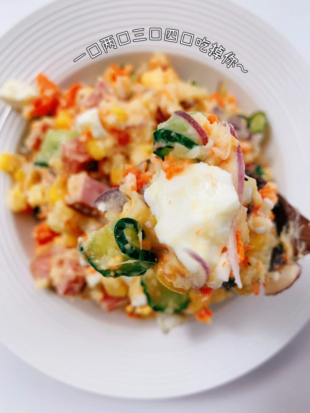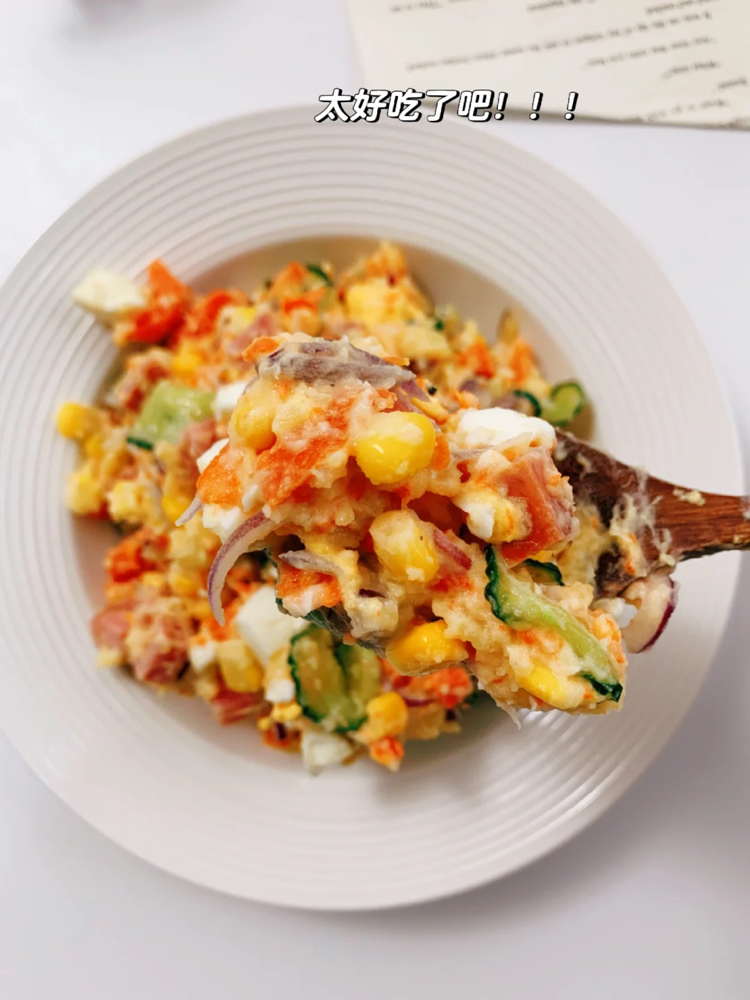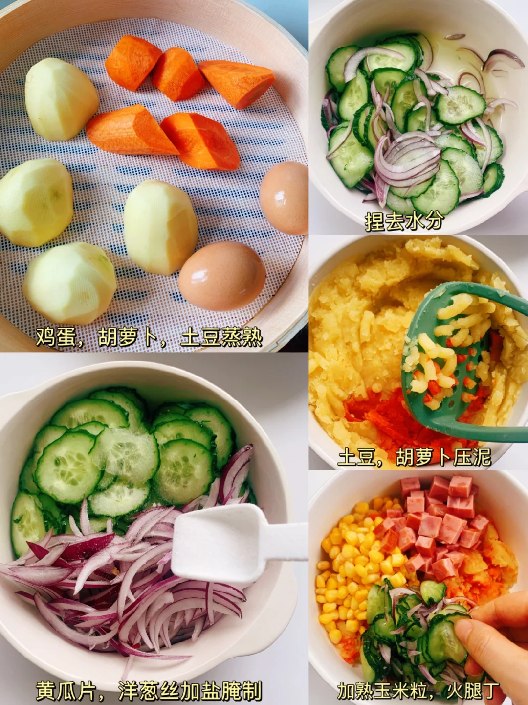 自制低Gi减脂餐,我想让减脂餐更好吃✨✨✨ [飞吻R]hi,又是快乐的一天啊❗今日分享: ----- 【鸡蛋土豆泥沙拉】 ❤️食材: 主料:土豆,鸡蛋,胡萝卜🥕,火腿,甜玉米粒,黄瓜🥒,洋葱🧅 辅料:沙拉酱,黑胡椒碎,无糖酸奶 做法见图片 ❤❤小提示: 1️⃣包成生菜包或者做成三明治都可以。 2️⃣沙拉酱少加点,酸奶选无糖酸奶。 3️⃣腌制的洋葱丝和黄瓜片一定要捏去水分。 ✨✨又是快乐减脂的一天呀❗ [派对R][派对R]随手分享减脂餐,喜欢请关注‼️