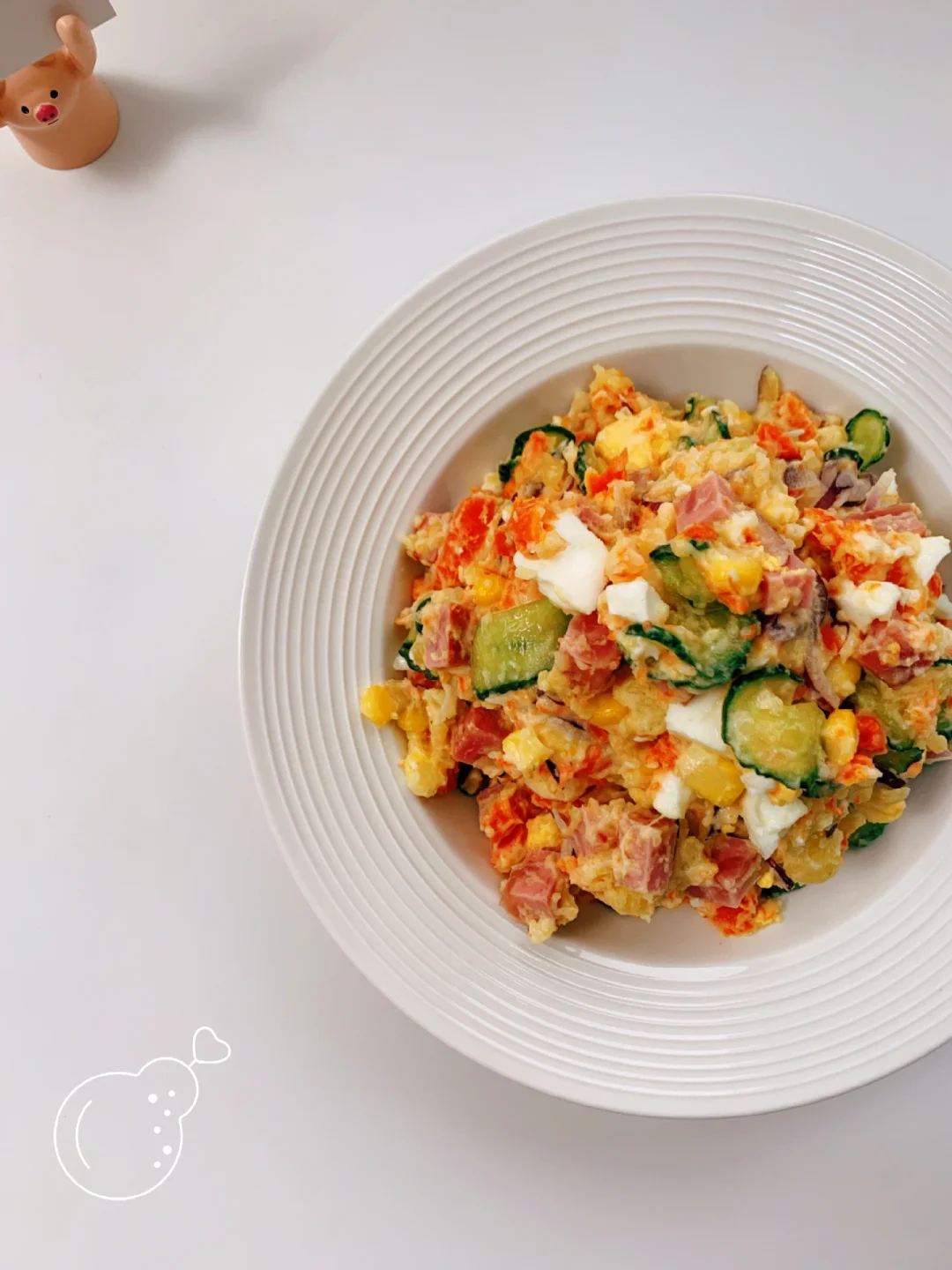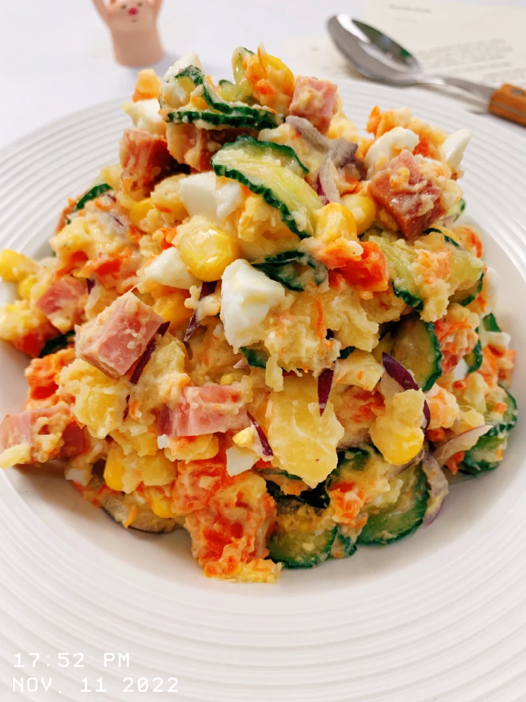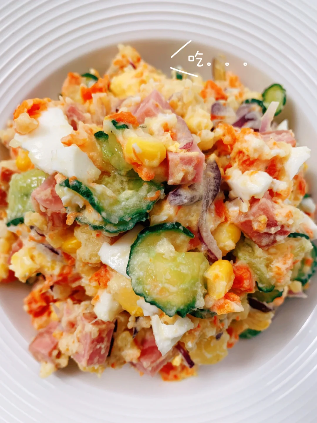 自制低Gi减脂餐,我想让减脂餐更好吃✨✨✨ [飞吻R]hi,又是快乐的一天啊❗今日分享: ----- 【鸡蛋土豆泥沙拉】 ❤️食材: 主料:土豆,鸡蛋,胡萝卜🥕,火腿,甜玉米粒,黄瓜🥒,洋葱🧅 辅料:沙拉酱,黑胡椒碎,无糖酸奶 做法见图片 ❤❤小提示: 1️⃣包成生菜包或者做成三明治都可以。 2️⃣沙拉酱少加点,酸奶选无糖酸奶。 3️⃣腌制的洋葱丝和黄瓜片一定要捏去水分。 ✨✨又是快乐减脂的一天呀❗ [派对R][派对R]随手分享减脂餐,喜欢请关注‼️