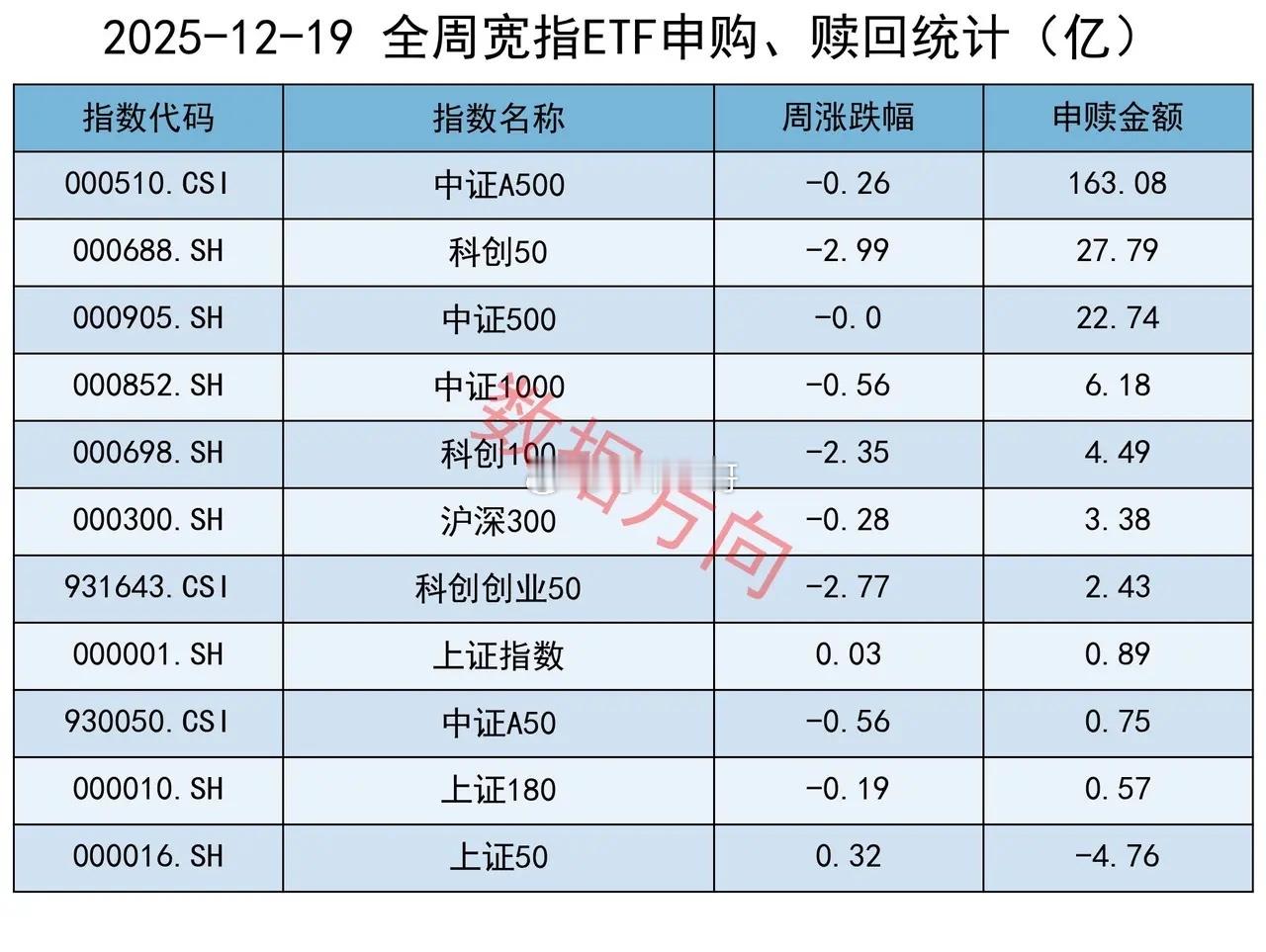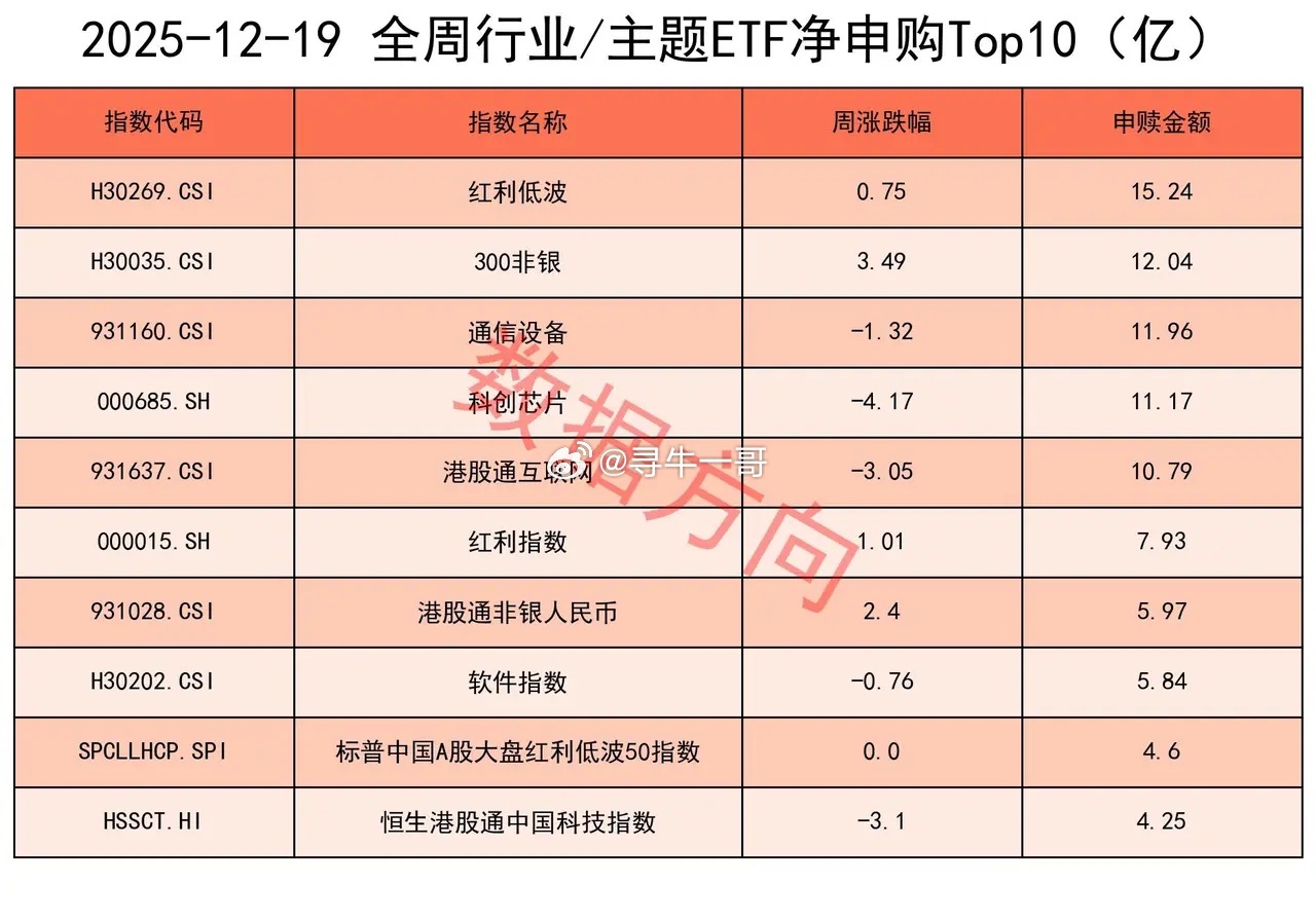 上交所股票型ETF本周净申购272亿!本周,上证指数微涨0.03%,上交所股票型ETF净申购272.49亿。五个交易日全部净申购,依次分别为5.44亿、52.63亿、102.44亿、51.96亿和60.02亿。从各宽指的申赎情况来看:中证A500,本周获大幅净申购163.08亿,仅此一家占了全周总额的60%。科创50、中证500,本周净申购双双超过20亿;中证1000、科创100、沪深300、科创创业50、上证指数、中证A50、上证180,本周分别获得小幅净申购;仅有上证50指数在本周被小幅净赎回。根据以前的经验,当所有宽指全部获净申购时,通常是较好的短期信号,说明股价普遍低于ETF的价格,有套利的机会。本周仅有上证50被小幅净赎回。行业和主题申购榜红利低波、红利指数、标普中国A股大盘红利低波50指数,一起进入本周申购榜,合计净申购27.77亿红利指数的核心逻辑是筛选持续高分红、高股息率且盈利稳定的上市公司,通过长期持有分享企业分红收益 + 股价增值收益,本质是赚 “企业盈利分红” 和 “估值修复” 的钱,适合追求稳健收益的长期资金。300非银、港股通非银人民币指数,一起进入本周申购榜,合计18.01亿12 月 5 日金融监管总局下调险资权益投资风险因子:持仓超 3 年的沪深 300、中证红利低波动 100 成分股风险因子由 0.3 降至 0.27,持仓超 2 年的科创板股由 0.4 降至 0.36,显著降低资本占用,释放数百亿 — 千亿级权益增量资金,利好险资配置与自身权益收益。12 月 14 日三部委联合发文,鼓励商业养老、健康险发展,拓宽负债端增长空间。摩根士丹利、中金、瑞银等纷纷上调中国平安等目标价,该股创近4年新高。12 月 17 日中金公司披露吸收合并东兴证券、信达证券预案,18 日复牌,引发市场对券商 “头部整合、提升集中度” 的联想,带动板块联动拉升。赎回榜军工龙头、中证军工、中主国防等指数,一起进入本周赎回榜,合计净赎回38.25亿以航天商业为代表的国防军工板块涨幅居前,个股的价格高于ETF,出现了反向套利的机会。国家将商业航天列为战略性新兴产业,2025 年设立商业航天司并发布《2025—2027 年行动计划》,明确路径与目标。商业航天与传统政府主导航天的核心差异在于以盈利为核心目标。卫星互联网纳入新基建,国家星网、上海 “千帆” 等巨型星座提供海量需求,为商业化提供 “基本盘”,通过降低成本、规模化供给与应用变现形成闭环,兼具战略价值与商业价值。ETF