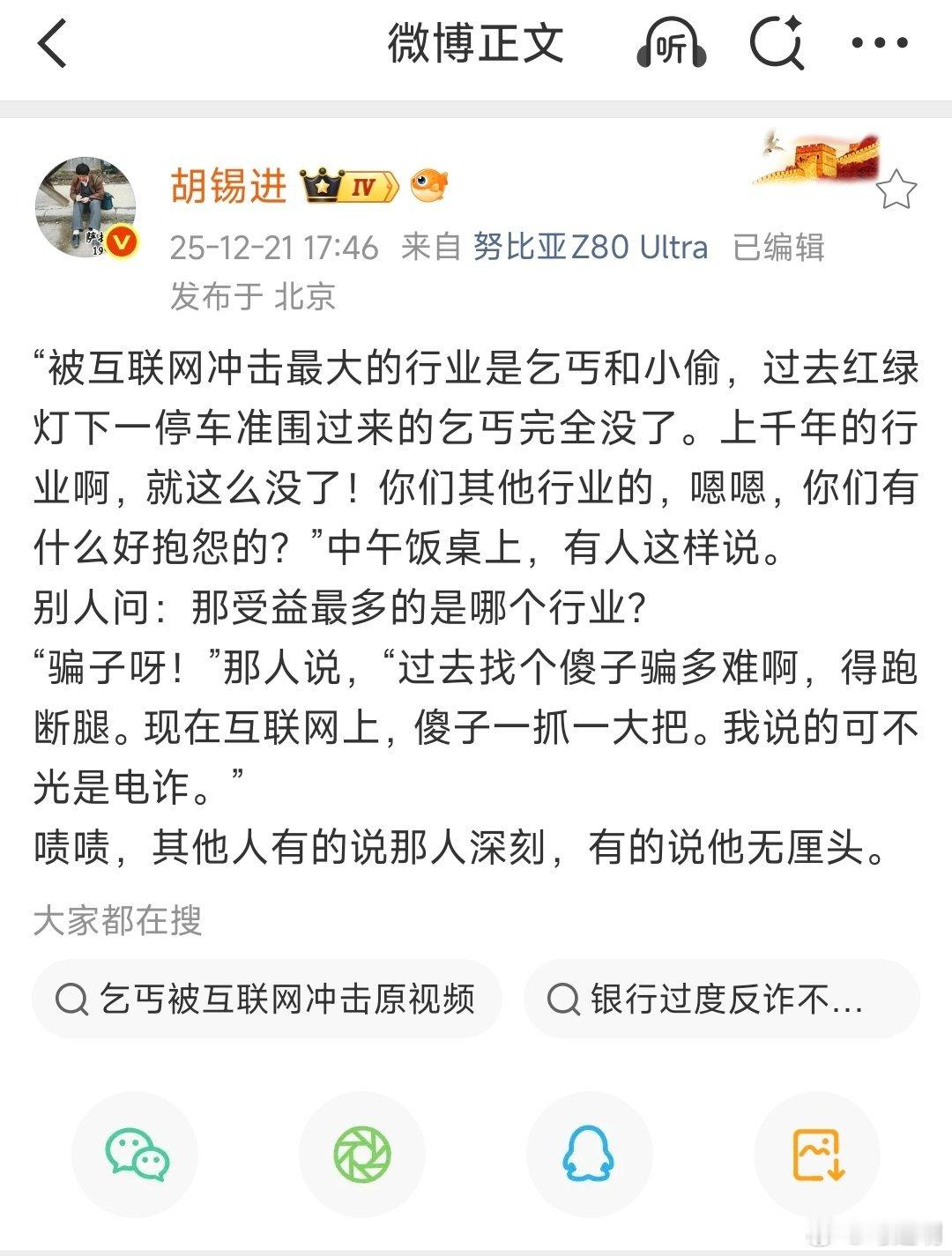 “互联网受益最多的是哪个行业?“骗子呀!”那人说,“过去找个傻子骗多难啊,得跑断腿。现在互联网上,傻子一抓一大把。我说的可不光是电诈。”——这是胡锡进对他聚会吃饭时的同桌人的言论复述。胡锡进老师的朋友这话说的真对!电诈是骗钱,“症脓量”是既骗钱又收割脑仁。电诈骗钱可能会掉了脑袋,“症脓量”拿着钱还有名,心里还会骂韭菜是底层穷比。都是骗子,性价比不一样。