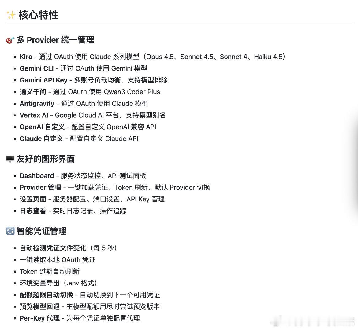 平时使用各种 AI 编辑器或客户端时,常会遇到账号额度分散的问题。比如拥有 Kiro 账号却更习惯使用 Cursor 开发,或者 Gemini CLI 的额度充裕却无法直接在常用的聊天工具里调用,不同工具间的凭证无法通用,导致资源浪费且配置繁琐。ProxyCast 是一个开源的桌面端工具,旨在让不同 AI 客户端的额度自然流动。它能将你已有的 AI 客户端凭证转换成标准的 OpenAI API 接口,为本地开发和其他第三方工具提供动力。该工具不仅解决了多账号统一管理的问题,还提供了友好的图形化界面,让用户无需复杂的命令行操作即可实现凭证到 API 的转换,极大地提升了 AI 工具的使用效率。GitHub:github.com/aiclientproxy/proxycast主要功能:- 统一管理多个 Provider,支持 Kiro、Gemini、通义千问、Vertex AI 等多种凭证来源;- 将本地客户端凭证转换为标准 OpenAI 或 Anthropic API,兼容绝大多数主流 AI 插件与应用;- 提供直观的仪表盘界面,支持服务状态监控、API 实时测试及日志查看;- 智能凭证管理系统,支持自动读取本地 OAuth 凭证、Token 自动刷新以及配额超限自动切换;- 灵活的路由与模型映射,可将请求自定义映射到指定的 Provider 或模型版本;- 安全的本地运行环境,支持 TLS/HTTPS 加密通信,并提供访问控制与密钥认证功能。支持 Windows、macOS 和 Linux 多平台使用,基于 Tauri 框架开发,运行轻量且响应迅速,适合希望整合 AI 资源、降低 API 开支的开发者与重度 AI 用户。