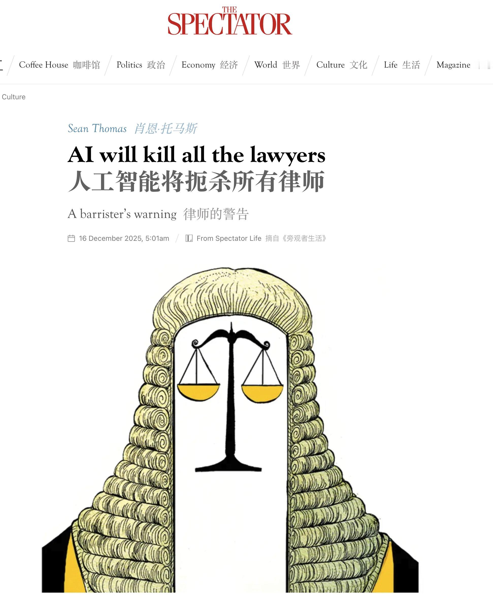 AI将终结律师行业:来自一位英国大律师的警告这场景令人愉悦,就像是詹姆斯·邦德电影中的文戏,又或是《慢马》(Slow Horses)里的一集。我正坐在伦敦Soho区一家豪华会员制酒吧阴影笼罩的角落里。十二月的伦敦,暮色温和地降临。坐在桌子对面的是我的老相识——一位资深的英国出庭大律师(Barrister)。他五十多岁,头发灰白,英俊得不张扬。但他要求匿名,因为他即将说出的话,将招致整个法律同行的憎恨。我们暂且叫他“詹姆斯”。认识他这几年,我们聊过从政治、建筑到切尔西足球俱乐部霉运的各种话题。我们也聊过科技和AI。以前,詹姆斯对AI的看法就像他的政治立场一样:中间派、聪明、温和且带着怀疑。但现在,一切都变了。在过去的几周里,詹姆斯确信AI将“彻底摧毁”我们所知的法律行业:它将砸烂饭碗,终结现有的体系,让成千上万的人失业。而且他说,这场末日比几乎任何人意识到的都要来得快。他抿了一口意式浓缩马提尼,先给了我一些背景铺垫。“你看到关于Sandie Peggie案的头条新闻了吗?那个法官据称使用了AI。相信我,这仅仅是个开始。AI是冲着我们所有人来的。”“怎么讲?”我问。“上周我们做了一个实验,一种模拟。我们拿了一个真实的、最近刚处理完的重要案件——一个复杂的民事法庭上诉案。那个案子的文书是我写的,花了我整整一天半的时间。我们隐去了所有身份细节以保密,然后把同样的案情喂给了‘Grok Heavy AI’。接着,我们要求它做我做过的工作。经过一些提示词引导,最终的结果是……”他摇了摇头,“惊人。简直令人咋舌。它只用了30秒,而且写得比我好。你要知道,我可是这行里的顶尖高手。”他靠向椅背,表情苦涩又无奈。“那是真正伟大的御用大律师(KC)才有的水准。是最完美的法律文件。而这一切,只需几秒钟,成本几乎为零。我们怎么跟它竞争?根本没法比。”他喝完了那杯马提尼。我们要了第二轮。“只要提示词得当,法律AI现在已经遥遥领先于人类。那些只提供法律意见却不接触客户的出庭律师或辩护人,已经彻底完蛋了。但这还只是前奏。”詹姆斯认为,AI将顺着法律界的等级阶梯一路向上吞噬。先是基础杂活,然后是起草、引用,最后是论证。最终,绝大多数法律工作将被取代。“处理程序性事务的律师显然注定要被淘汰。AI将在几秒钟内处理最复杂的遗嘱认证和产权转让案件。人类最复杂的技能将变成……”他悲伤地笑了笑,“把纸质文件扫描成电子版。出庭大律师们将在法庭上陈述由AI起草的论点,然后人们就会质疑,为什么要付给这些人类律师20万英镑?于是,他们也会消失。”他简练地总结道:“除了极少数例外,法律行业对几乎所有人来说都结束了,甚至可能包括法官——正如我们这几天所见。”我提到了“幻觉”问题——即AI模型一本正经地胡说八道——以及法庭上对真人面孔的需求。Sandie Peggie案的判决据称就包含了AI制造的错误。他对此不屑一顾:“那只是暂时的技术Bug和人类的情感偏好。经济效益的论据是压倒性的。”这里还有一个显而易见的问题。如果詹姆斯能看到未来的趋势,为什么其他人看不到?詹姆斯一饮而尽,解释说下一代律师正被训练去相信他们可以驾驭AI,而不是被它取代。他们自我安慰地认为AI只是另一种工具,就像是牙齿更锋利的LexisNexis(法律数据库)。詹姆斯确信他们是在自欺欺人。他说,他的同行中可能只有1%的人知道即将发生什么。他还有一个更紧迫的论点。“律师是傲慢的。律师在管理这个国家。基尔·斯塔默(Keir Starmer)就是典型的律师。这群人习惯了受人尊敬,通常有着——这么说吧——非常高的自尊心。要他们承认自己其实没什么特别的,承认自己可以被一个免费的机器人取代,这简直是一种折磨。”我问他这会对他的同事造成什么影响——在心理上、经济上和情感上。“起初,他们会像激进分子一样反抗。打一场必输的仗。会有尝试立法禁止在各个法律领域使用AI。但没用的,经济规律会解决一切。所以,很多原本赚大钱的人,突然之间就赚不到钱了。天知道这会对房价、政治以及我们所有人产生什么影响。因为这不仅仅是法律界的事。”我们的第二杯马提尼快喝完了。我已经感到足够不安,甚至想要第三杯。我环顾这家位于伦敦黄金地段的酒馆,看着周围那些光鲜亮丽、聪明的精英,墙上挂着优雅的英国现代艺术品,酒单上列着极好的葡萄酒。当支撑这一切的生态系统——富有的都市人用他们聪明的大脑换取财富——被彻底动摇,甚至崩溃时,会发生什么?考虑到他的话题,詹姆斯显得出奇地愉快。“老实说,很多律师是罪有应得。他们中有太多人贪婪、自私——却没有自知之明。他们制造复杂性纯粹是为了给自己制造更多的工作。激进的法官是一种诅咒,这个诅咒很快就会被解除了。也许最后这都是一件好事,即使有10万名失业的出庭律师会变得……”他笑了,“有点破坏稳定。想象一下,一支由身无分文、自命不凡、激进的律师组成的大军——却无事可做。”俱乐部里现在人声鼎沸,詹姆斯要去和同事们共进晚餐了。“显然,我不会对他们说这些。他们会恨死我的。但总得有人说实话。”我有最后一个问题。眼下,年轻人们正在攻读法律,或者考虑这么做。詹姆斯有什么建议吗?他坐直了身子,充满激情。“我的侄女是个可爱的女孩,非常聪明,在学校成绩