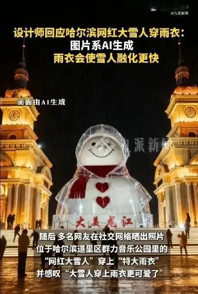 哈尔滨这冬天可真会玩儿!12月19日早上还下着雪呢,中午就变了脸,雪花融化成雨夹雪,甚至直接下起小雨来,气温一下子冲到4℃多,创了近几年12月中旬的暖记录。很多人觉得新鲜极了,毕竟哈尔滨12月下雨超级少见,有记录以来就那么几次而已,主要因为南方暖湿空气跑上来捣乱,把冷空气给顶住了。 结果,群力音乐公园那个超级可爱的网红大雪人遭了殃!网上突然冒出好多照片,说大雪人披上了大雨衣,看起来更萌了,大家直呼太有创意。でも,20日设计师李秋实站出来澄清了,那些雨衣照片全是AI画的假图!真要给雪人盖雨衣,反而挡住空气流通,融化得更快。雪人现在没啥好办法防护,雨水一淋,表面容易起小黑点,内部结构太硬,人工修都难修,坏严重了基本恢复不了原样。 说实话,冰雪雕塑这东西本来就叫“转瞬即逝的艺术”,天气一变暖就得认命。全球气候变暖背景下,这种极端暖事件越来越多,哈尔滨的冰雪景观也越来越脆弱。咱们欣赏的时候多珍惜点,别光图新鲜,得想想怎么更好保护这些冬日宝贝啊!