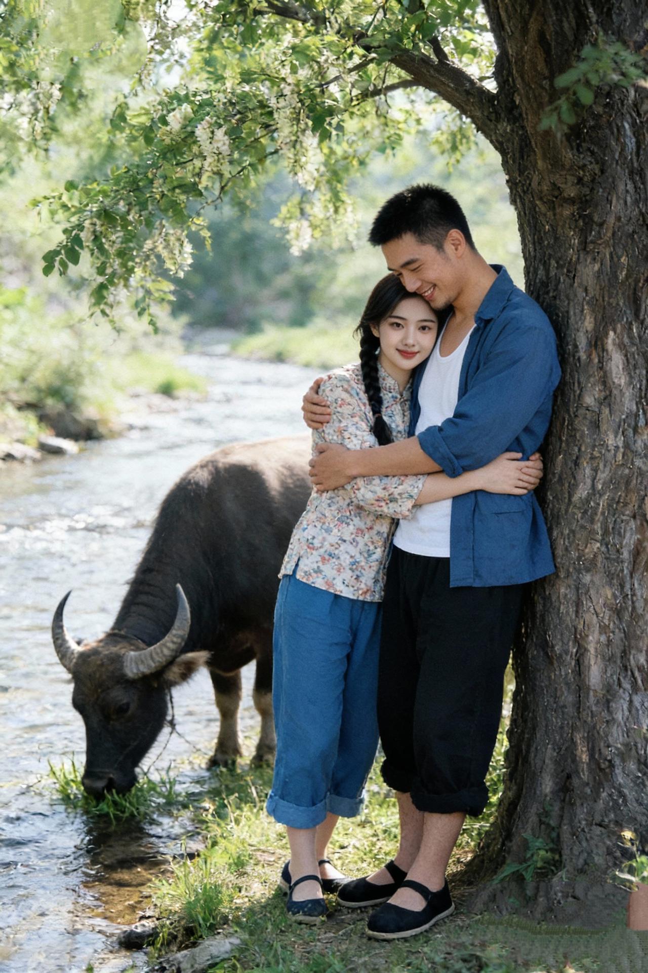 《溪畔相依》 老树枝桠筛晴光, 溪声绕岸淌微凉。 牛饮清波云影晃, 相拥时,风也软,鬓边香。 赏析:这首小令风格的短诗,以画面中的自然元素与人物情感为脉络展开。先铺陈“老树枝桠”“溪声微凉”的乡野景致,勾勒出清新质朴的背景;再以“牛饮清波云影晃”的动态场景,让画面更具生活气息;最后聚焦人物相拥的瞬间,用“风也软,鬓边香”的细腻笔触,将恋人相依的温柔与自然的恬淡相融,寥寥数语便把乡野间的缱绻情意刻画得鲜活动人。湖边挽柳 云栖溪畔诗联 漾月枯木逢安 秋深溪畔 诗语溪 田园溪畔