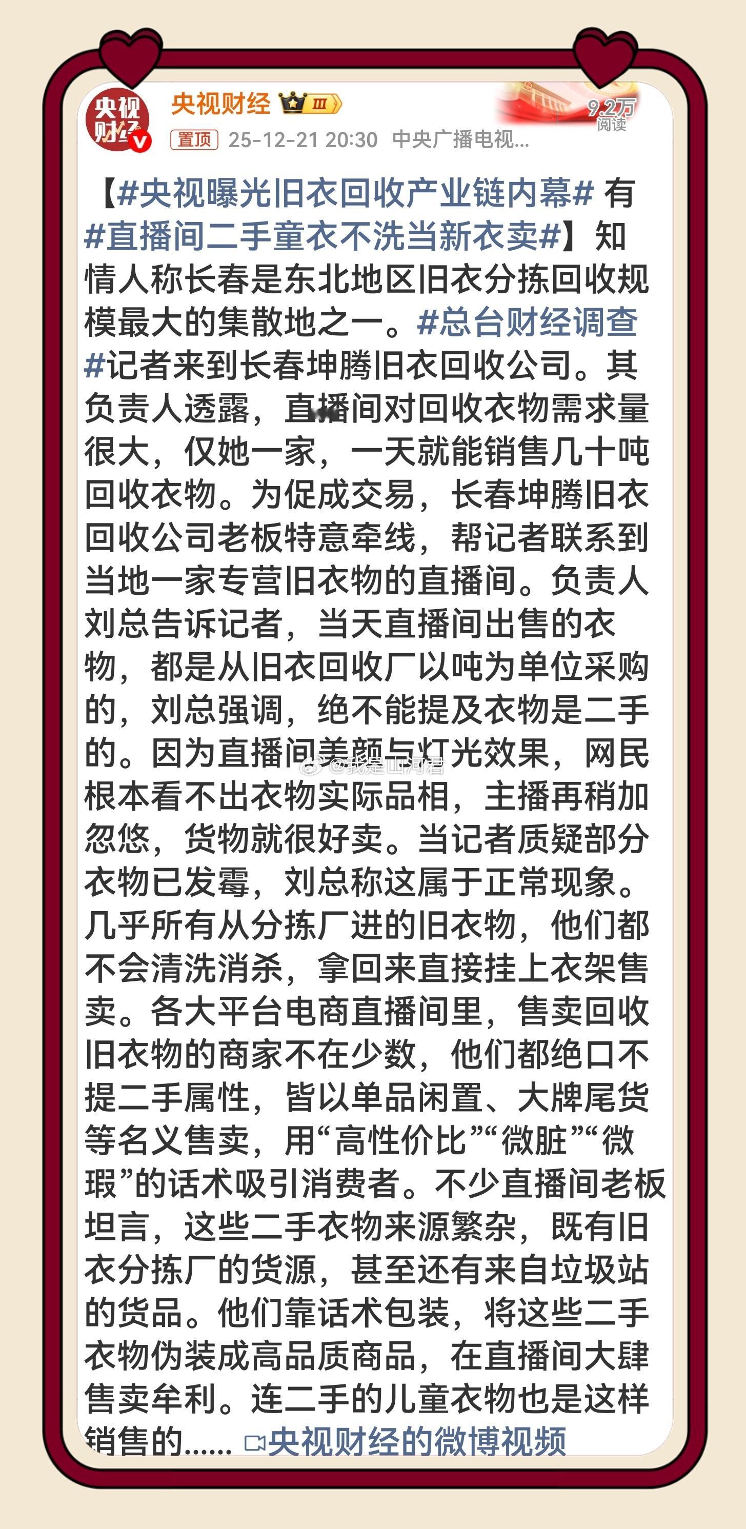 央视曝光旧衣回收产业链内幕 刷新下限!央视曝光的旧衣回收黑幕太触目惊心——来源杂到含垃圾站货品,不洗不消杀还带霉斑,直播间靠美颜话术伪装成“尾货”“新衣”卖,连童衣都不放过! 这哪是高性价比,分明是拿健康换利润! 平台该严审,监管要重拳出击,消费者别被低价忽悠,守住购物底线!直播间6元尾货实为二手旧衣 锦州·锦州市自媒体协会