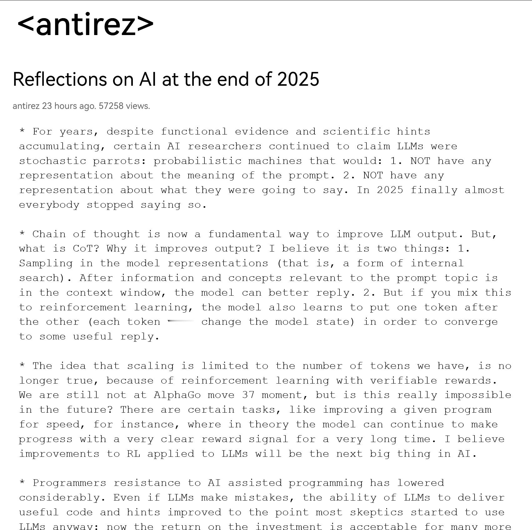 Redis开发者ntirez>写的在2025年底对人工智能的思考从“随机鹦鹉”到现实: 多年以来,尽管功能证据和科学线索不断积累,某些 AI 研究人员仍坚称大语言模型(LLM)只是“随机鹦鹉”:即一种仅凭概率运作的机器,它们:1. 对提示词(Prompt)的含义没有任何表征。2. 对自己将要说的话没有任何表征。直到 2025 年,几乎所有人终于都不再这么说了。思维链(CoT)的本质: 思维链现已成为提升 LLM 输出质量的基础手段。但 CoT 究竟是什么?为什么它能提升输出?我认为原因有二:1. 在模型表征中进行采样(即一种形式的内部搜索)。当与提示主题相关的空间信息和概念进入上下文窗口后,模型能更好地做出回复。2. 结合强化学习(RL):模型学会了为了收敛到某个有用的回复,而将一个个 Token 依次排列(每个 Token 都会改变模型状态)。扩展定律(Scaling)的新高度: “扩展受限于现存 Token 数量”的观点已不再成立,这归功于带有可验证奖励的强化学习。虽然我们尚未到达 AlphaGo 的“第 37 手”时刻,但未来这真的不可能吗?在某些任务中(例如优化程序的运行速度),理论上模型可以在清晰的奖励信号引导下,在极长的时间内持续取得进步。我相信,应用于 LLM 的强化学习改进将是 AI 领域的下一个重大突破。编程界的转变: 程序员对 AI 辅助编程的抵触情绪已显著降低。即使 LLM 会犯错,但其交付有用代码和提示的能力已提升到让大多数怀疑论者也开始使用的程度:现在的投资回报率(ROI)对更多人来说已是可接受的。编程界目前仍分为两派:一派将 LLM 视为“同事”(例如,我所有的交互都是通过 Gemini、Claude 的 Web 界面完成的),另一派则将 LLM 视为独立的编程智能体(Agents)。范式之争与 AGI: 少数知名 AI 科学家相信,Transformer 的奇迹可以循着不同路径再次发生,甚至表现更好。他们已组建团队和公司,研究 Transformer 的替代方案,以及具有显式符号表征或世界模型的模型。但我认为,LLM 是在能够逼近离散推理步骤的空间上训练的微分机,即使没有根本性的新范式出现,它们也有可能带我们走向通用人工智能(AGI)。AGI 很可能通过多种截然不同的架构独立实现。关于 CoT 的“谎言”: 有人声称思维链从根本上改变了 LLM 的本质,并以此为借口辩解:他们过去认为 LLM 局限性很大,现在改口是因为 CoT 让 LLM 变成了不同的东西。他们在撒谎。架构依然如故,目标依然是预测下一个 Token,思维链也正是这样由一个个 Token 堆叠而成的。ARC 测试的转型: 如今,ARC 测试(抽象推理基准)看起来不再像最初认为的那样不可逾越。针对特定任务优化的小型模型在 ARC-AGI-1 上表现尚可,而带有大量思维链的超大型 LLM 在 ARC-AGI-2 上取得了令人印象深刻的成绩——尽管许多人曾断言这种架构无法实现此类结果。在某种程度上,ARC 已从“反 LLM 测试”转变为“LLM 验证测试”。终极挑战: 未来 20 年,人工智能面临的根本挑战是避免人类灭绝。