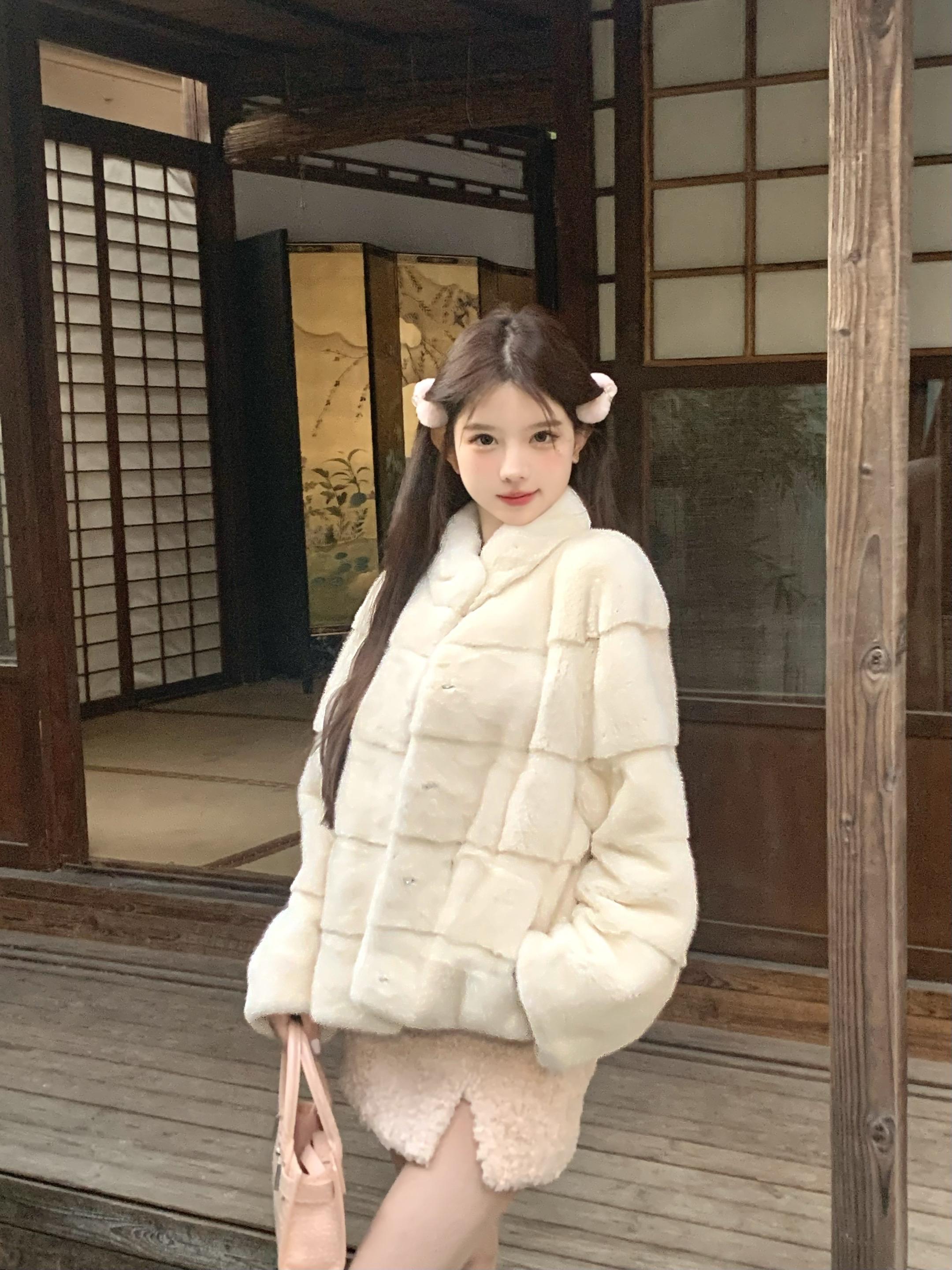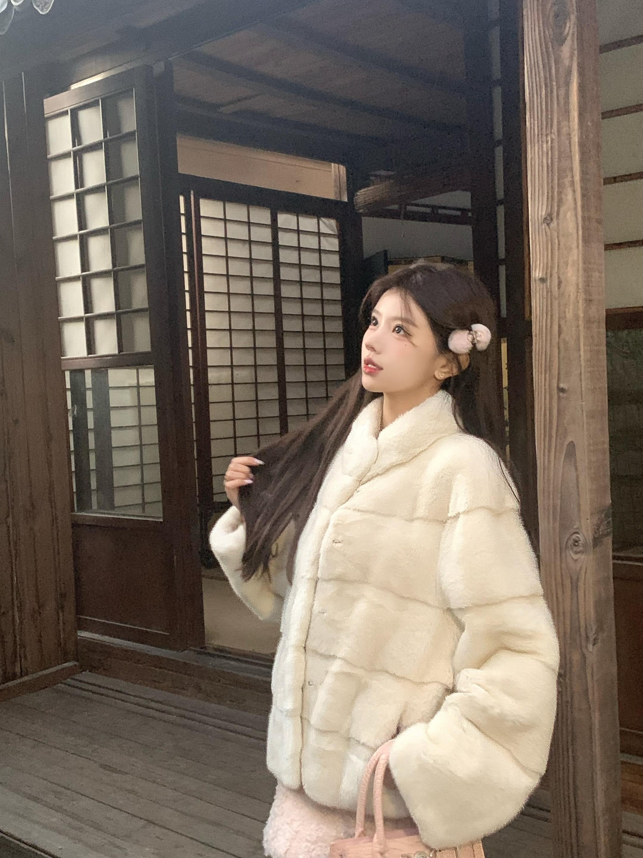 一位长相漂亮、身材出众的姑娘,穿上了一件对身材要求极高的紧身款一字肩粉色针织衫搭