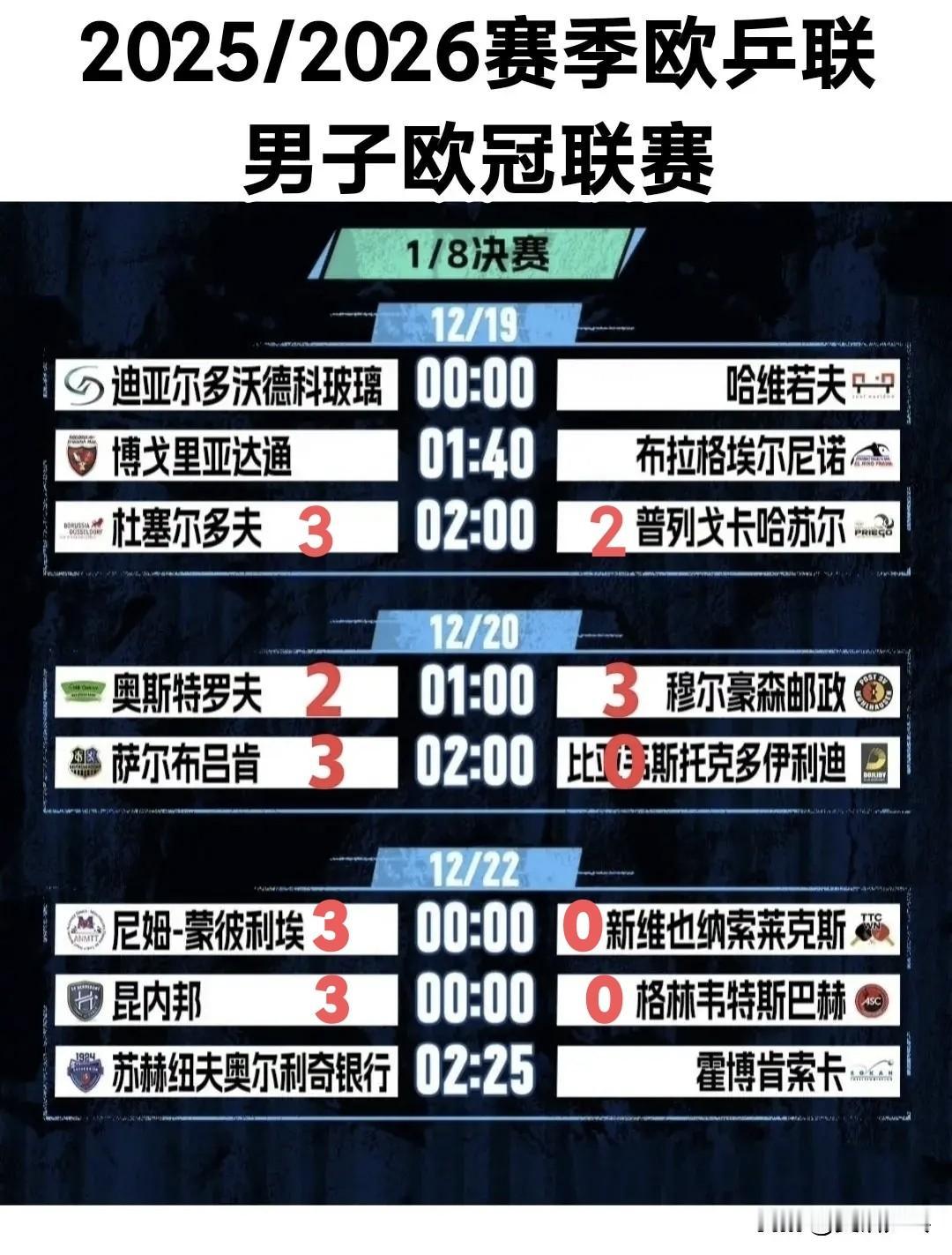 2025-2026赛季欧冠乒乓球联赛1/8决赛: 【尼姆蒙彼利埃3-0维也纳新城 】 1.费利克斯·勒布伦3比0斯克尔·宾茨(3,5,5) 2.艾利克斯·勒布伦3比0伊斯特拉特(11,7,4) 3.塔卡3比0赫里巴尔(4,7,8) 下一轮:尼姆蒙彼利埃🇫🇷VS德科格拉斯🇵🇱 2025.12.21