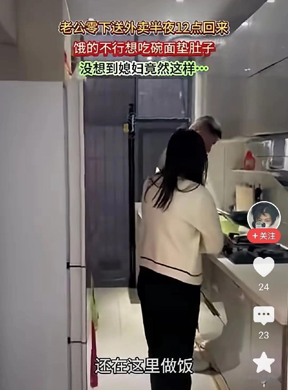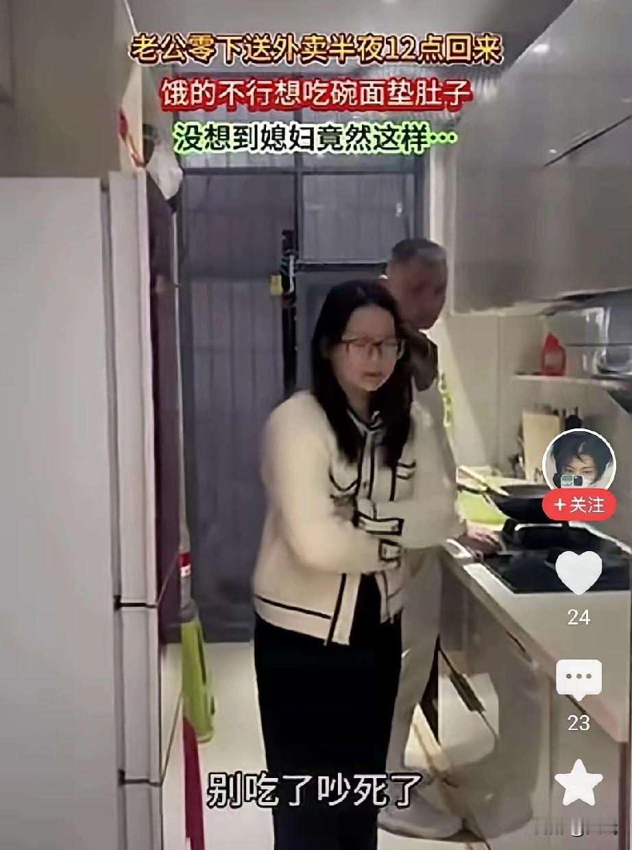 男子送外卖凌晨十二点的回家,他走进厨房想自己煮一碗面。“唉,这都几点了,还在这里做饭。”妻子从卧室走出,睡眼惺忪,裹着褪色的珊瑚绒睡衣,脸上写满不耐烦,声音冰冷得像窗外的寒风,“别吃了,吵死了。”她皱着眉头,一把拧灭灶火,面条在沸水里翻滚,热气瞬间消散。 男人手一僵,看着锅里那碗未熟的面,面条软塌塌地浮着,像他此刻的心。他想起白天送外卖时,顾客的刁难、路人的白眼,都咬牙挺了过来,可回到家,却连一丝温暖都找不到。 人生娶了这样的一个女人,真是悲哀。他默默关掉火,看着锅里那碗面,热气渐渐消散,就像他心中残存的希望,一点点被寒夜吞噬。