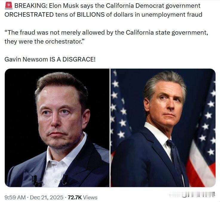 突发:马斯克表示,加州民主党政府策划了数百亿美元的失业救济金欺诈。 “这场欺诈并非仅仅被加州州政府放任,他们本身就是策划者。” Gavin Newsom 真是耻辱!