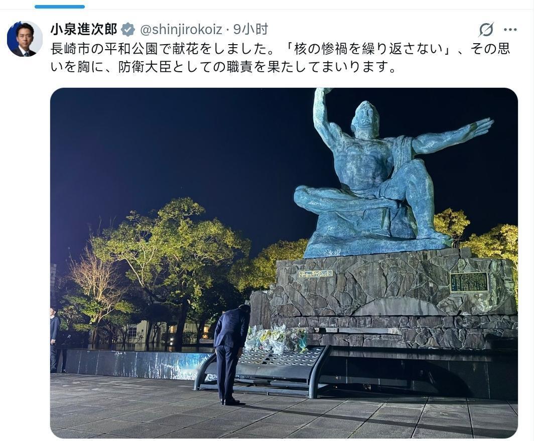小泉进次郎:我在长崎市的和平公园献了花。怀着“绝不再重演核灾难”这一信念,我将作为防卫大臣履行职责。