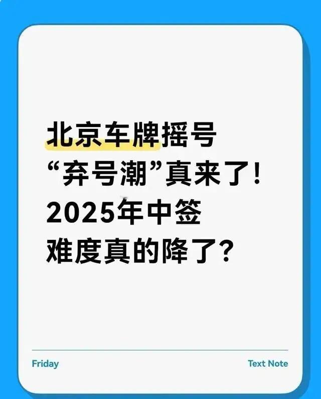 北京车牌摇号“弃号潮”真来了!2025年中签难度真的降了? 关于北京车牌摇号“弃号潮”以及2025年中签难度的变化,以下是一些分析和信息: “弃号潮”现象的背景 北京作为中国汽车保有量最大的城市之一,车牌摇号制度旨在控制机动车总量,缓解交通压力。近年来,随着中签难度不断增加,部分中签者可能因各种原因放弃已获得的车牌,形成“弃号潮”。这为其他申请者提供了更多中签机会。 2025年中签难度是否降低的因素 摇号指标的变化:如果北京市政府增加了年度摇号指标或优化摇号规则,可能会降低中签难度。 “弃号”比例的变化:弃号比例的增加意味着实际中签率可能有所提升。若2025年弃号比例显著上升,整体中签难度可能有所降低。 政策调整:例如,放宽部分申请条件、引入新的中签方式,或调整摇号算法,都可能影响中签难度。 实际情况分析 目前(截至2024年底)没有官方明确宣布2025年北京车牌摇号政策有大幅调整,但多方面迹象显示: 由于“弃号潮”的出现,部分申请者可能会更容易中签。 政府可能会根据实际需求调整指标,影响中签难度。 未来趋势 中签难度仍然存在一定压力:北京车牌摇号的中签率仍然较低,尤其是普通指标,难度较大。 “弃号潮”带来的短期缓解:如果弃号比例持续上升,短期内中签难度可能会有所降低。 长远来看:政策调整、车辆需求变化等因素仍会影响中签难度。 总结: 2025年北京车牌摇号“弃号潮”可能会带来一定的中签率提升,但整体中签难度仍然受到多重因素影响。如果你关注最新政策和数据,建议密切关注北京市交通管理部门的官方公告和相关统计信息。北京车牌照摇号 北京车牌新规 北京车牌政策 北京摇号规则 摇号汽车 汽车摇号新规
