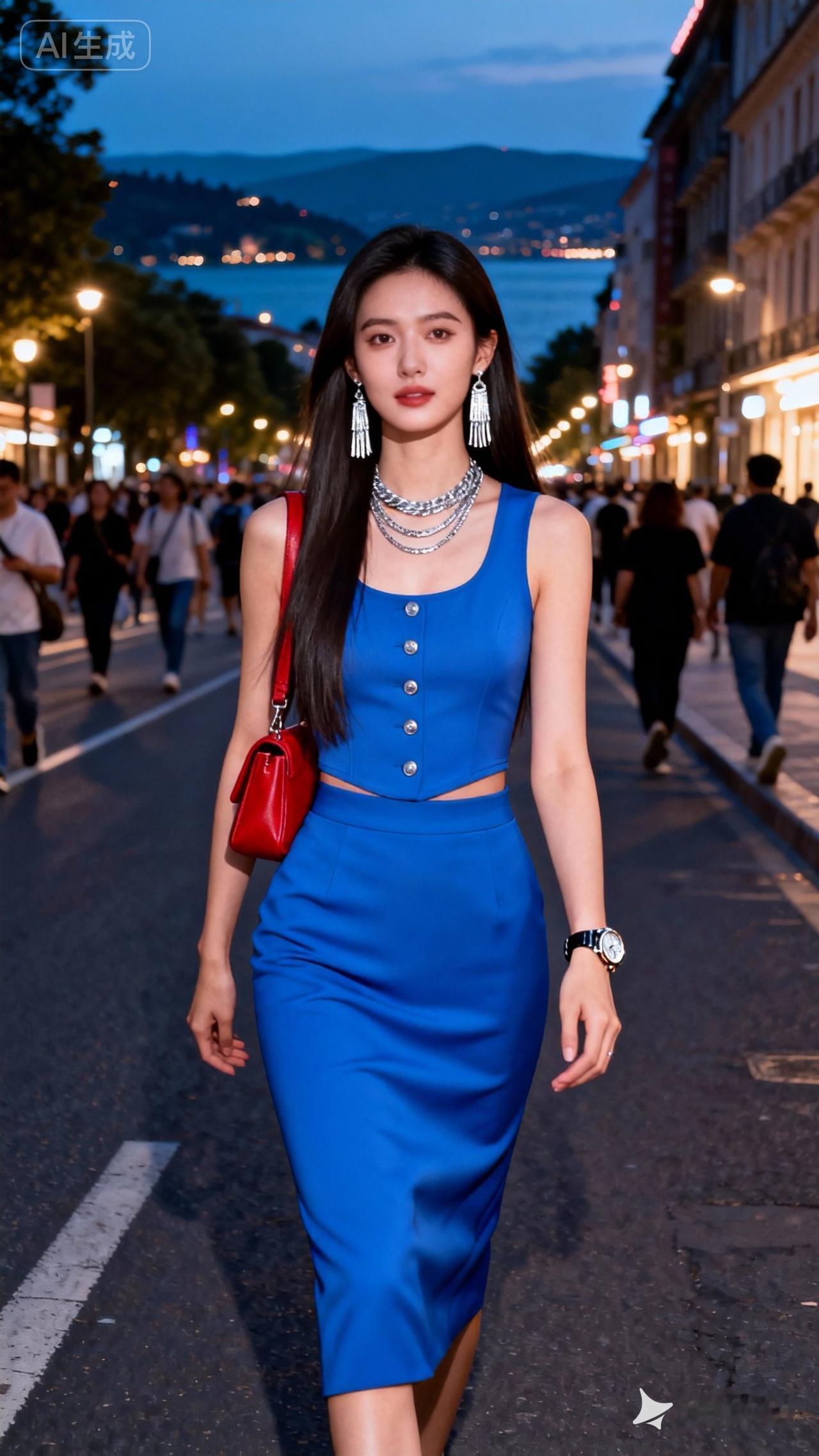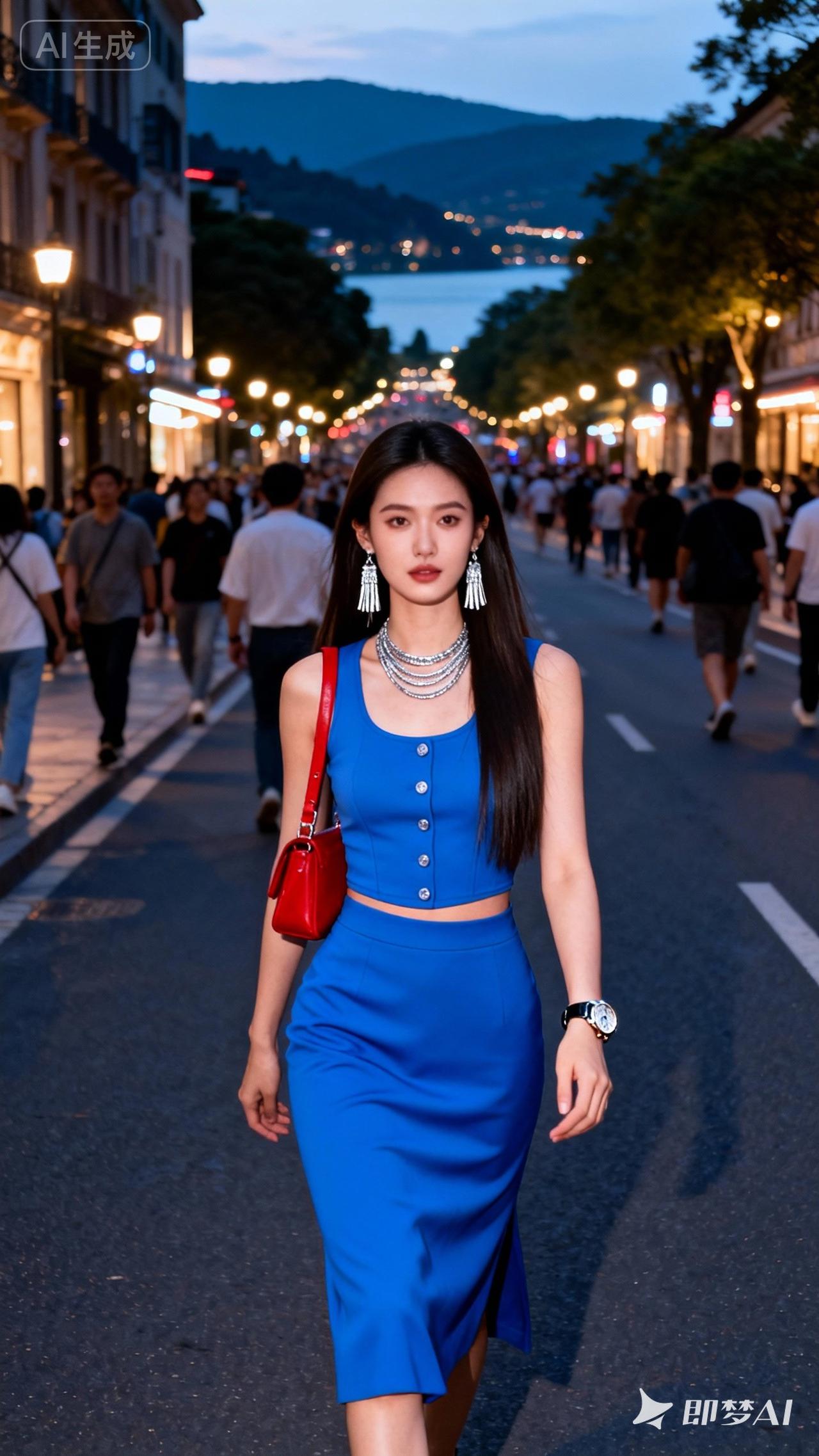都市夜景下的时尚穿搭,蓝色连衣裙搭配银色项链,走在繁华街道上。