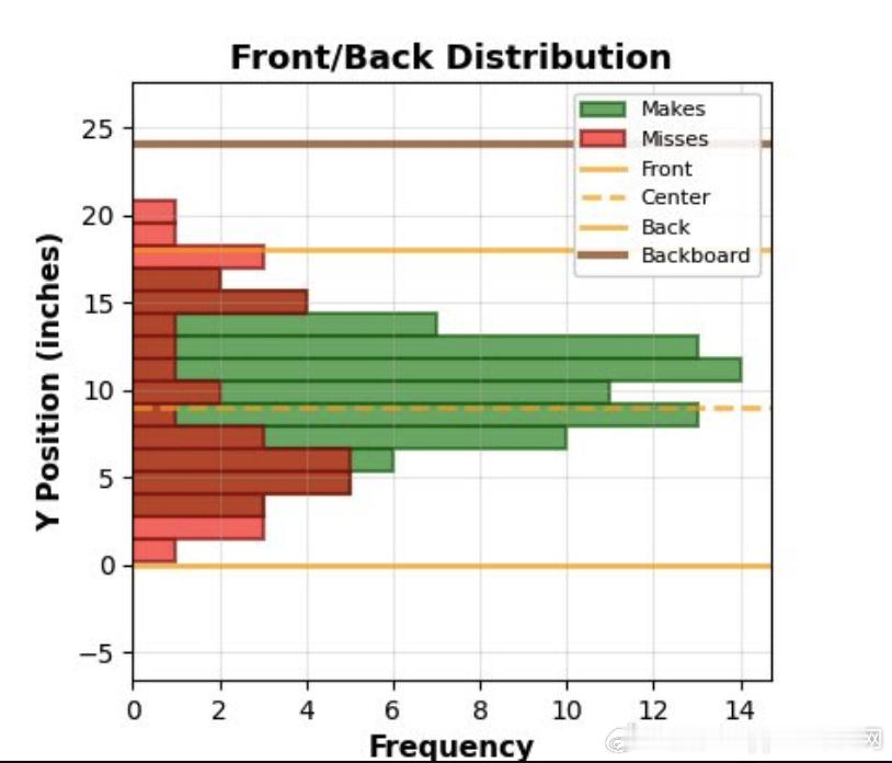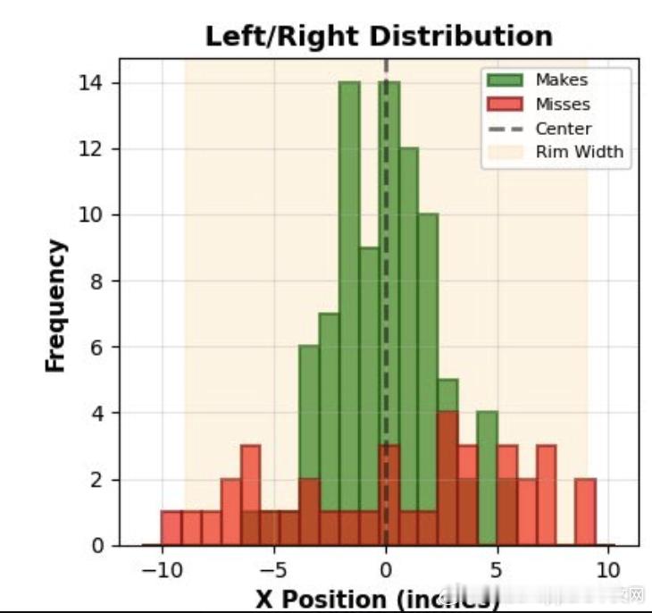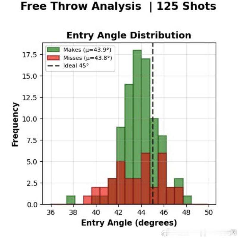 科学训练投篮--罚球篇之前我们笼统的分析过Noah投射软件如何改善投射的今天,我们看下细节的部分,类似的算法是开源的在github上有那么我们细化一下,如何通过这类监测软件来改善球员的罚球呢。以一个125次罚球的样本为例子:图1是落点位置俯视图图2是入筐角度分布图3是最佳落点分布(离篮筐圆心的距离)图4是,上下偏移度图5是,左右偏移度图6是,最终的罚球报告技术统计从报告中,得到的投篮追踪(罚球)数据总结:出手角度在投中和投失的尝试中保持稳定(43.90° vs 43.75°),几乎所有尝试都落在理论上的最佳范围(38°-52°)内。但角度本身并非决定性因素,出手位置(落点)显然起着更关键的作用。命中的投篮平均落在离篮筐中心3.53英寸(约9.0厘米)的位置,而投失的球平均落点距离超过其两倍(7.50英寸,约19.1厘米)。超过一半的尝试落入空心入网的“刷网区”,这些投篮的命中率约为94%。这表明可以从一个实用的训练阶段入手:首先稳定出手角度,为容错提供空间,然后转换重点,着力提升“偏离篮筐中心的距离”精度。所以,基本上改善罚球的步骤就是,首先从出手的角度,出手高度入手,这第一步的肌肉训练;然后,再从上下左右的入筐距离进行修正,再次细化出手记忆。通过本赛季火箭球员的罚球表现,亚当斯从上赛季46.2%来到本赛季70.6%,申京从上赛季69.2% 到本赛季73%,阿门从上赛季68.4%到本赛季79.8%,这些提升都不是偶然的。罚球是投射改善中最容易的环节。动态下的投篮出手,则需要更多的时间来形成长期的记忆(通过数量来形成质变),而且比赛中的心态/体能也很大限度的影响动态投篮出手,阿门季前赛三分效果不错,但是常规赛现在跌落20%,申京开赛第一场进了5个三分,最近20投1中,也正是心理和体能的综合影响。从全队的投射效果来看,只有kd和谢泼德是到了第二个阶段,就是在入筐的上下左右距离上进行修正(比赛效果就是打前沿,打后筐),其余球员还在出手角度和出手距离层面这个第一层面上有各类大大小小的问题(就是出手弹道偏)。这些通过长期的科学训练,最终会慢慢改善的(需要几个赛季),至于成果,全看个人努力程度。休斯顿火箭休斯顿火箭nbaNBA