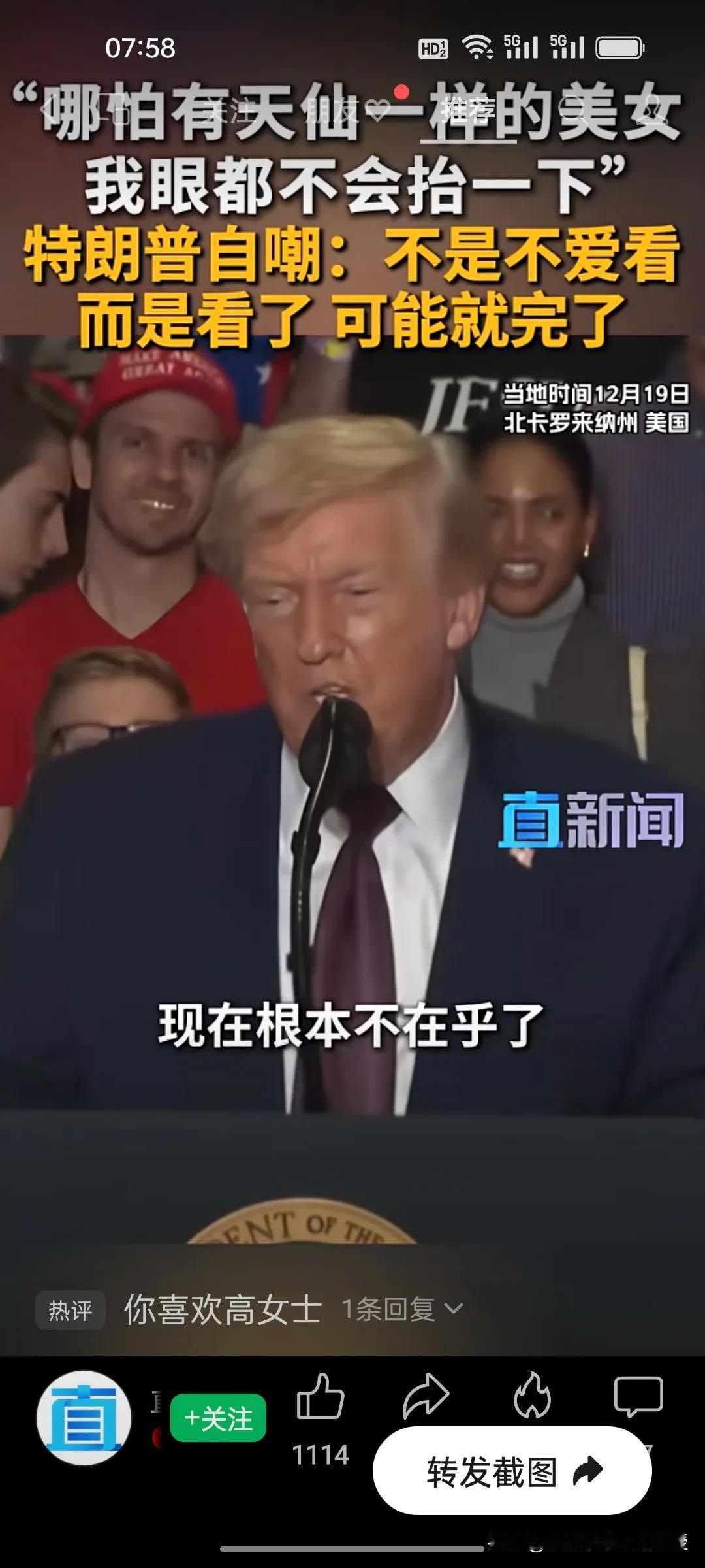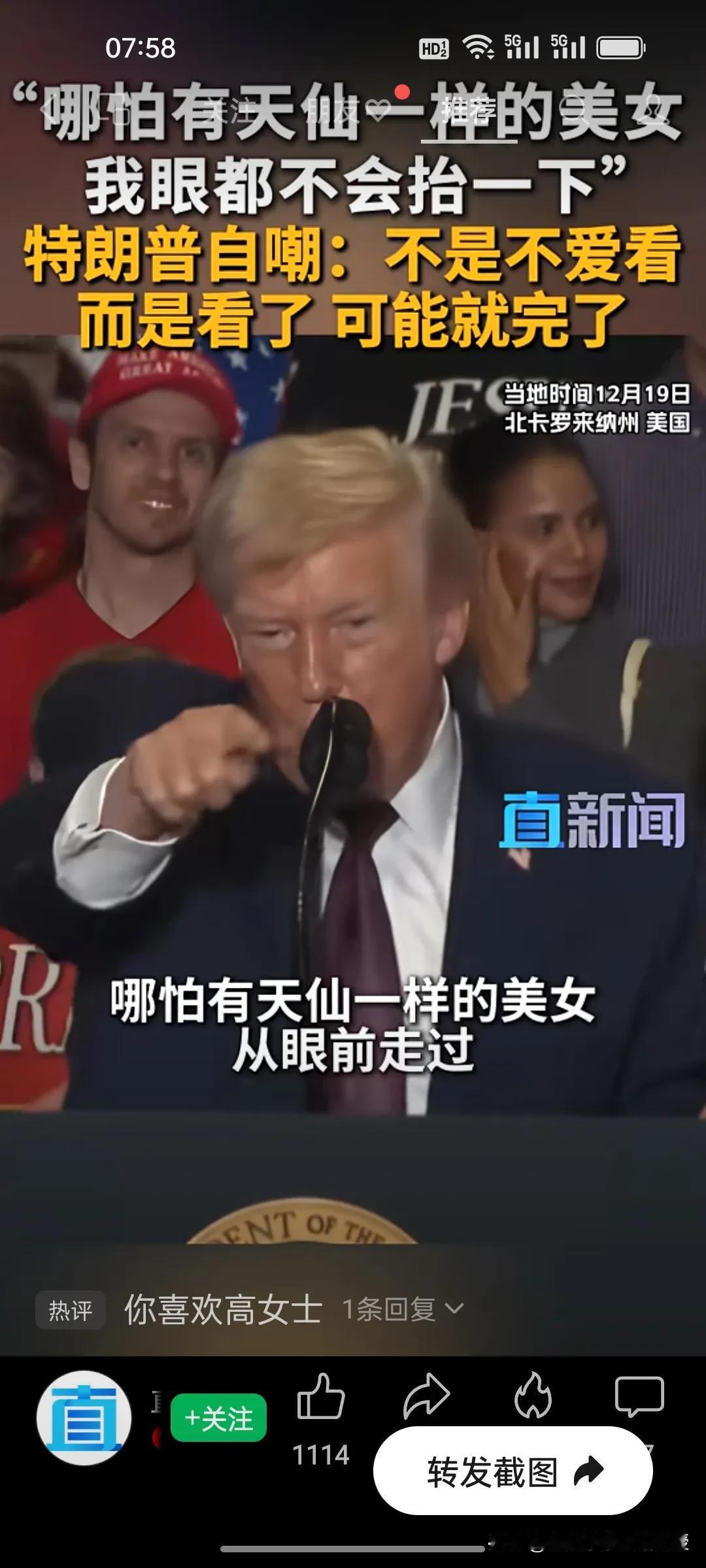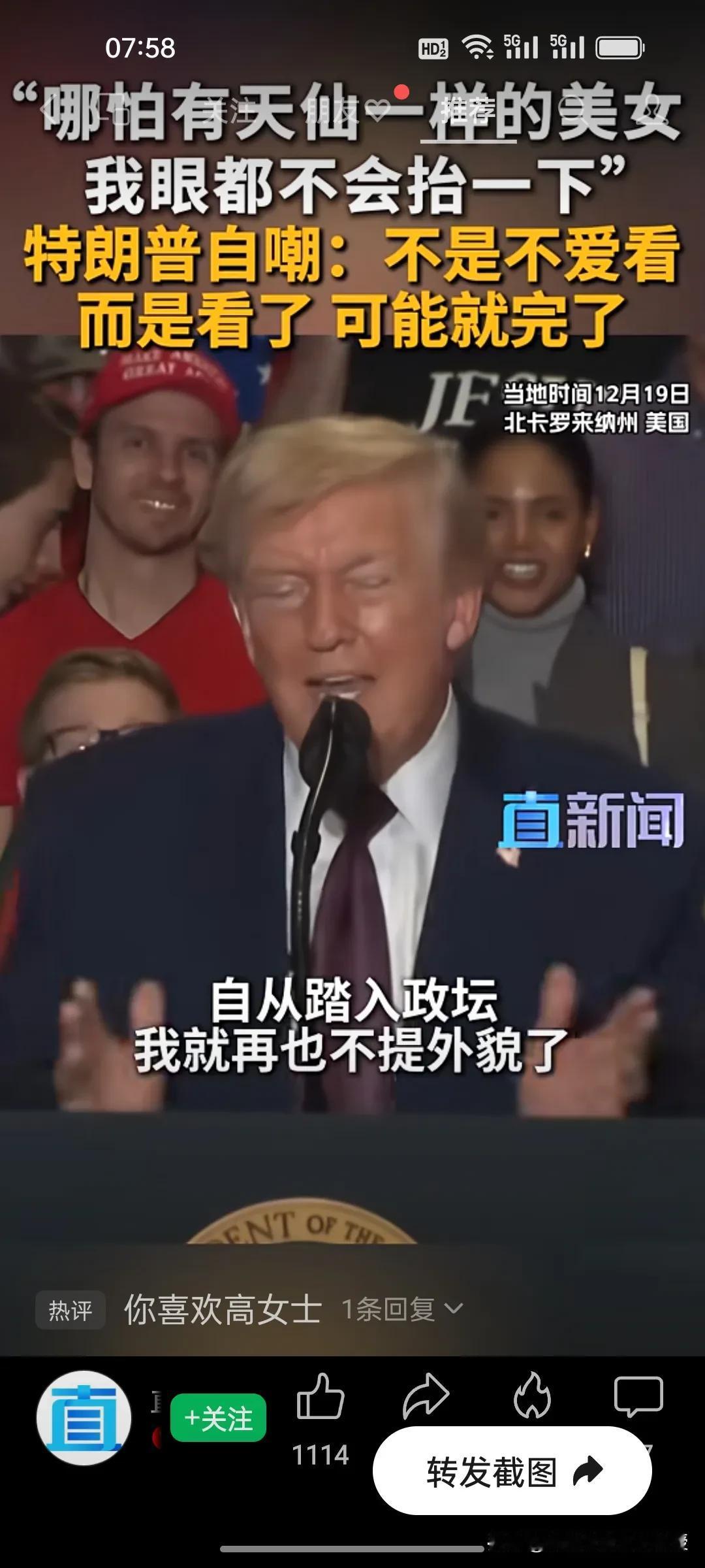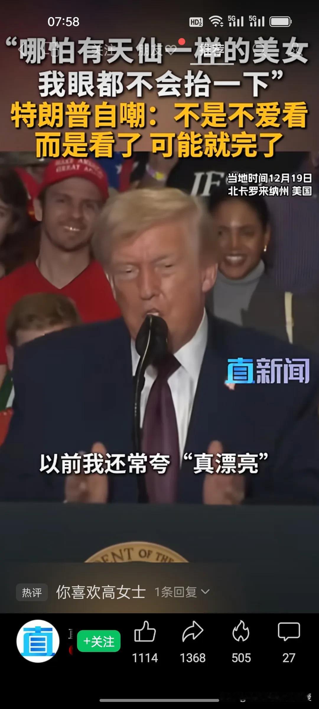特朗普这番自嘲,普京一听也得掂量吧?虽然特朗普已经快八十岁了,可是在有的问题上一点不含糊。 最近他在北卡罗来纳州的演讲中提到他特别注重美感,但是女人除外,踏入政坛就不提外貌了,哪怕有天仙一样的美女走过,他眼睛都不抬一下。这一番表态,活脱脱是商人式的精准站位,拎得清孰轻孰重。现场观众纷纷哈哈大笑。 巧的是,前不久普京才亲口承认自己正在恋爱,还实诚地说相信一见钟情。特朗普这番话,很难不让人联想到是隔空递话。这般话术,果然是老江湖的手笔,姜还是老的辣啊!