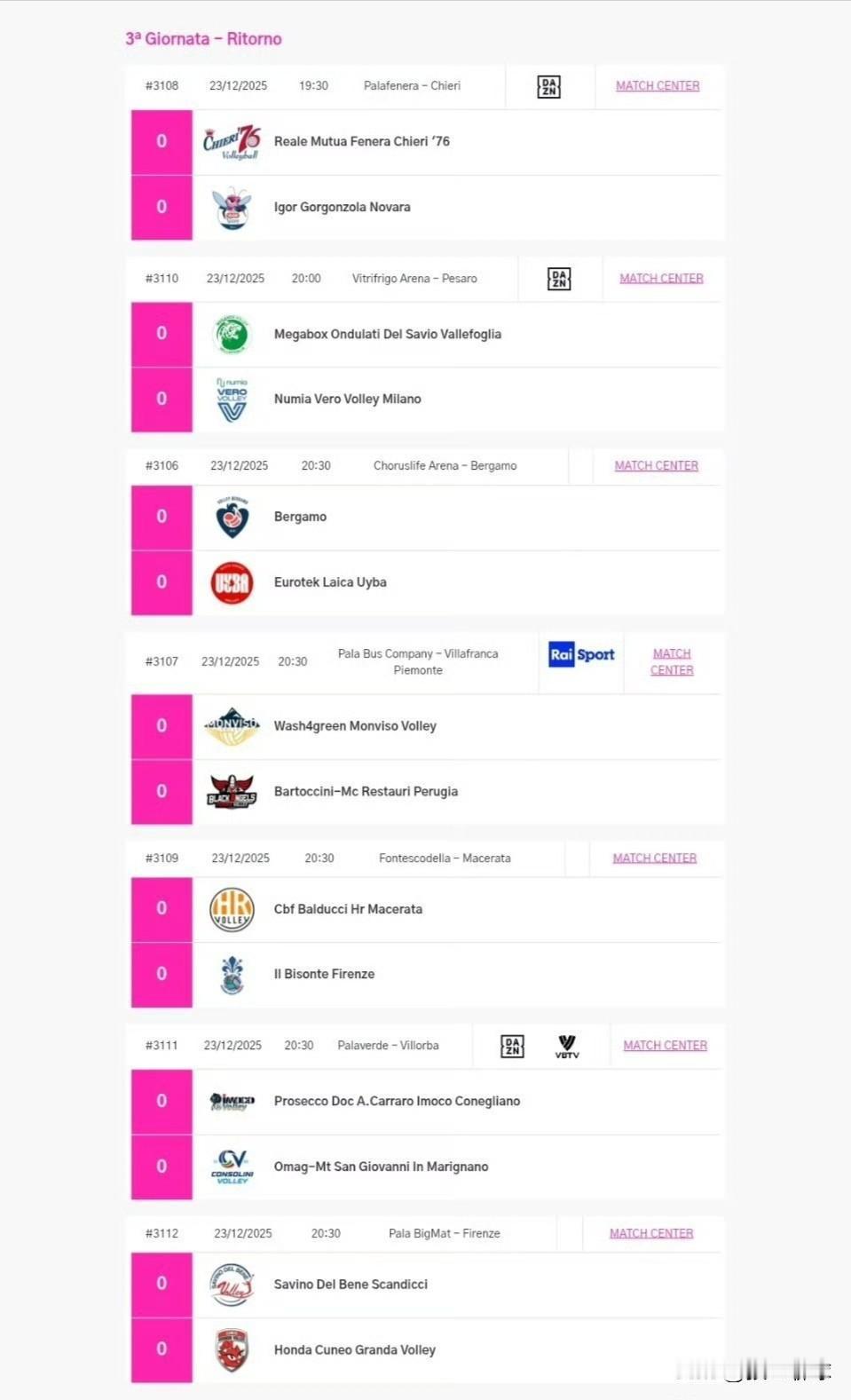 2025-2026赛季意大利🇮🇹女排联赛常规赛第十六轮赛程预告(北京时间) 12月24日(星期三) 02:30基耶里——诺瓦拉 03:00瓦莱福利亚——蒙扎(米兰) 03:30贝加莫——布斯托阿西齐奥 03:30皮内罗洛——佩鲁贾 03:30马切拉塔——佛罗伦萨 03:30科内利亚诺——圣乔瓦尼 03:30斯坎迪奇——库内奥 现在李盈莹回国治疗康复,意大利女排联赛只有朱婷和庄宇珊参加比赛,我们更多地关注科内利亚诺和圣乔瓦尼的比赛,令人惊喜地是这一轮刚好两队相遇,当然一个是联赛领头羊,一个是联赛尾巴垫底球队,实力差距巨大,不求获胜或赢局,但求科内利亚诺轻虐!