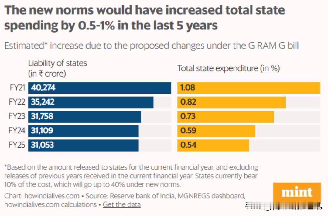 《铸币报》12月20日报道,莫迪新推农村就业保障法或加重地方财政负担,进一步降低邦政府支出灵活性。12月19日,印人民院通过《发达印度就业保障和维持计划法案》(VB-G RAMG),改革国大党重要执政遗产《圣雄甘地国家农村就业保障法》(MGNREGS)。根据该法,国家须按需向提出申请的农村家庭提供每年最多 100 天的带薪公共工程就业,以保障其最低收入与生计安全。而新法案相较过去做出大幅调整,具体而言,改革包括三个核心方面:一是大幅调整资金配给模式,资金配给比例由中央与邦9:1调整为6:4;二是中央将决定各邦预算拨款标准,各邦需自行承担超过标准的支出;三是减少农村就业保障覆盖范围,但相应增加对符合条件对象的保障力度。如各邦需在相关从业者提出申请后15天内提供就业机会,否则将支付失业救济金。同时,保障天数也增至每户每年125天。分析指出,新规将大幅增加印地方财政负担,2024-25财年各邦或面临3100亿卢比额外支出,总支出增加约0.54%。值得注意的是,由于印地方财政本就拮据,过去六年印农村家庭实际保障天数仅40-51天。在邦财政收入无实质增量情况下,增加地方负担以提高农民福利的设想恐落空,甚至损害群众实际利益。