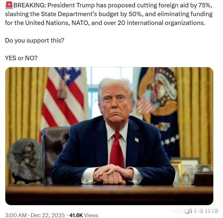 突发消息:川普总统提议将对外援助削减75%,把国务院预算削减50%,并取消对联合国、北约以及20多个国际组织的资助。