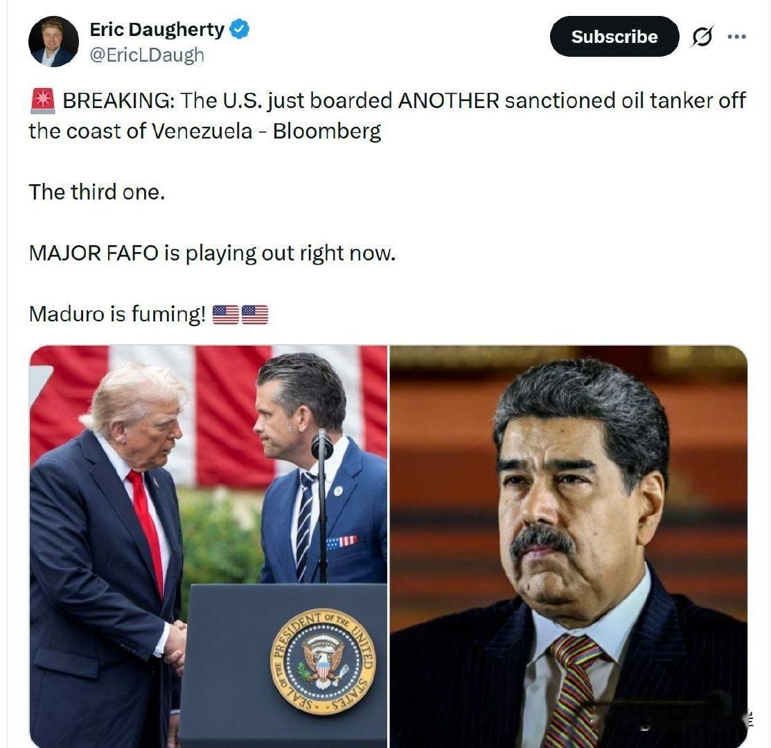 突发消息:美国刚刚在委内瑞拉海岸附近登船检查了另一艘被制裁的油轮——彭博社 这是第三艘了。 重大“FAFO”(找打)事件正在上演 Maduro气炸了!