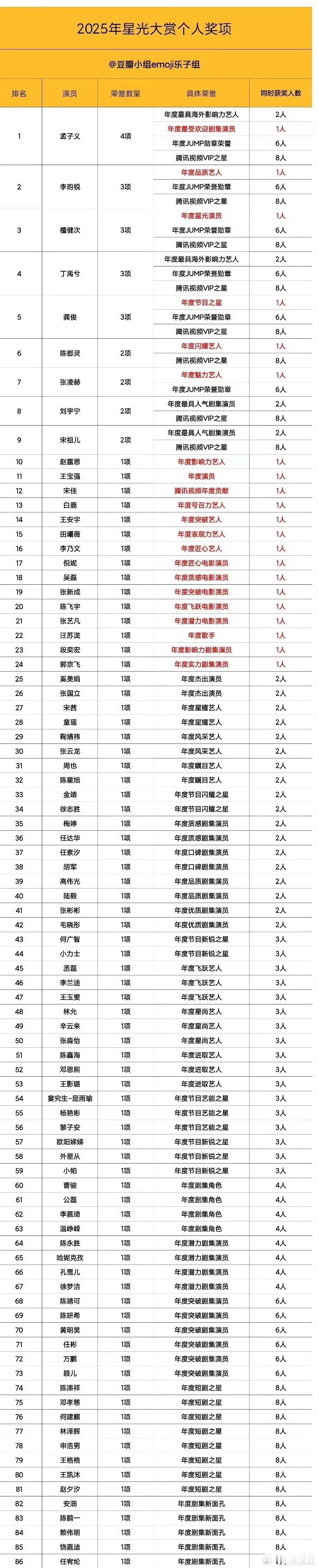 星光大赏个人奖项中,白鹿收获年度飞跃艺人等多项荣誉,事业发展势头迅猛。不断突破的表现,展现中青代艺人的成长潜力。星光大赏个人奖项统计腾讯星光大赏奖项统计