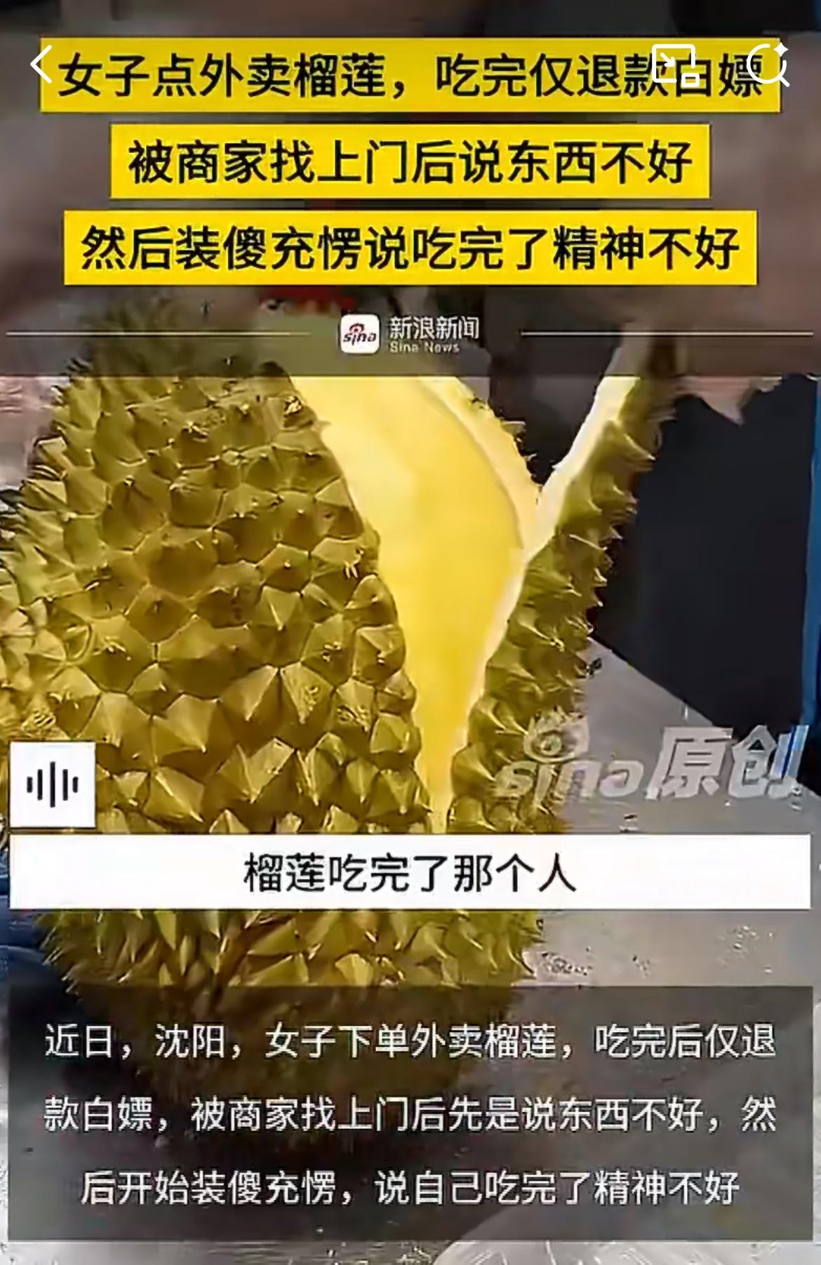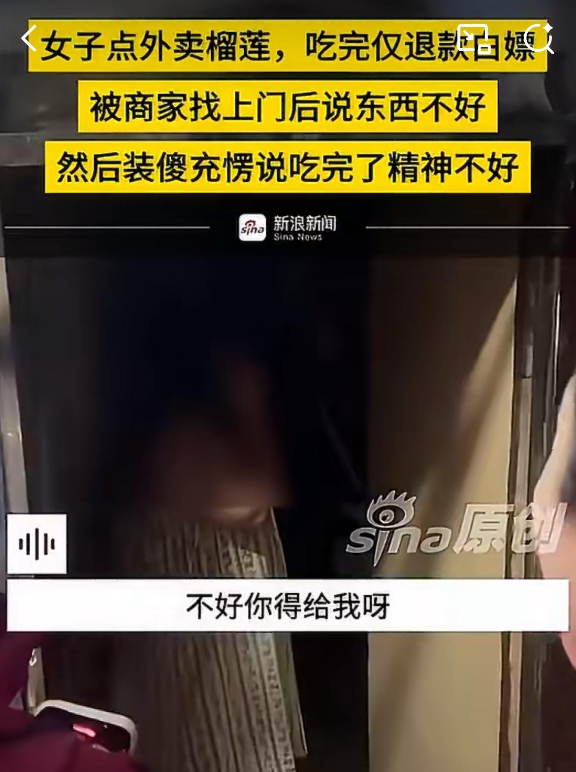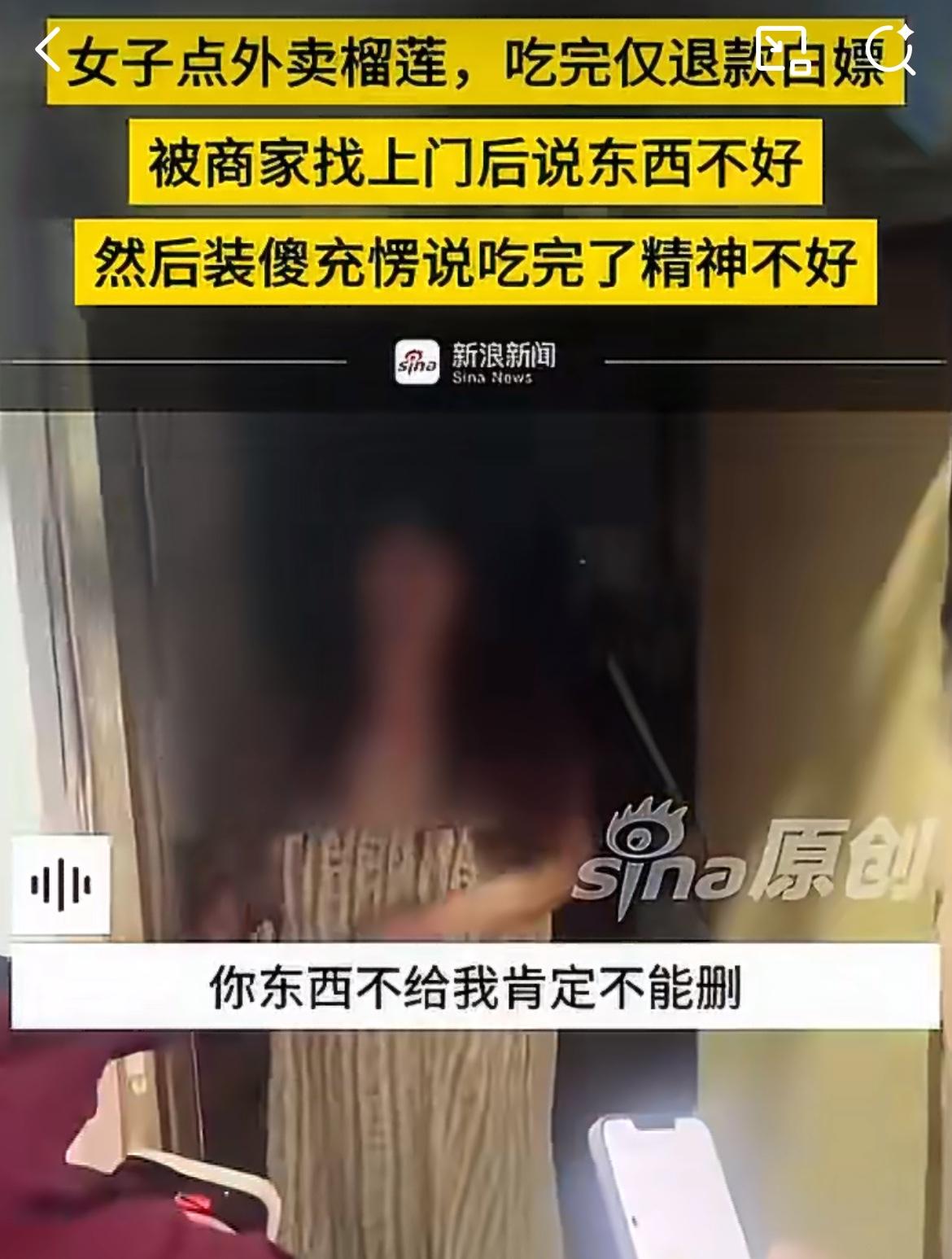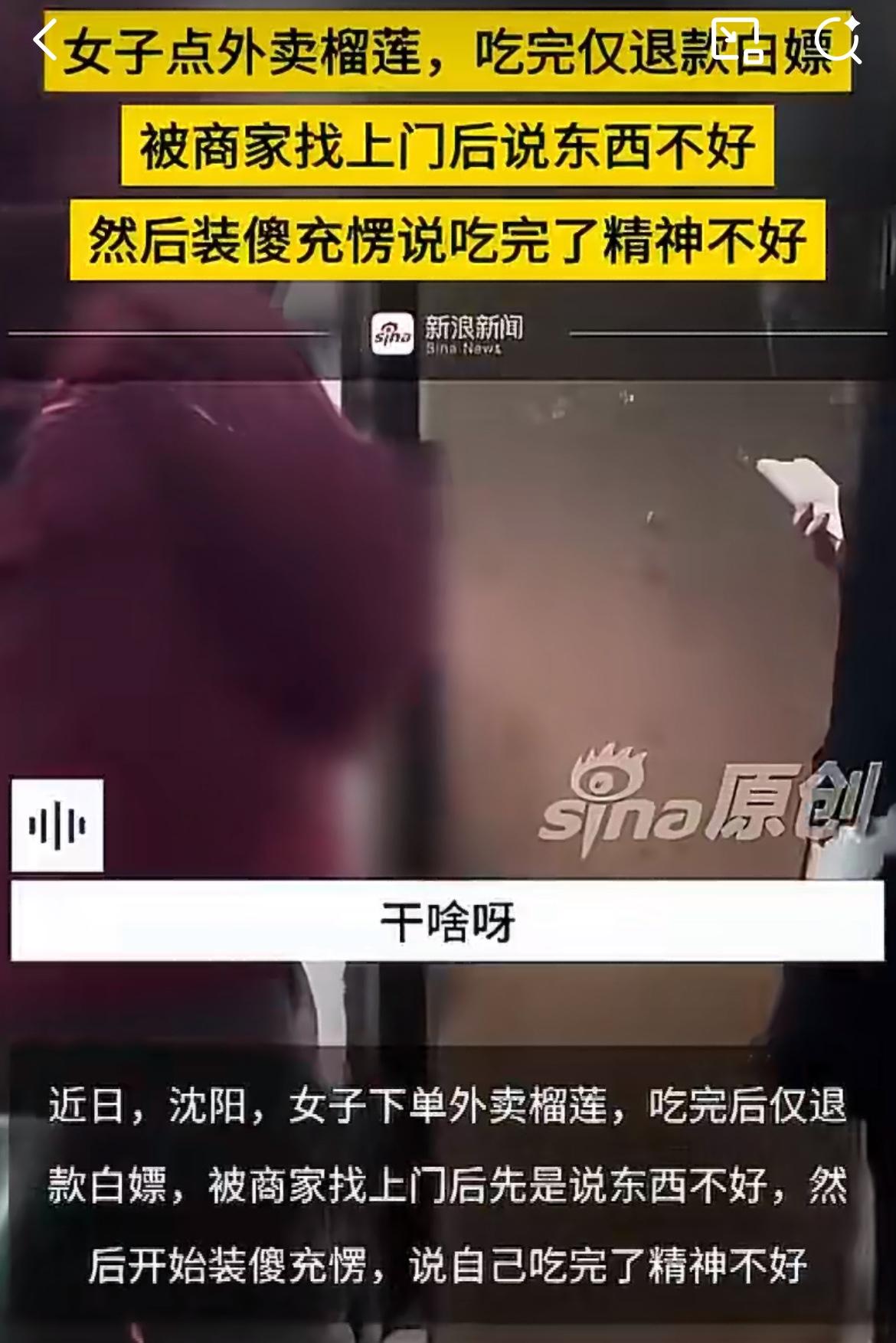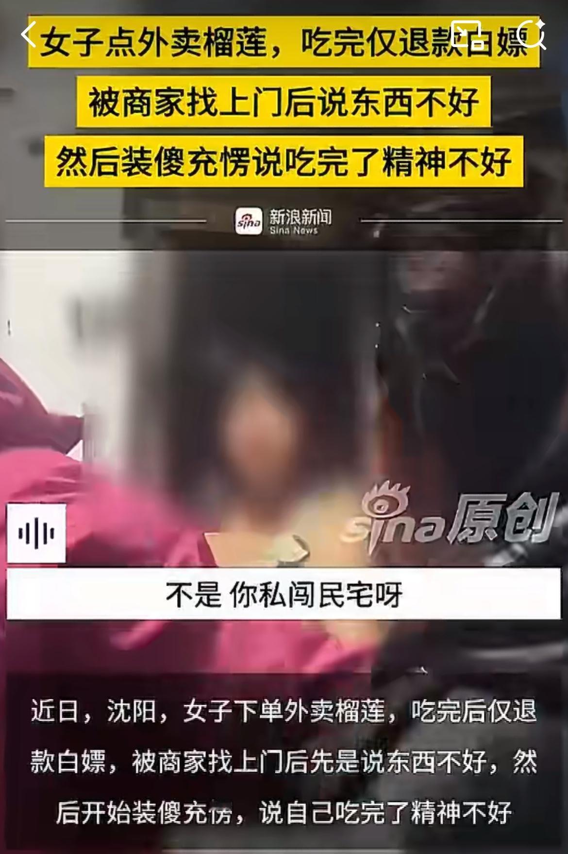 沈阳仙女点榴莲外卖,吃完了说不好吃申请退款。商家找上门,投诉说他们私闯民宅。商家问她榴莲呢?她说没有,可是你已经申请退款了啊。商家说要拍视频曝光她,女子说继续撒泼装糊涂,说自己吃了精神不好,头晕恶心,要找商家索赔精神损失费。东北雨姐退款
