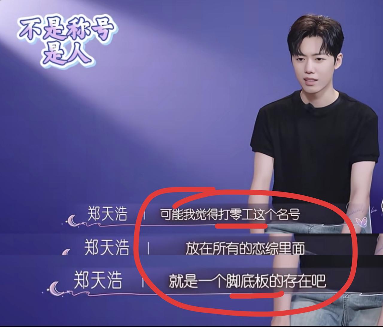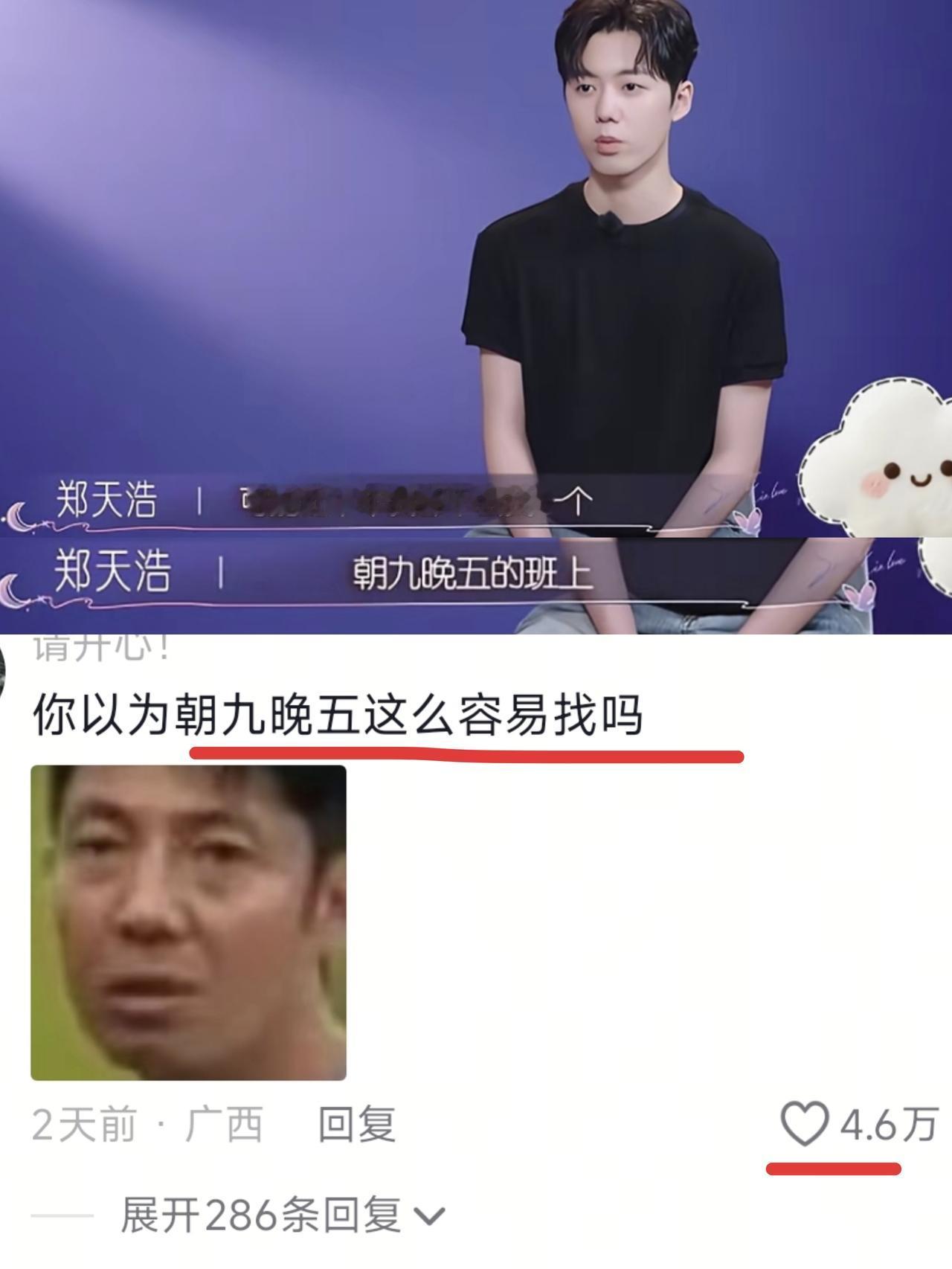 快来看网友都怎么解读《秘密2》郑天浩“不想上班的秘密”,真的太好笑了! 当郑天浩说,他的秘密是不想上班,接下来十年都不会找一个朝九晚五的班上时,网友评价,“你以为朝九晚五的工作那么好找吗?” 以及,网友解读,郑天浩的秘密应该换个说法,把我不想上班改成,我没有工作。 当郑天浩说,一年要挣个几百万时,网友怀疑他干的不是什么正经工作。 当郑天浩说,打零工在恋综节目里是脚底板的存在时,网友回复他,你可真是太棒了!建议和刘子晗锁住! 评论区金句连连,网友真是太有才了!郑天浩原来是《秘密2》的乐子人!