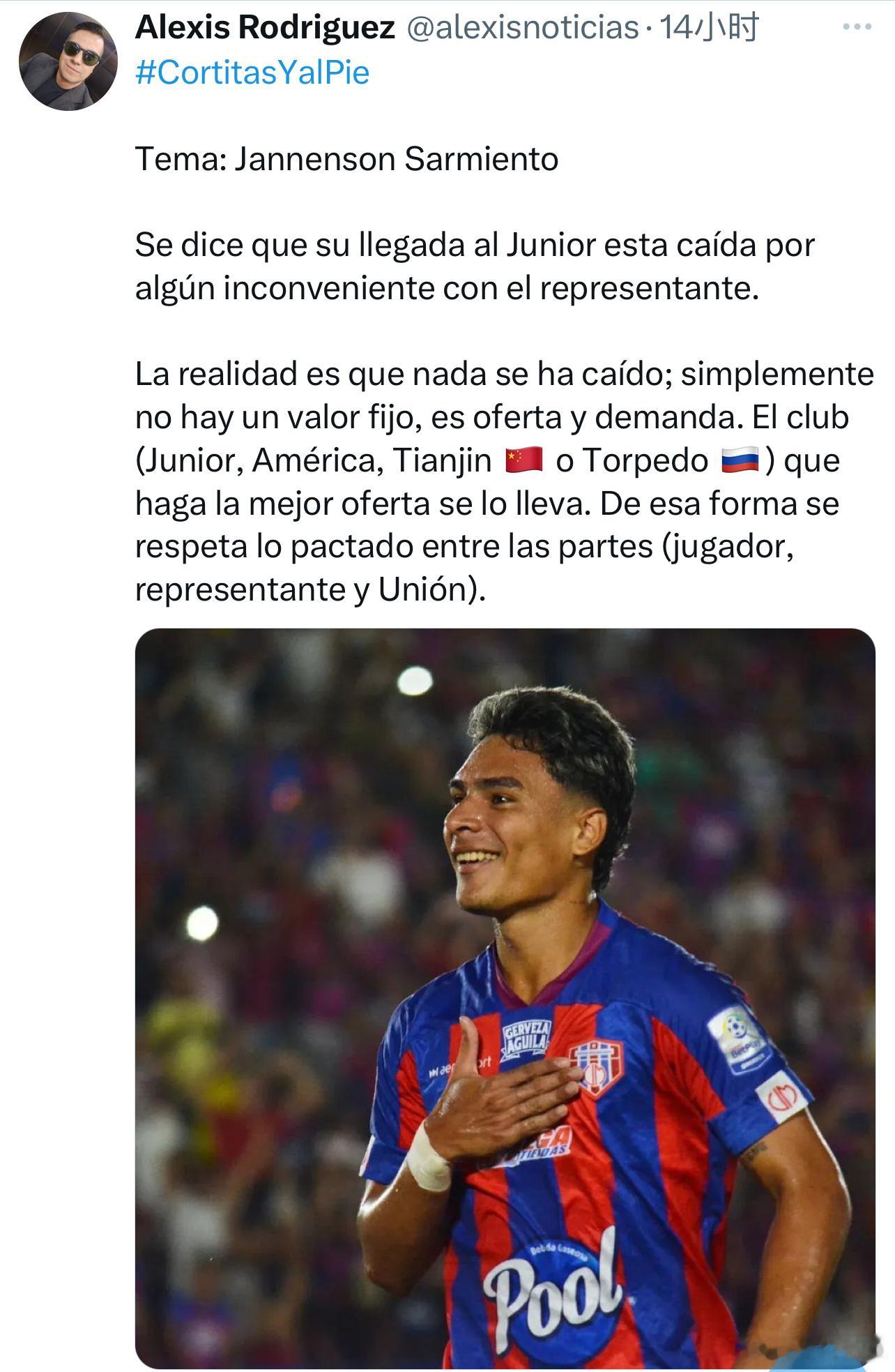 我也是吃瓜🍉哈,从昨天晚上就看见有人发这个哥们啦。dqd上也有了,马上就来劲了。“酒是粮食精,越喝越年轻”(山东口音)但是,大概其这哥们还是要去巴兰基亚青年。一方面,这队明年有解放者杯踢,一方面竞争者和待遇都还不太能,够的上的样子。左图这个记者哥们,当年报过金特罗加盟中超的消息,但是此人一直对华并不友好。纯当🍉吃,没有任何了解哈对了,哥伦比亚讲西班牙语对吧。